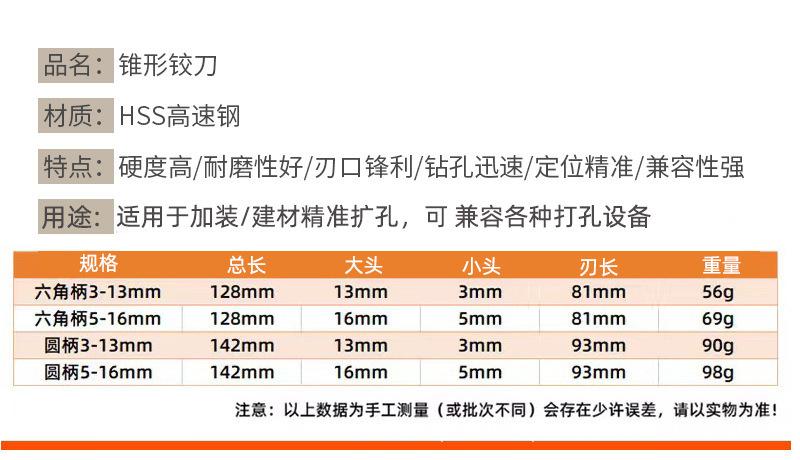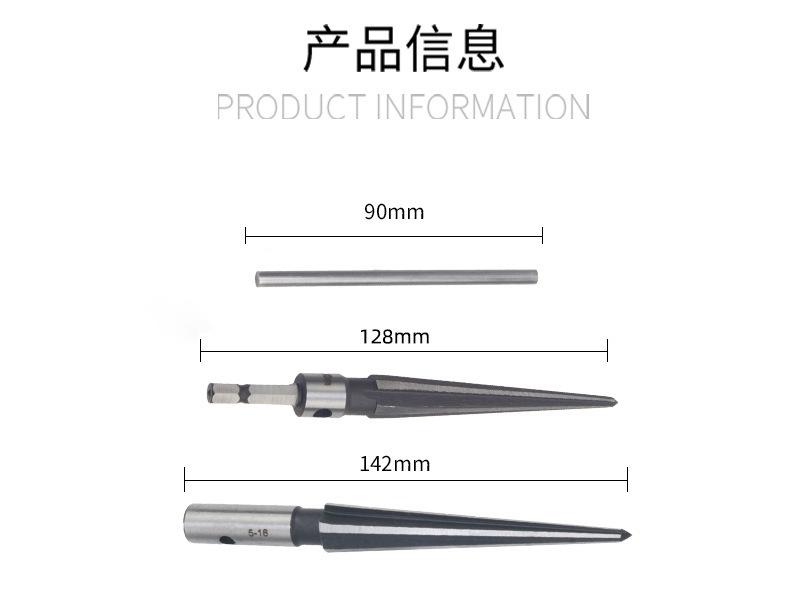 Nombre del producto: Escariador cónicoEmbalaje: embolsadoPeso: Mango redondo pequeño 86g-64-107-71gMaterial: acero 45300 juegos/cajaTamaño de la caja: 35*25*15CM