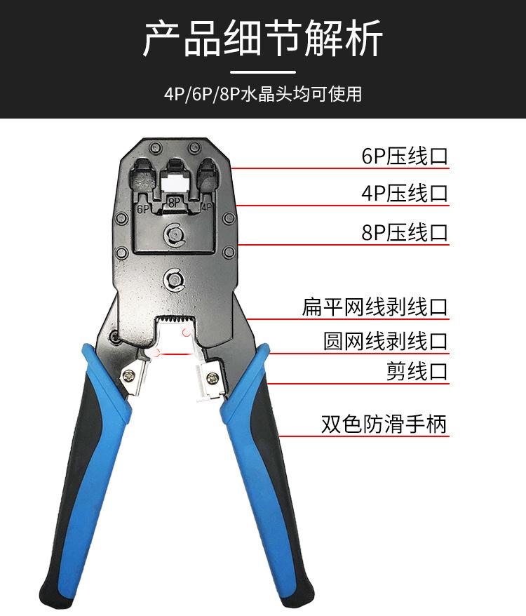Fangbei Alicates Multifuncionales Rápidos Manuales de Crimpado Rj45 Corte y Pelado Conector Perforado Cabeza de Cristal 4P6P8P Cable de Red