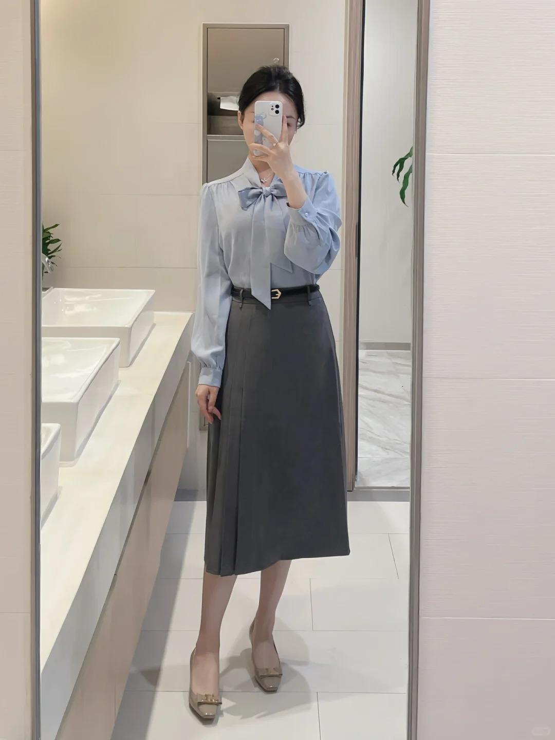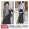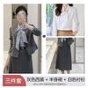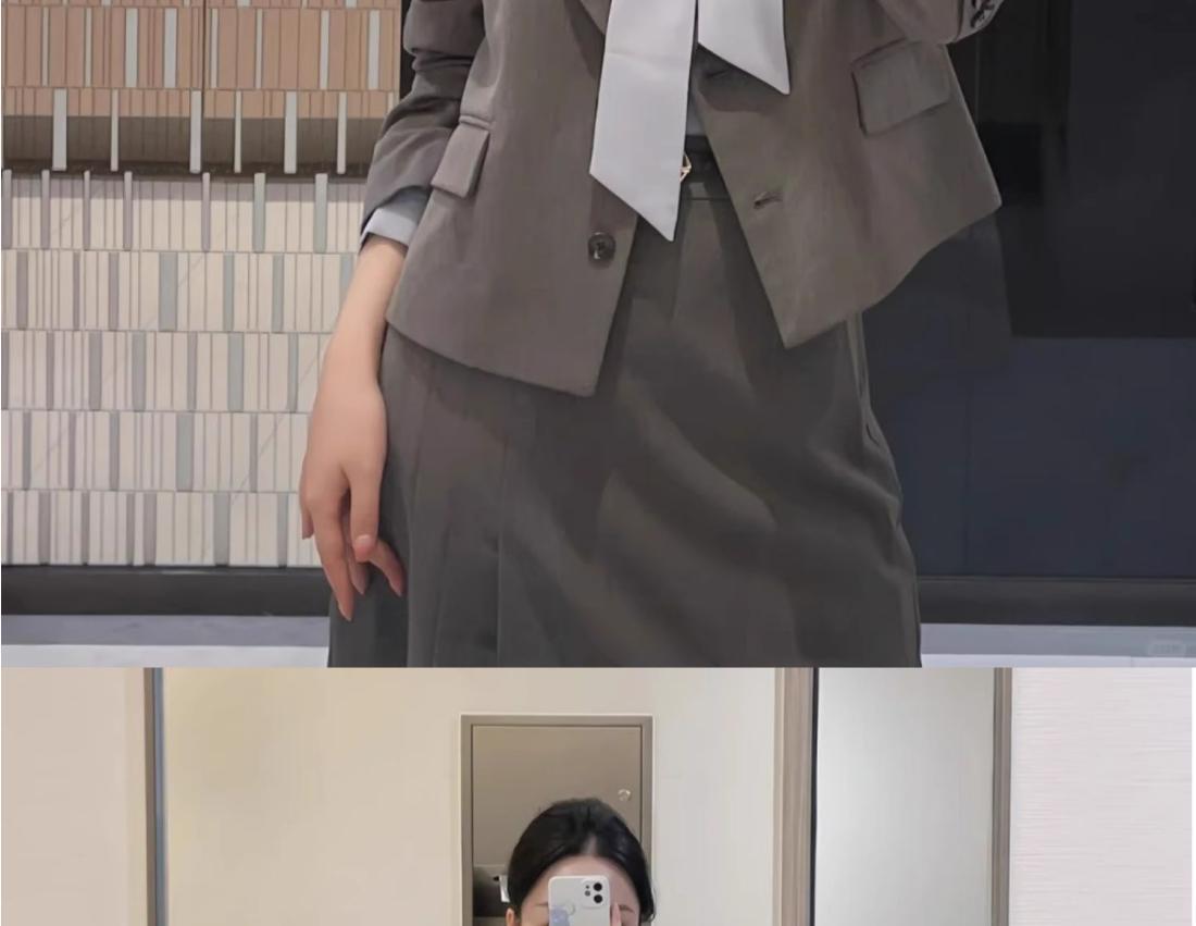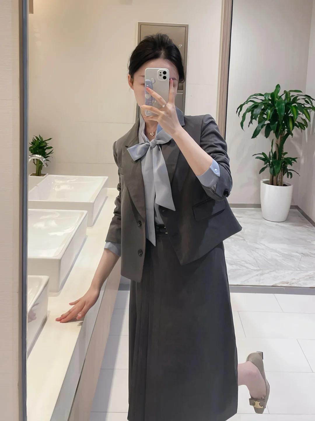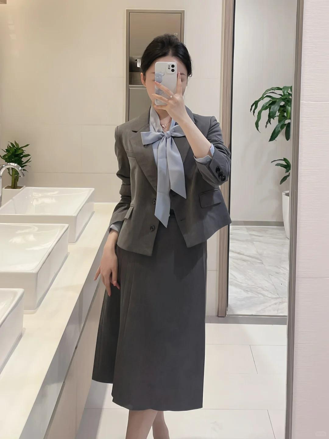Gray suit + skirt, Gray suit + skirt + gray shirt, Gray suit + skirt + white shirt, Single gray shirt, Single ...