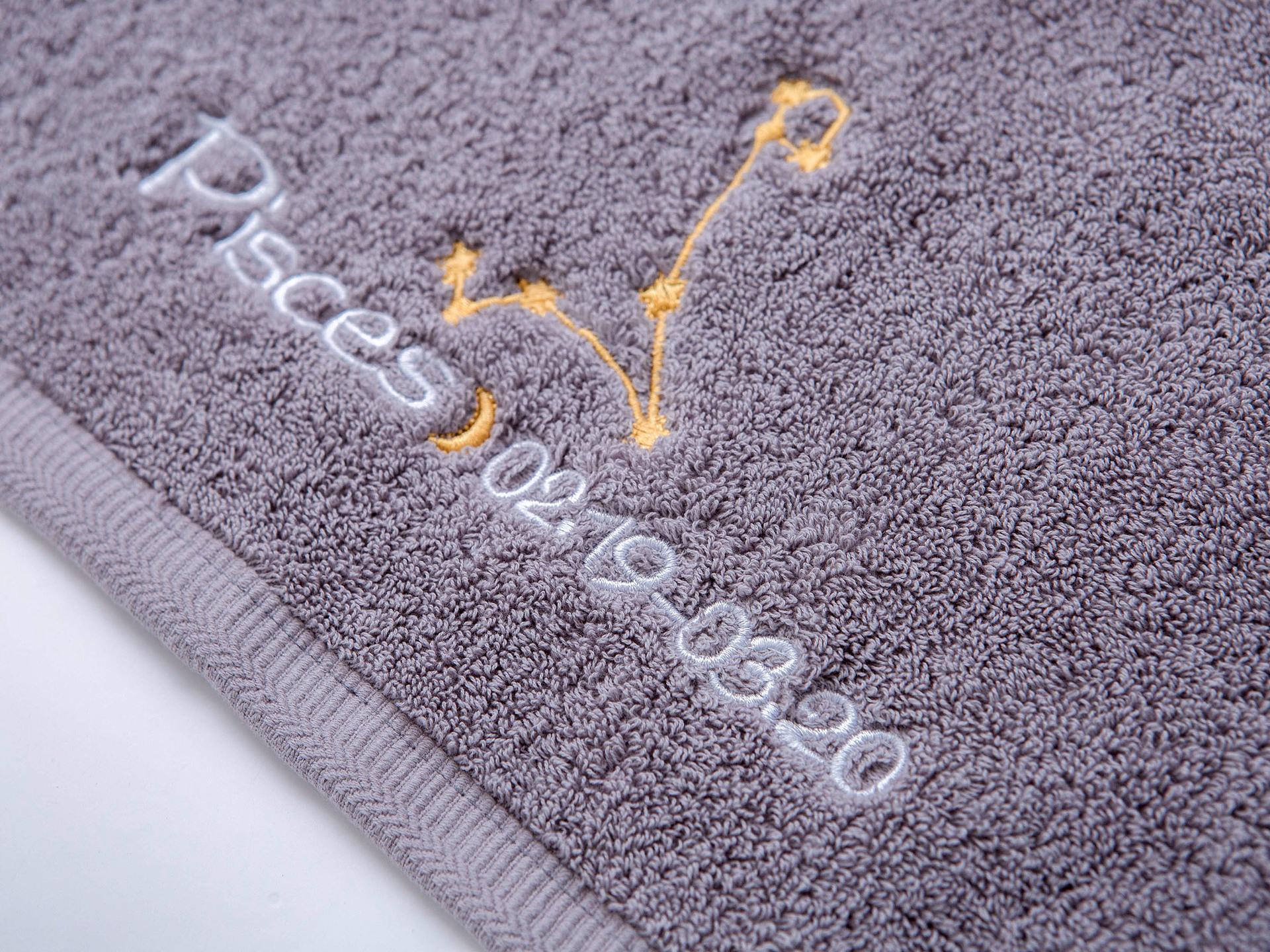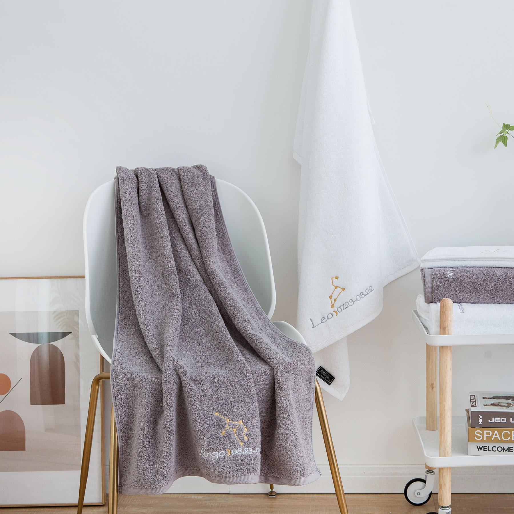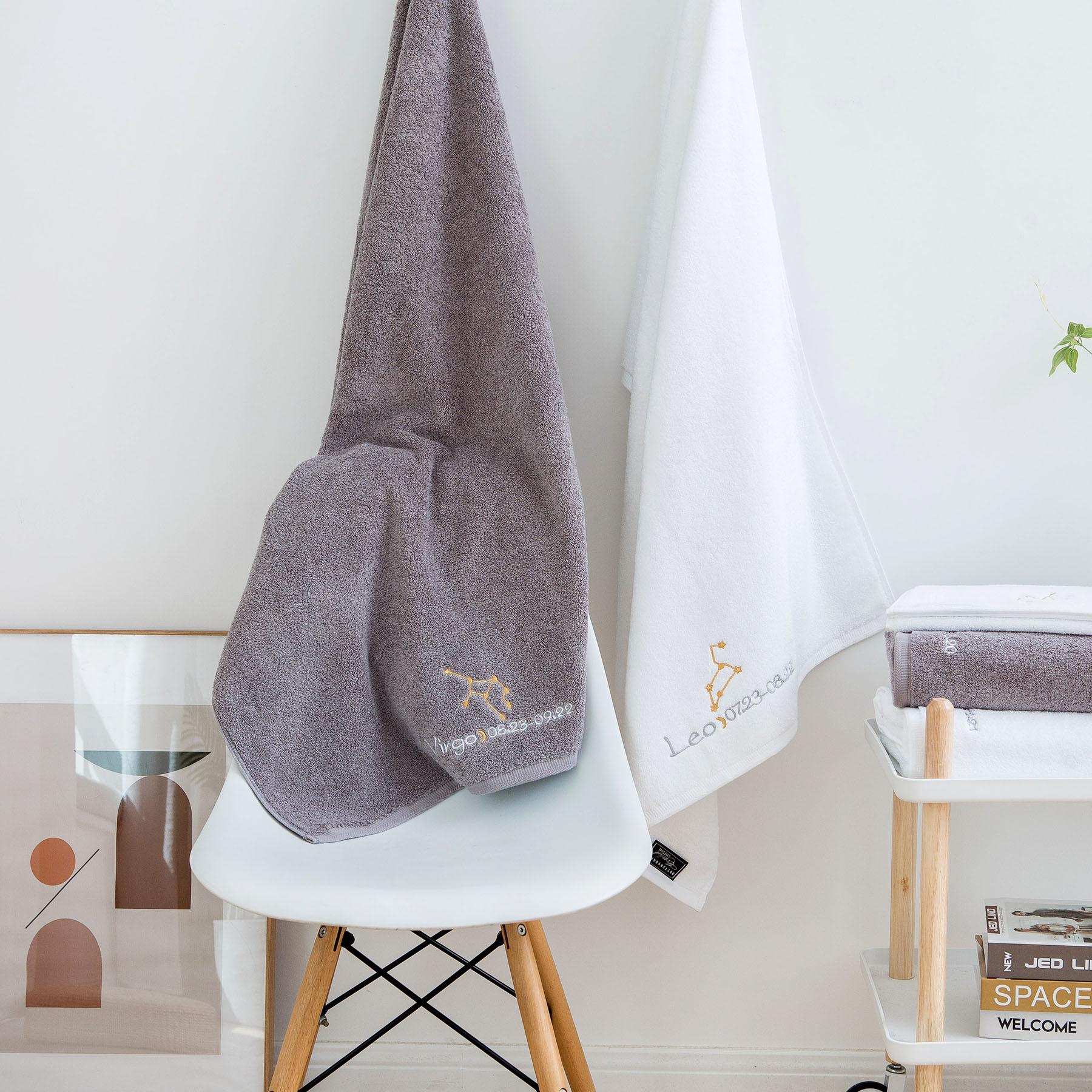 Puntos de venta del producto:Esta toalla de baño de la serie de los 12 signos del zodiaco está hecha de algodón pakistaní, con buena absorción de agua y suavidad. Es ecológica, está impresa con tecnología de pulido y no se decolora. El exquisito bordado del zodiaco es el toque final de esta toalla. El patrón del bordado está compuesto por las 12 constelaciones del zodiaco, sus nombres en inglés, la luna y sus fechas correspondientes. Es hermosa y tiene un significado muy exclusivo. Los clásicos blanco y gris se utilizan en la selección de colores, ideal para una amplia gama de personas.
