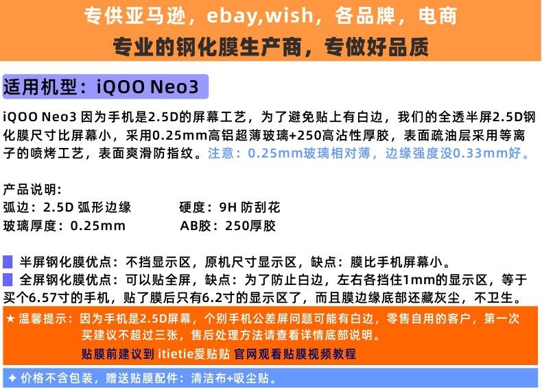 Aplicable a iQOO Neo3 película templada, película protectora de vidrio antihuellas no de cobertura total