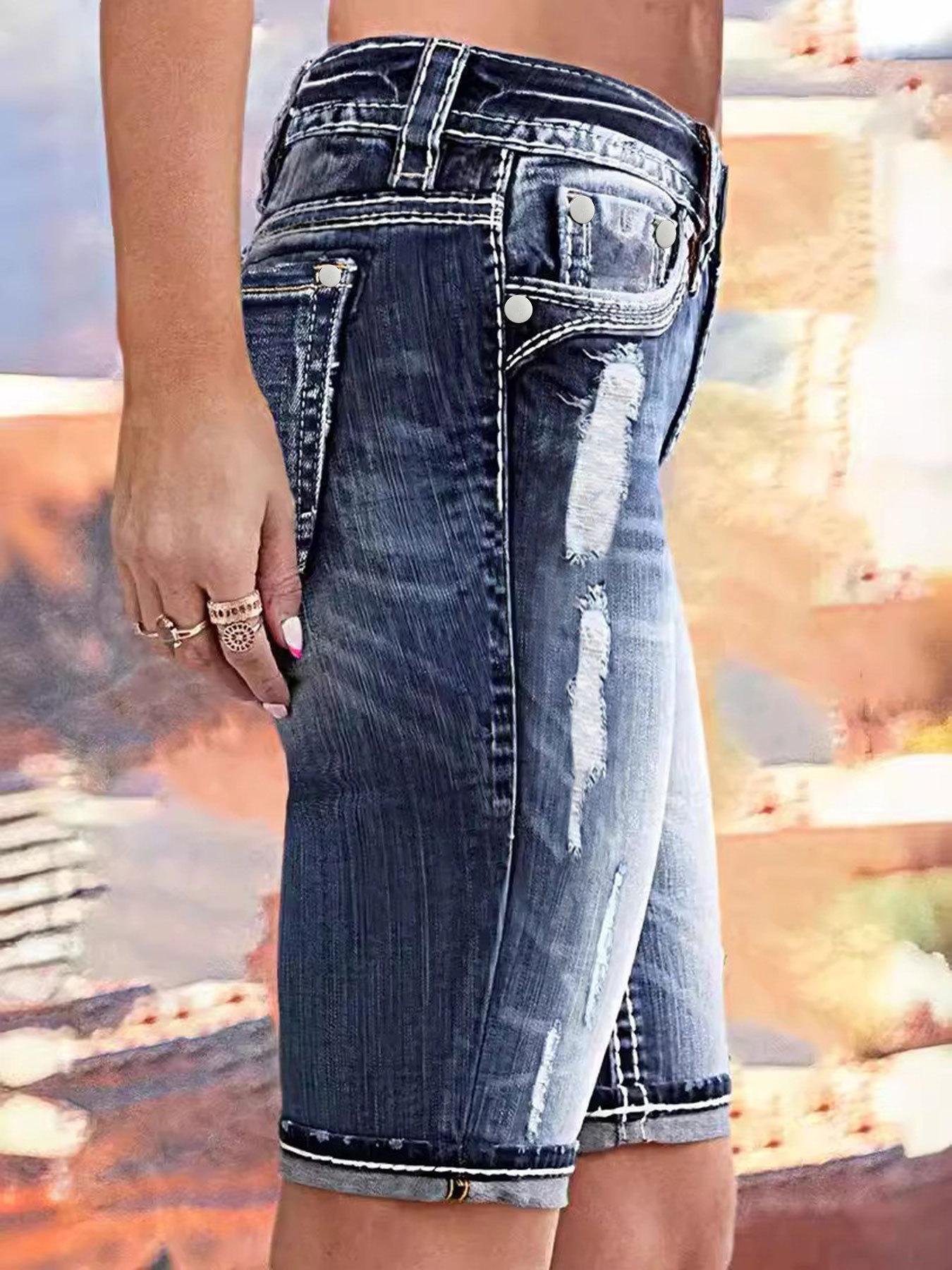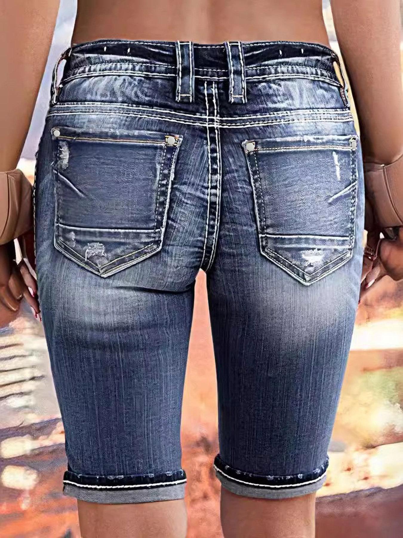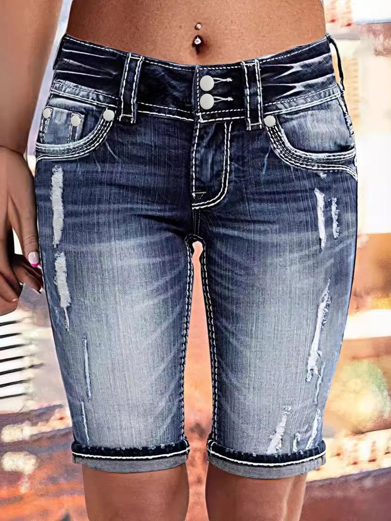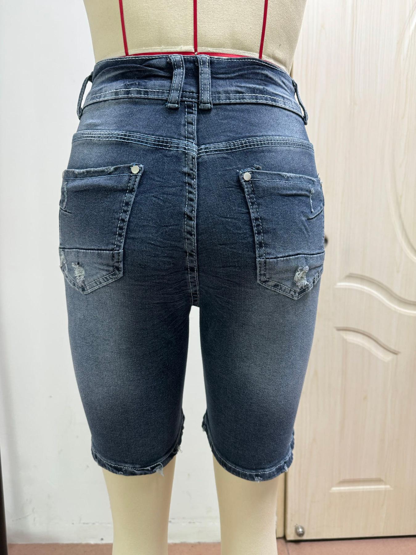 Ropa Europea y Americana Transfronteriza Estación Independiente de Amazon Denim Pantalones Medios Lavados Rotos Jeans Elásticos para Mujer Tendencia Urbana