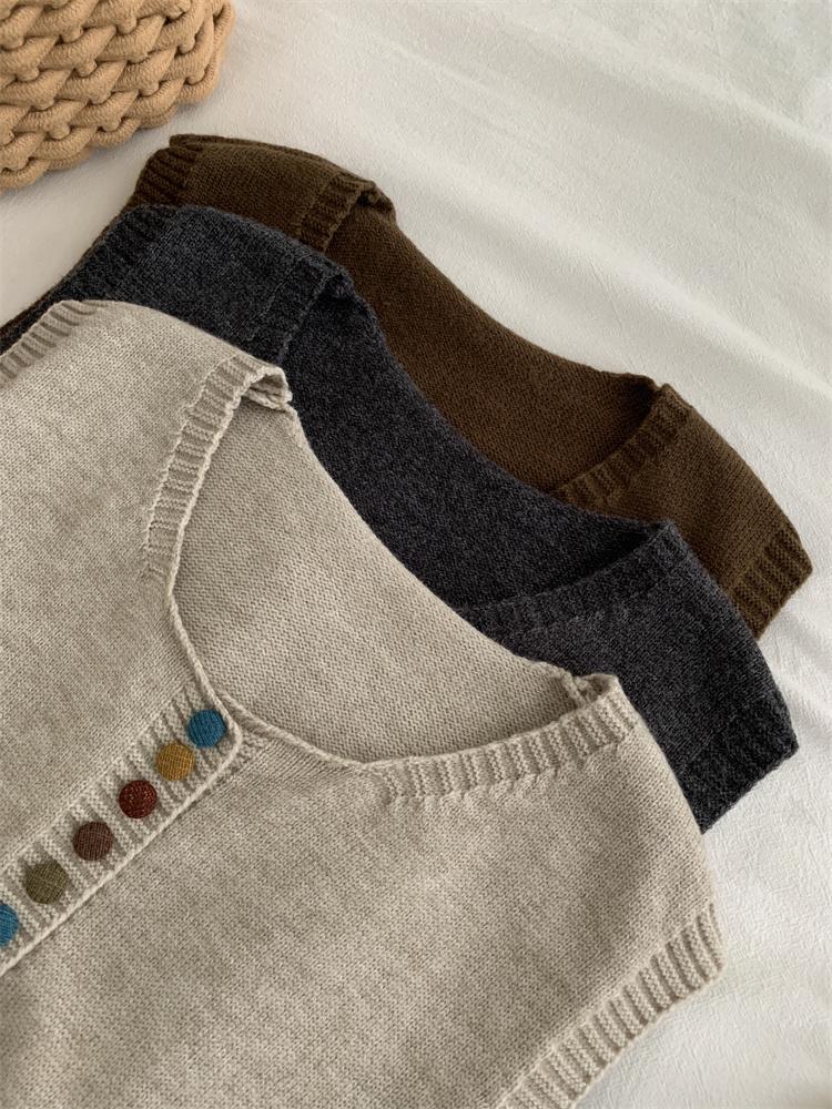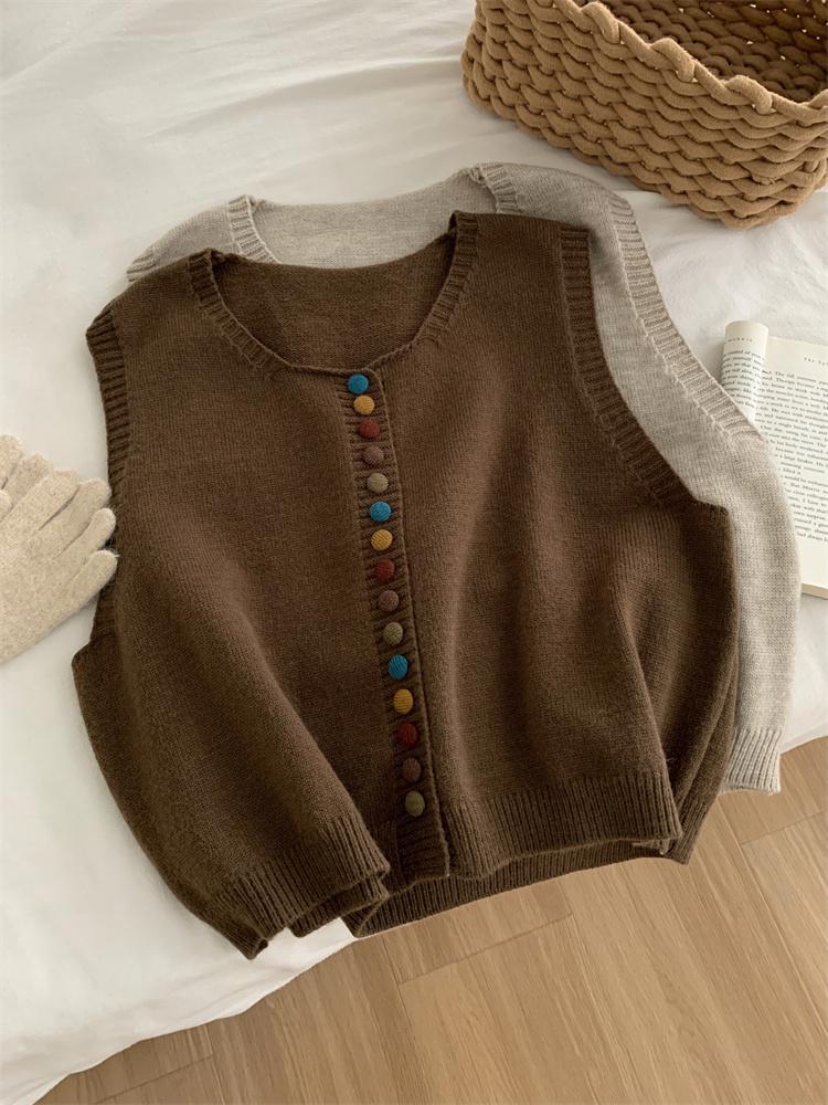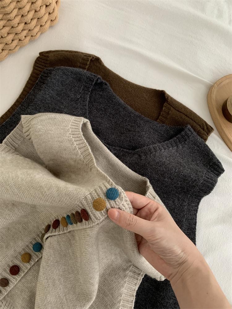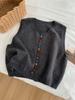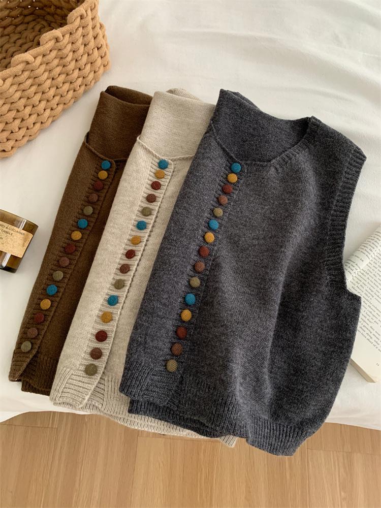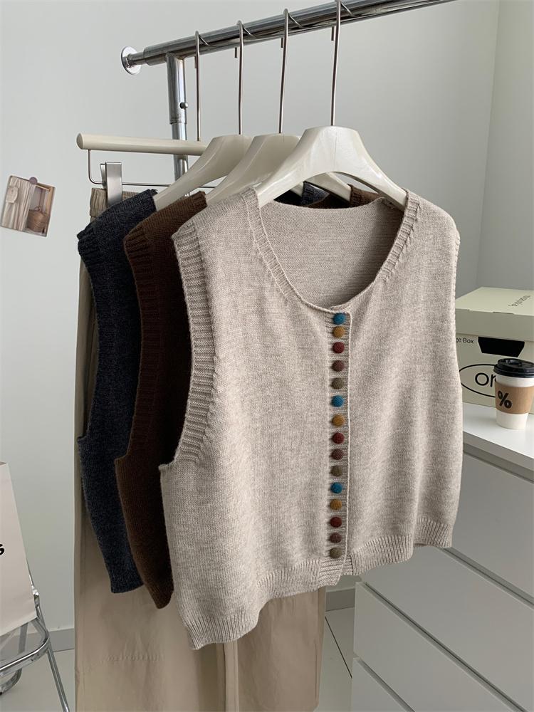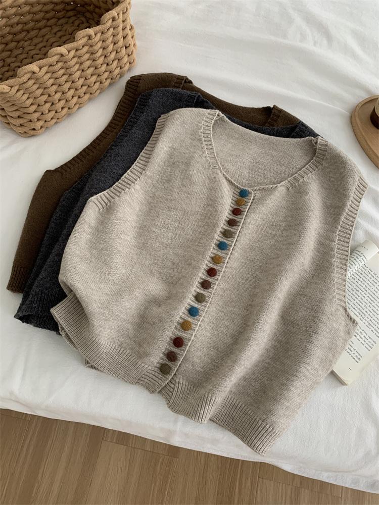 Chaleco de punto con cuello redondo y hebilla de color retro estilo coreano para mujer, cárdigan sin mangas apilado de otoño e invierno, chaleco tipo suéter antiedad que combina con todo.