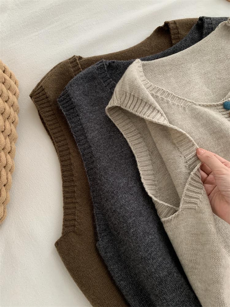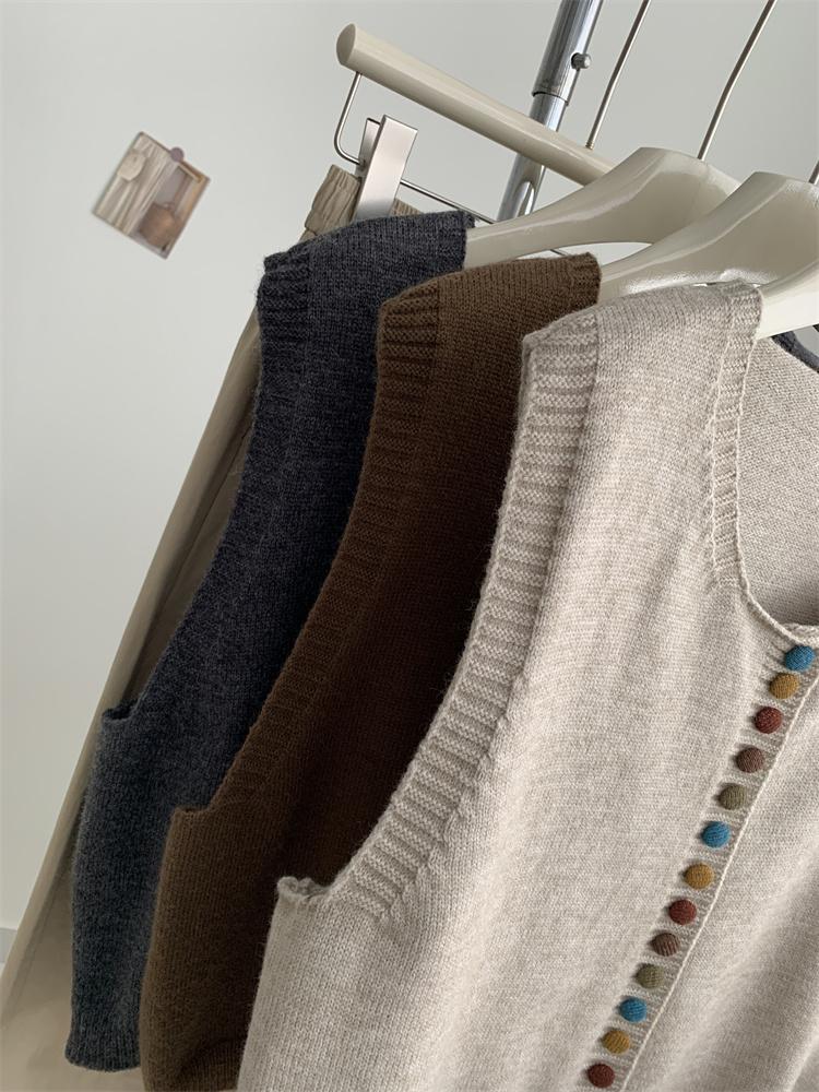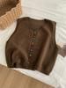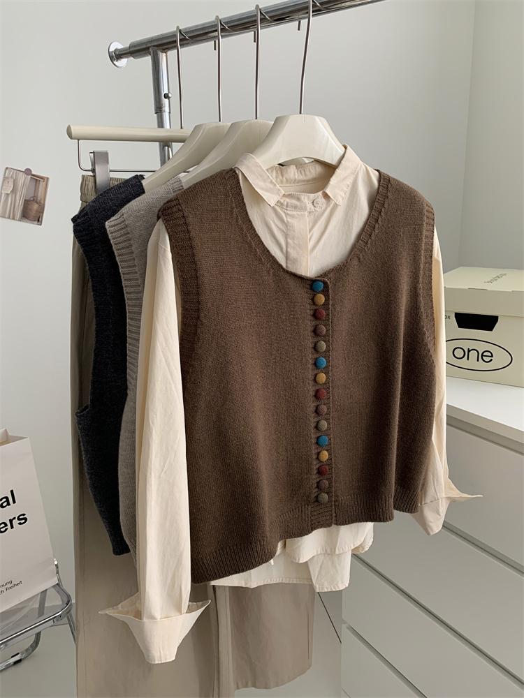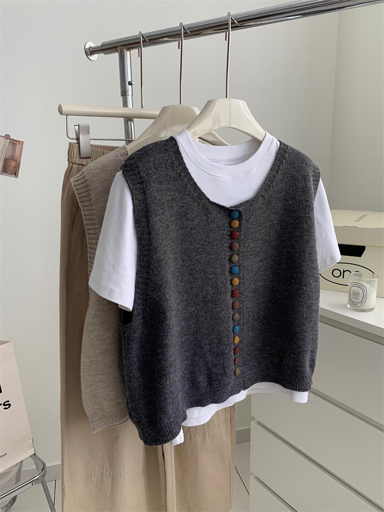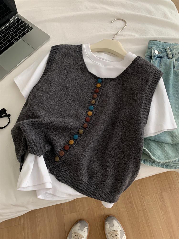 Chaleco de punto con cuello redondo y hebilla de color retro estilo coreano para mujer, cárdigan sin mangas apilado de otoño e invierno, chaleco tipo suéter antiedad que combina con todo.