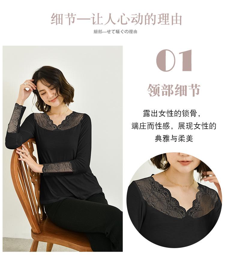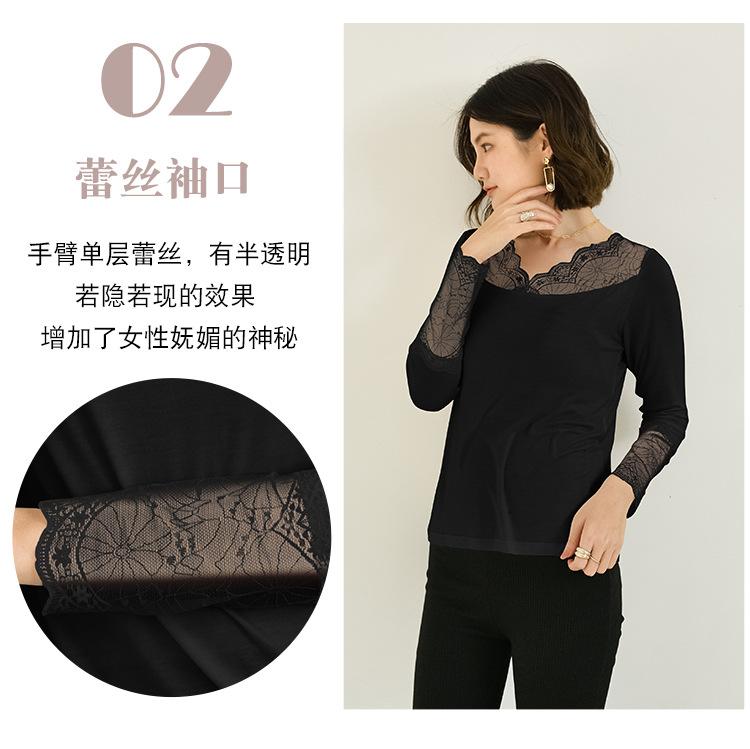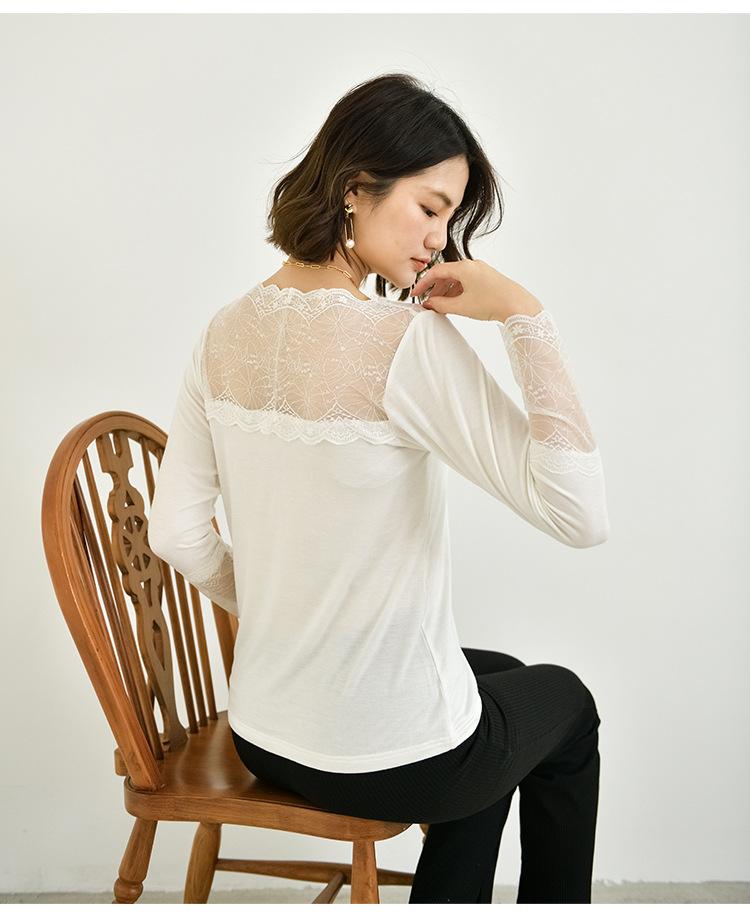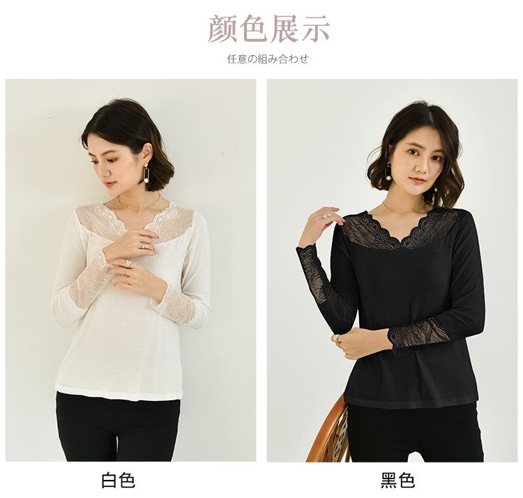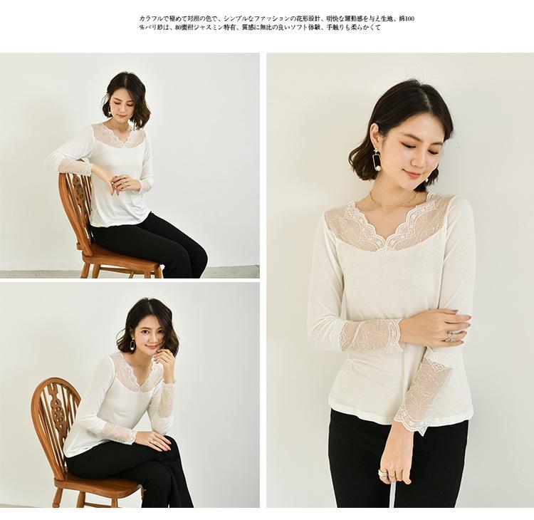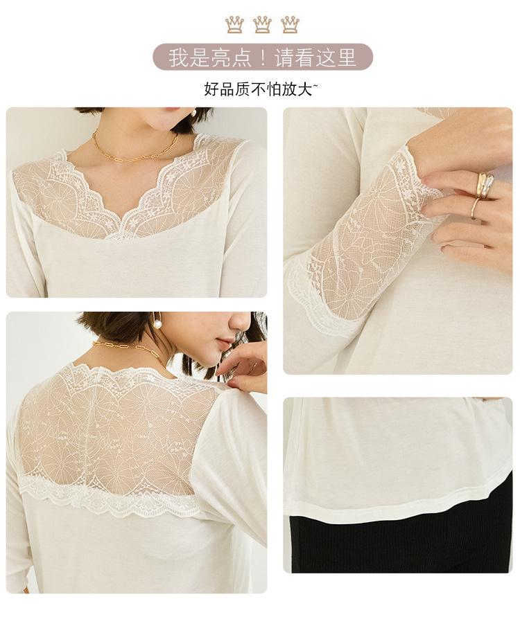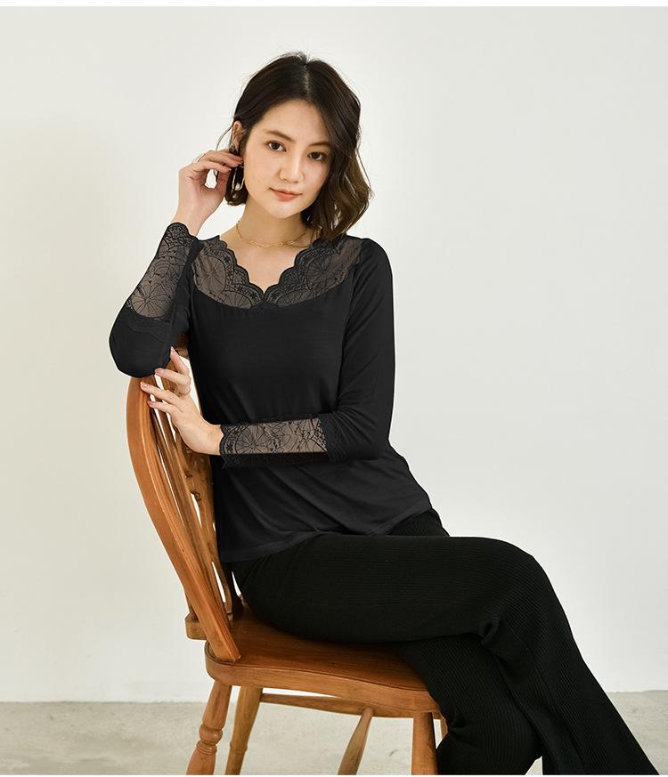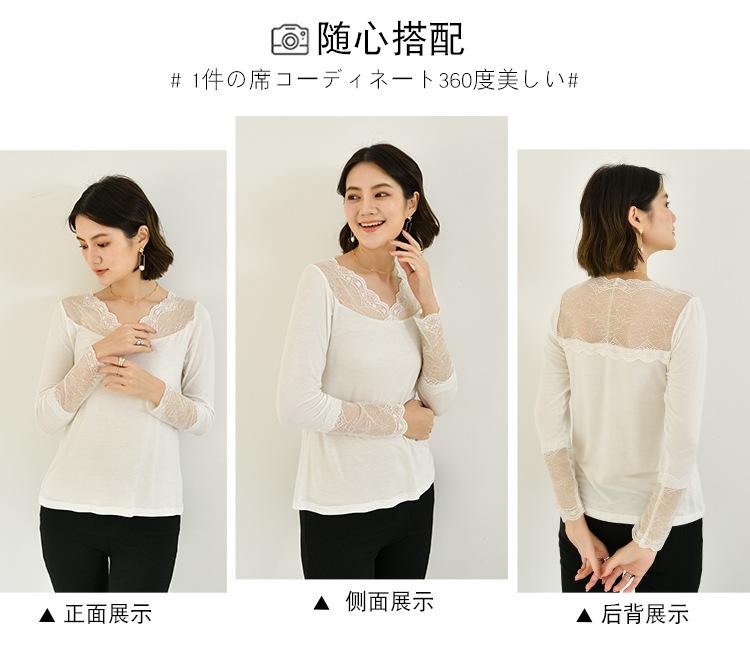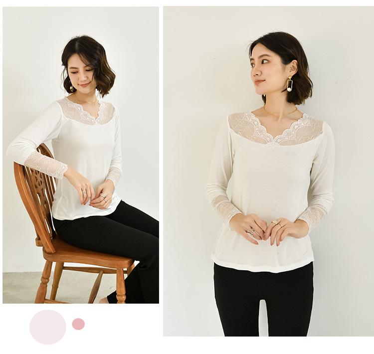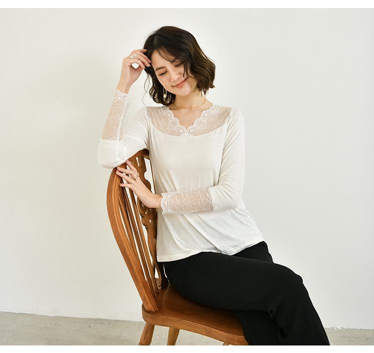 Camiseta elegante de manga larga estilo coreano de primavera y verano con costuras de encaje y base modal, blusa de mujer con cuello en V, color liso, combinable con todo.