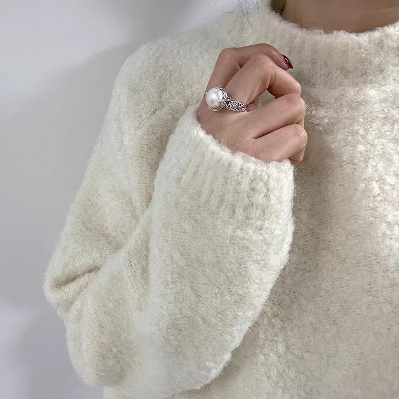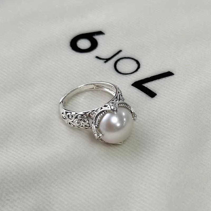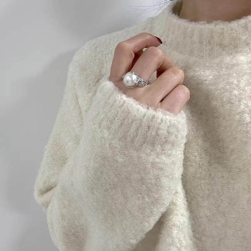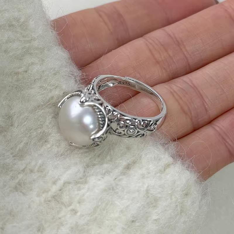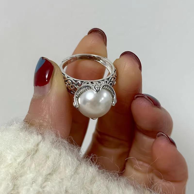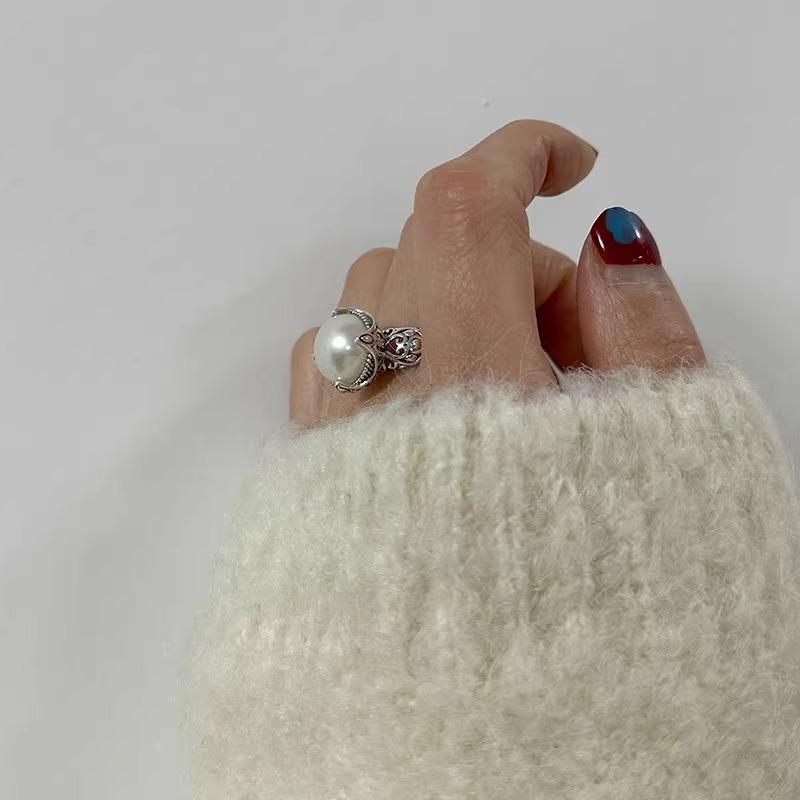 Anillo de perlas retro de nicho envejecido para mujer, moda, personalidad, temperamento, estilo chino, flor hueca, anillo abierto para el dedo índice