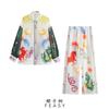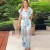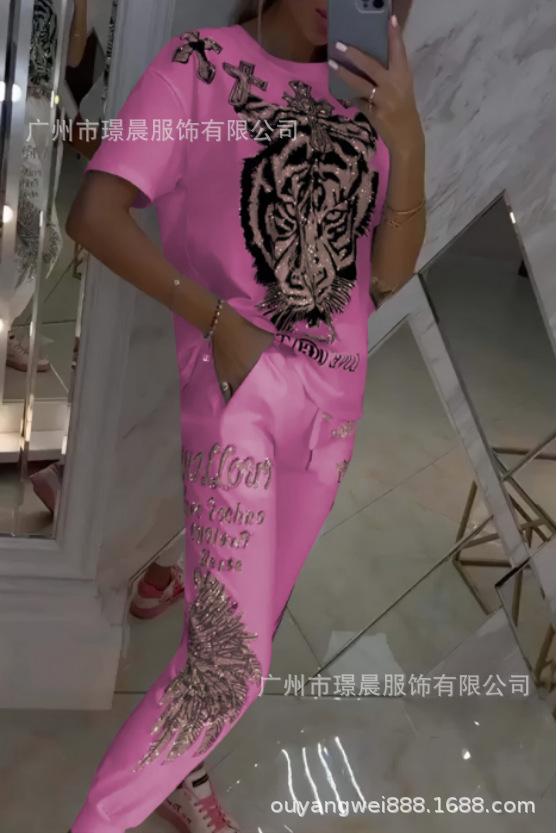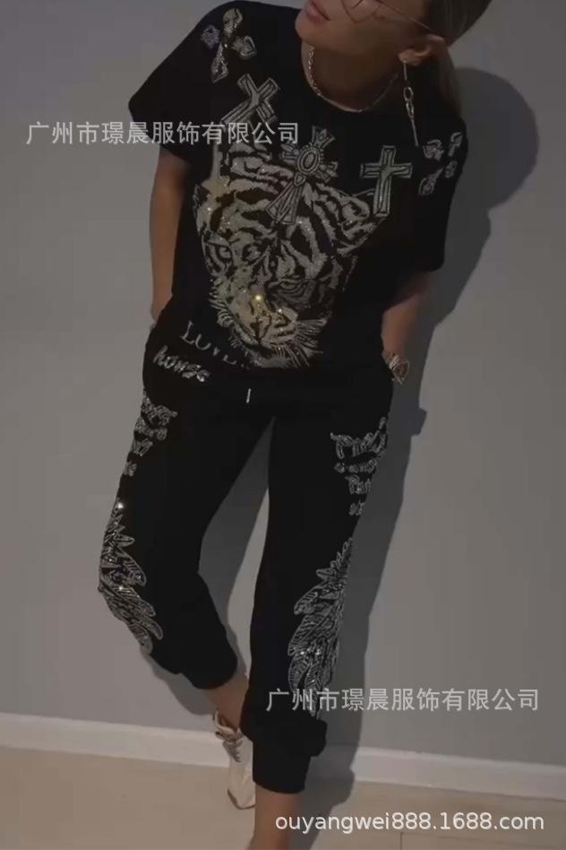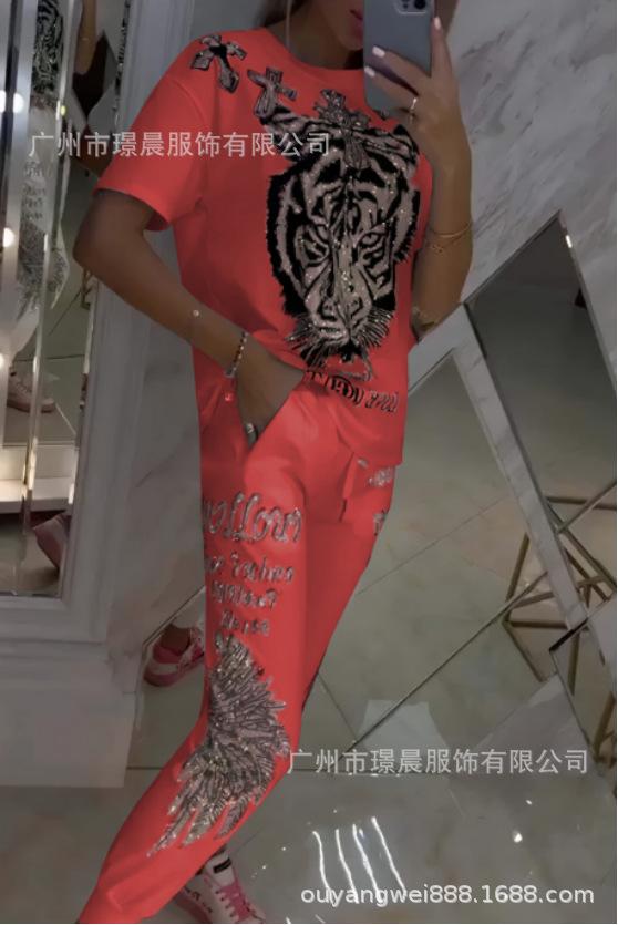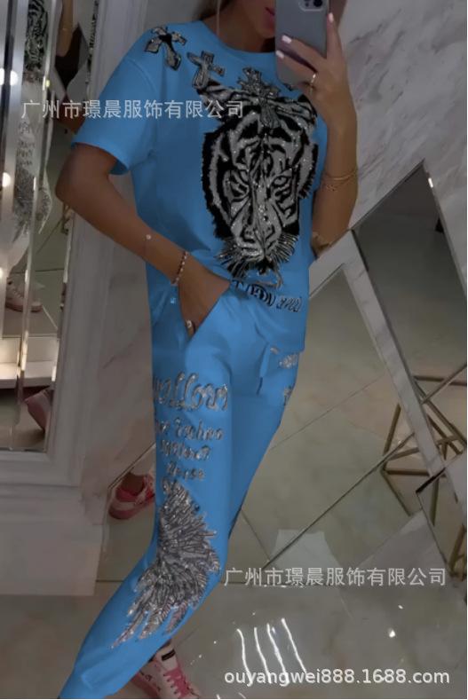 Conjunto de dos piezas de pantalones de manga corta con cuello redondo y estampado de comercio exterior transfronterizo para mujer de Amazon 2024