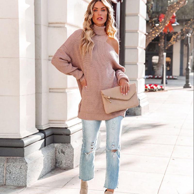 Suéteres Europeos y Americanos de Otoño e Invierno Holgados de Manga Larga Amazon Transfronterizo Sexy con Solapa y Hombros Descubiertos Suéteres Pulóver para Mujer Largo Medio