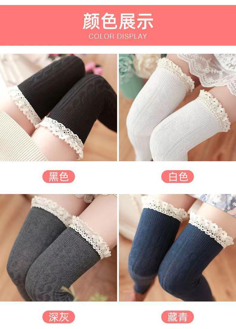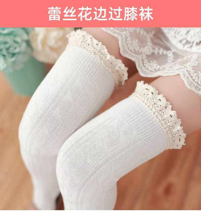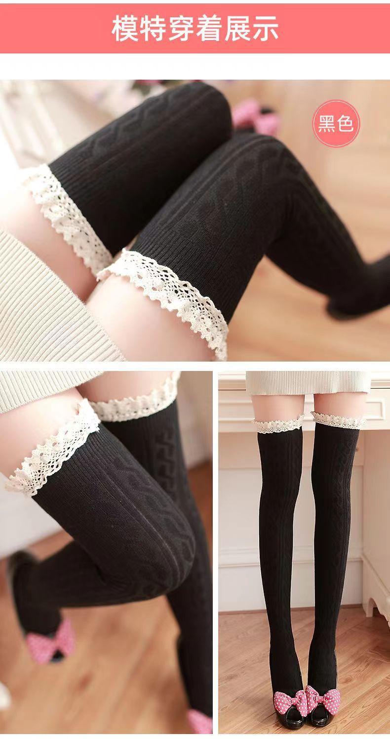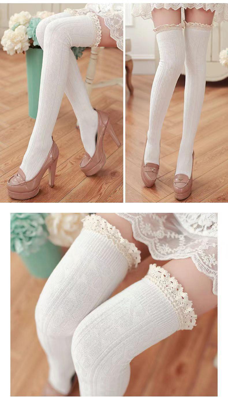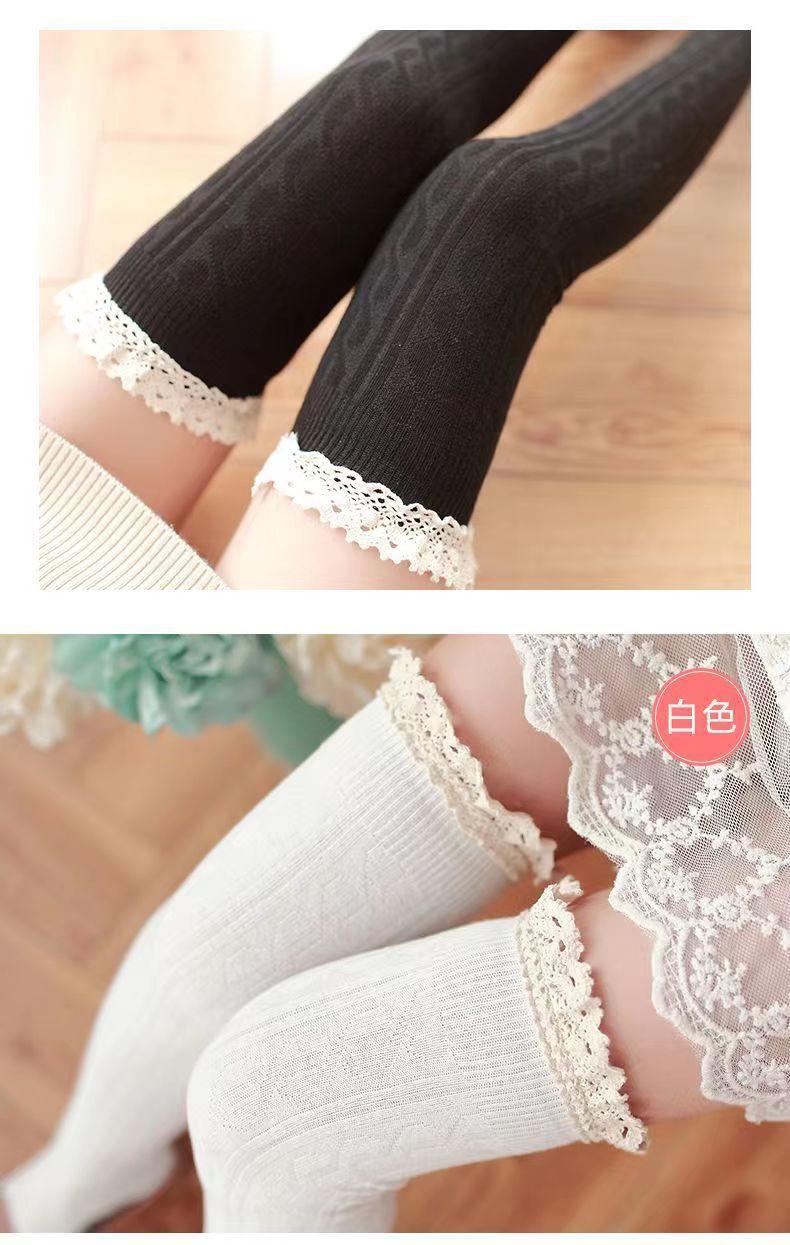 Calcetines hasta la rodilla estilo Lolita con giro japonés de primavera y otoño para niña, bonitos calcetines largos hasta la rodilla con encaje blanco y negro.