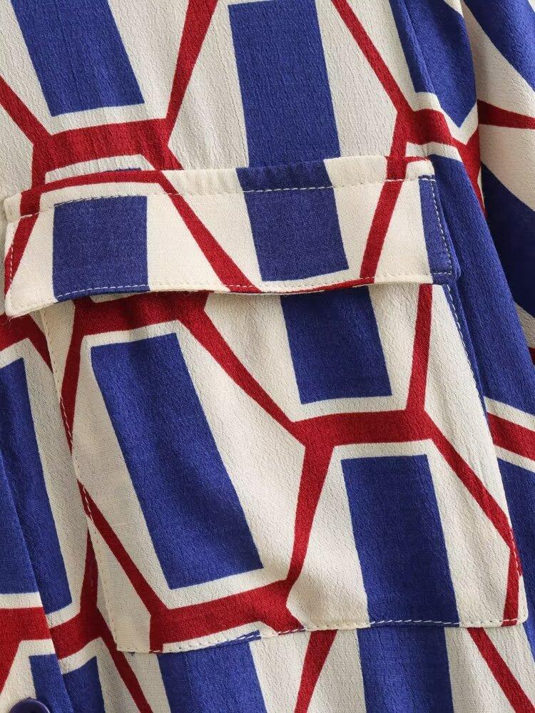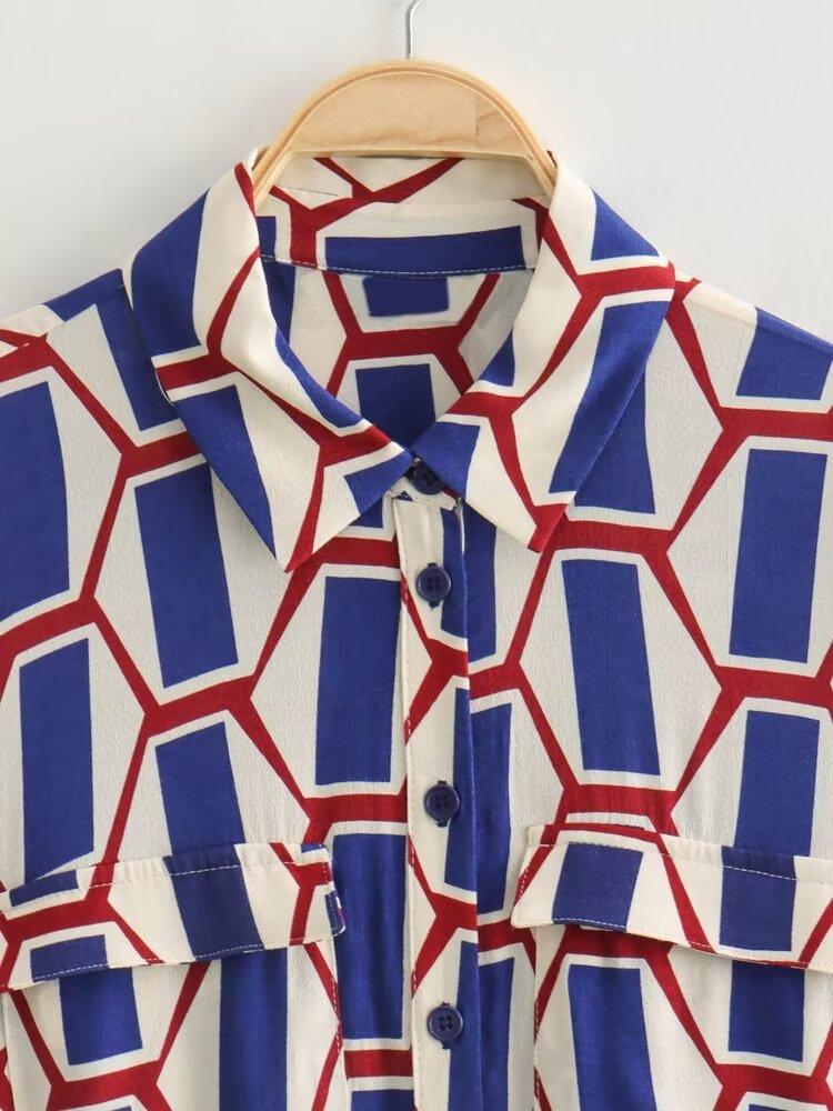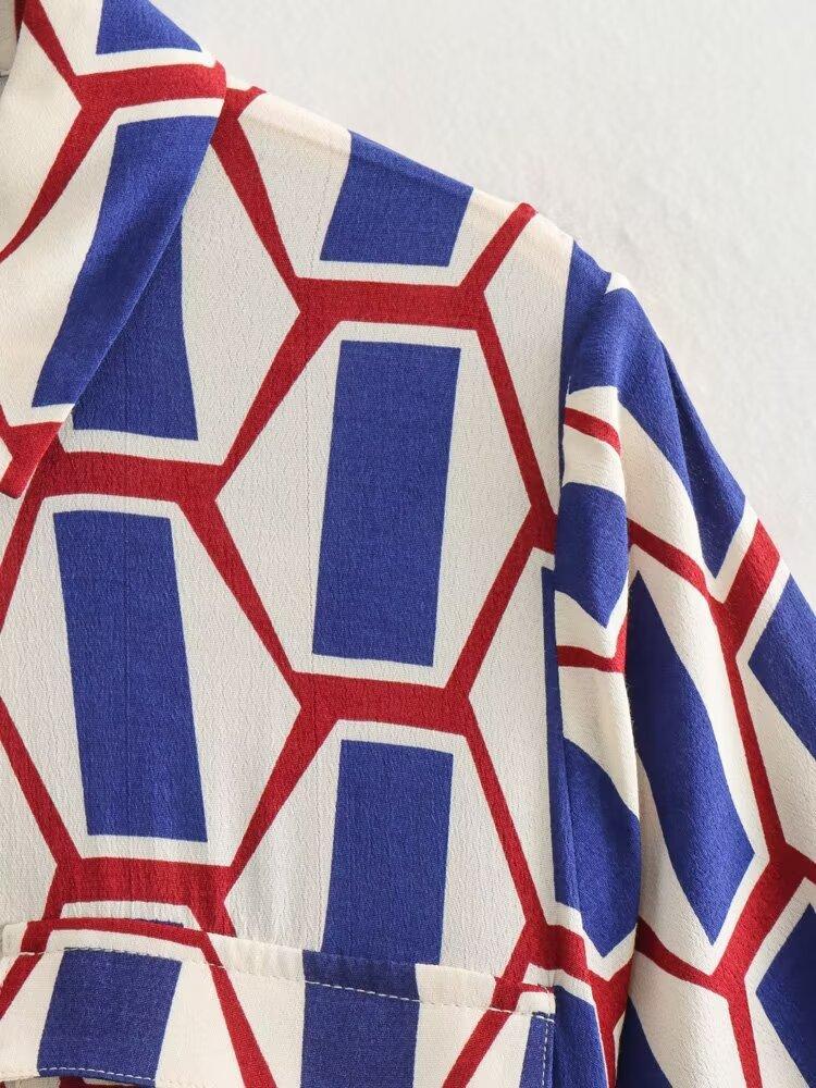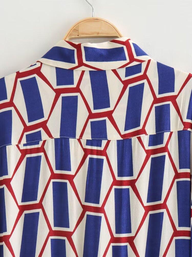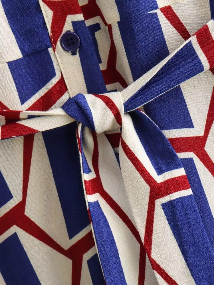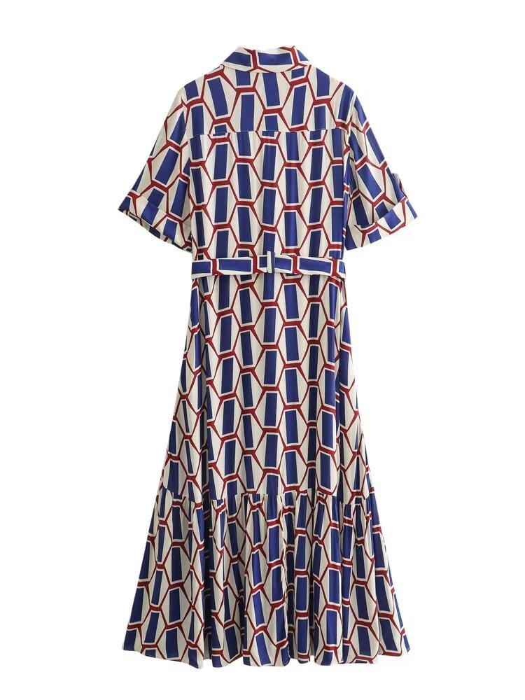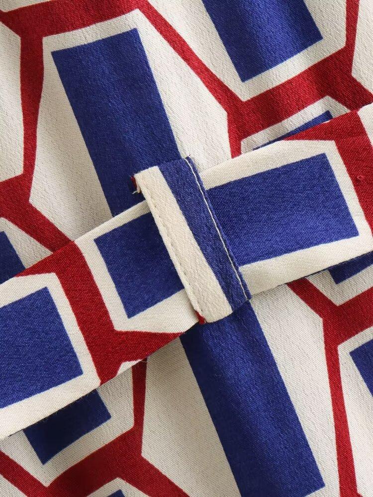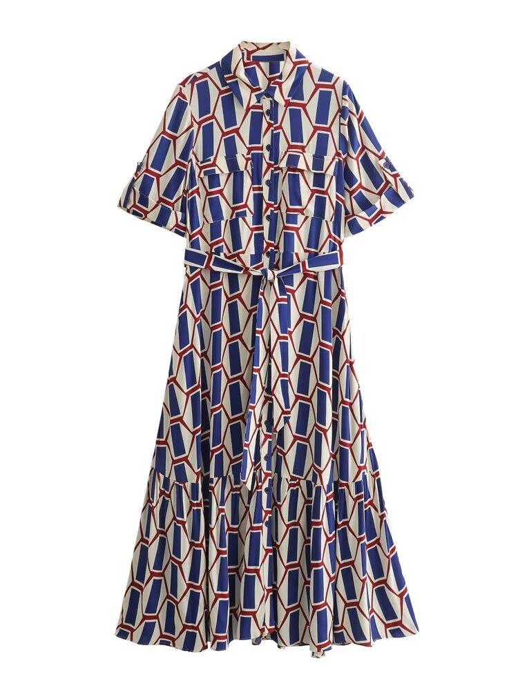 Vestido camisero con cinturón y solapa de manga larga con estampado geométrico, estilo europeo y americano, para mujer, verano 2024