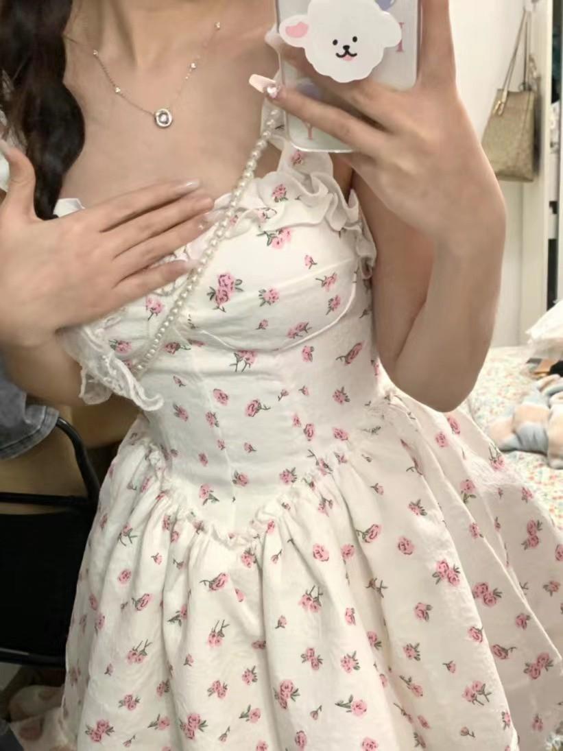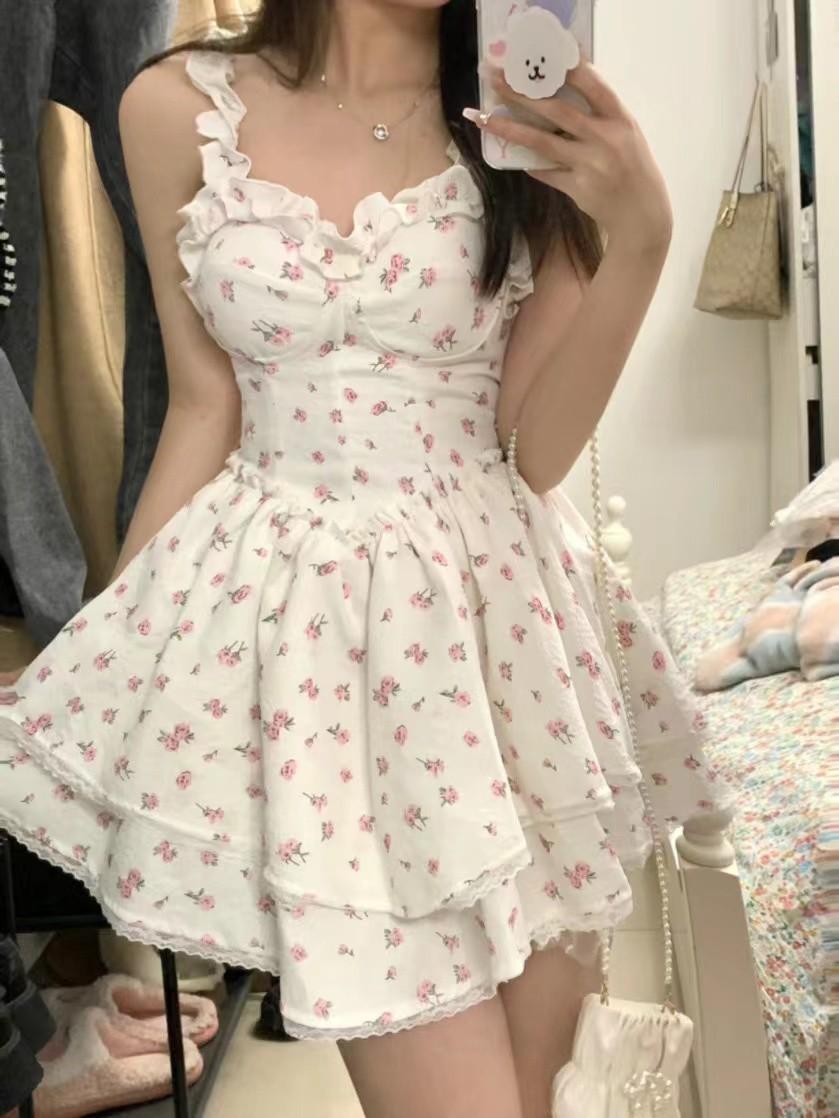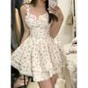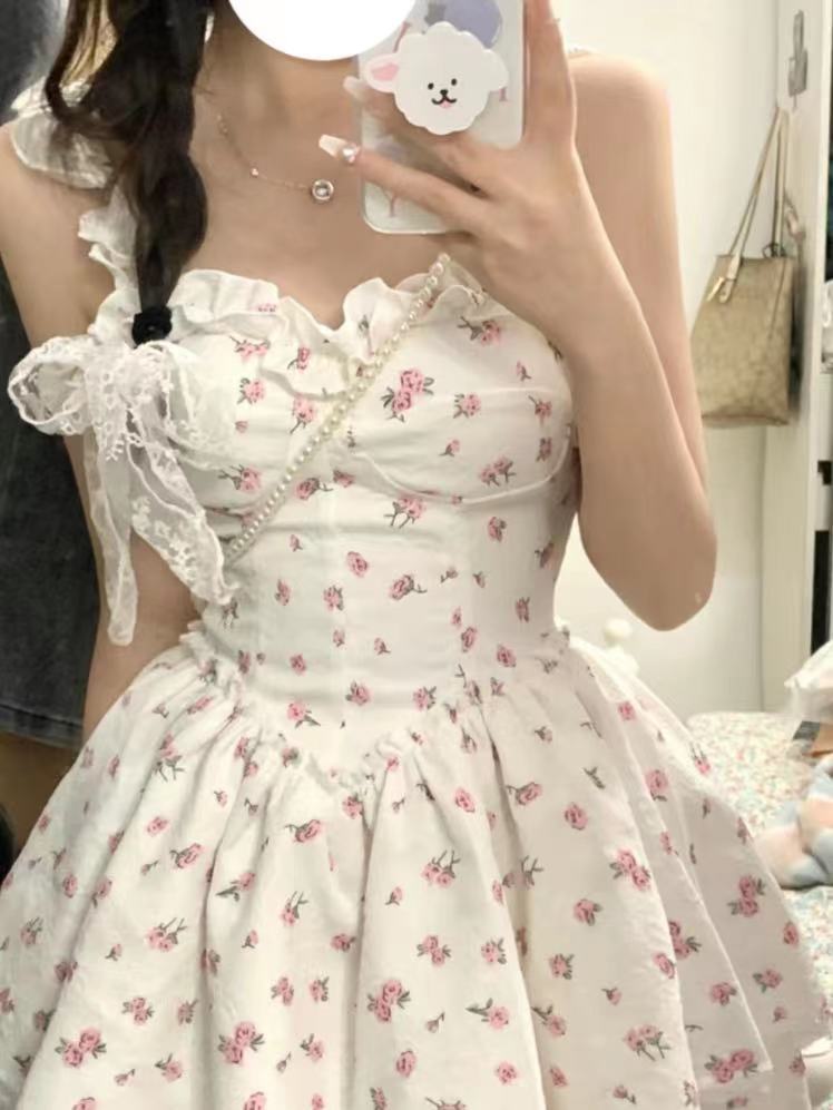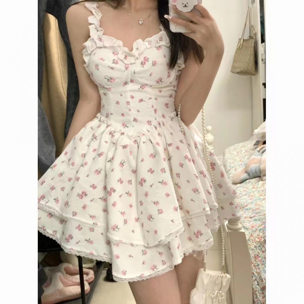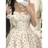 Elegante vestido de verano para mujer, estilo francés, ajustado, con tirantes finos y estampado floral, corte A.