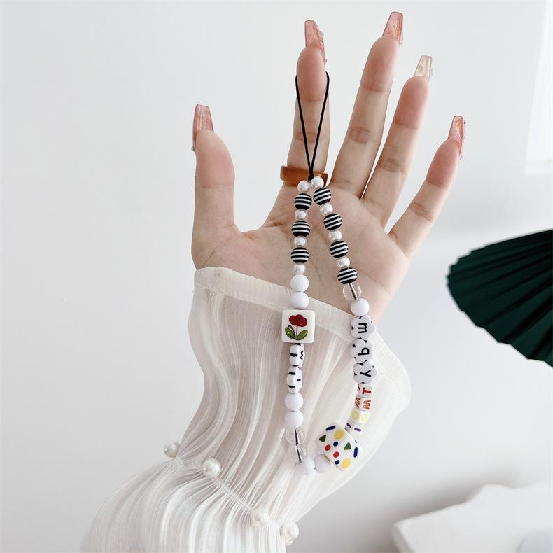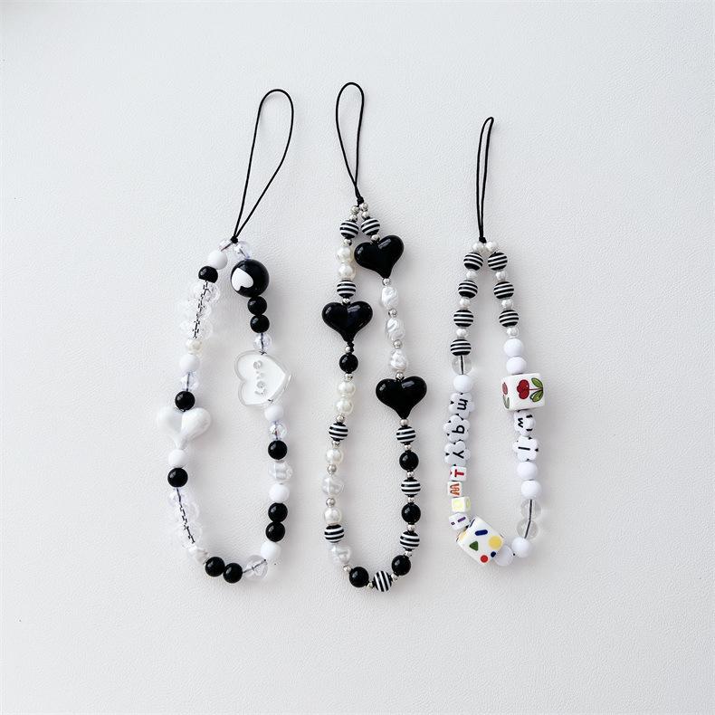 Estilo Ins Cadena para Teléfono Móvil con Cuentas Blanco y Negro DIY Corazón Letra Cordón para Teléfono Móvil Anti-Pérdida y Anti-Caída Colgante para Carcasa de Teléfono Móvil Venta al Por Mayor