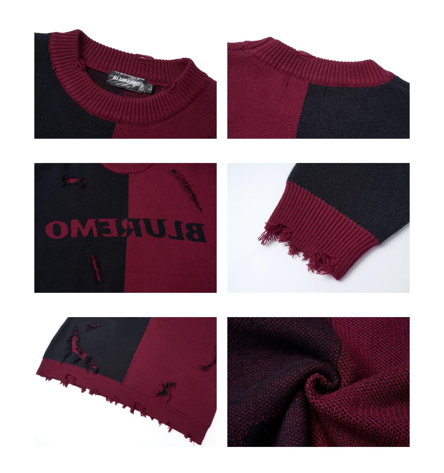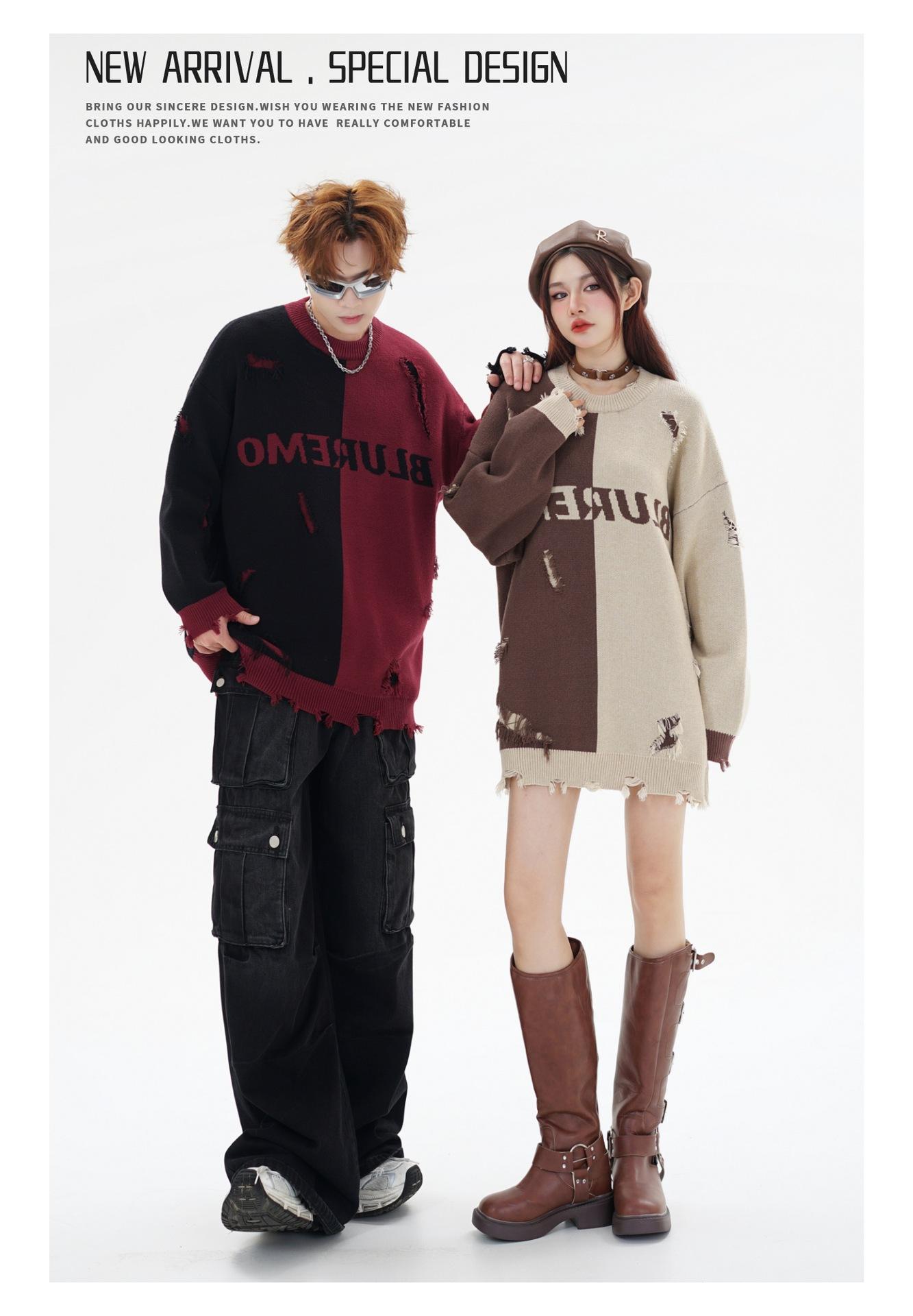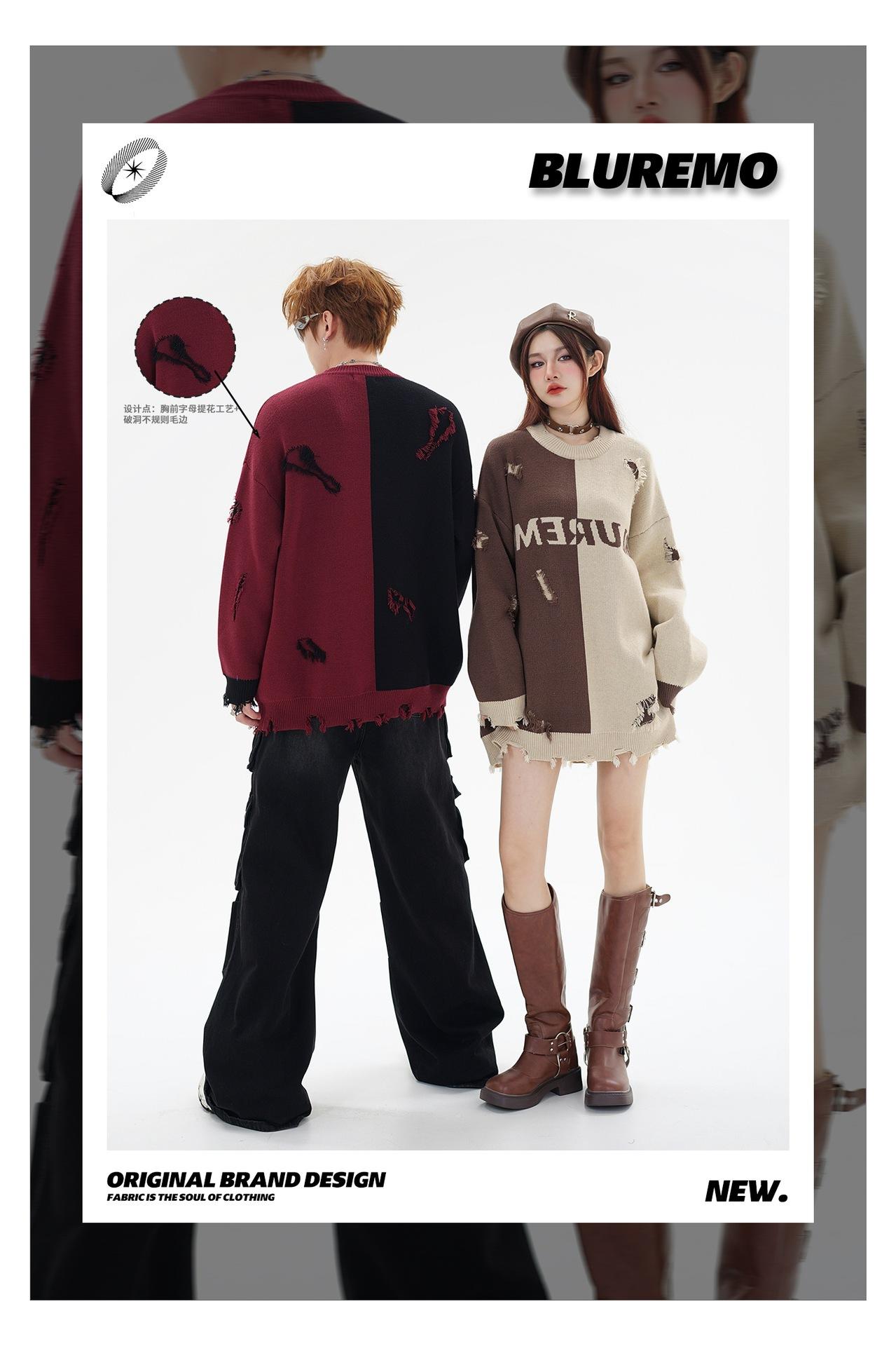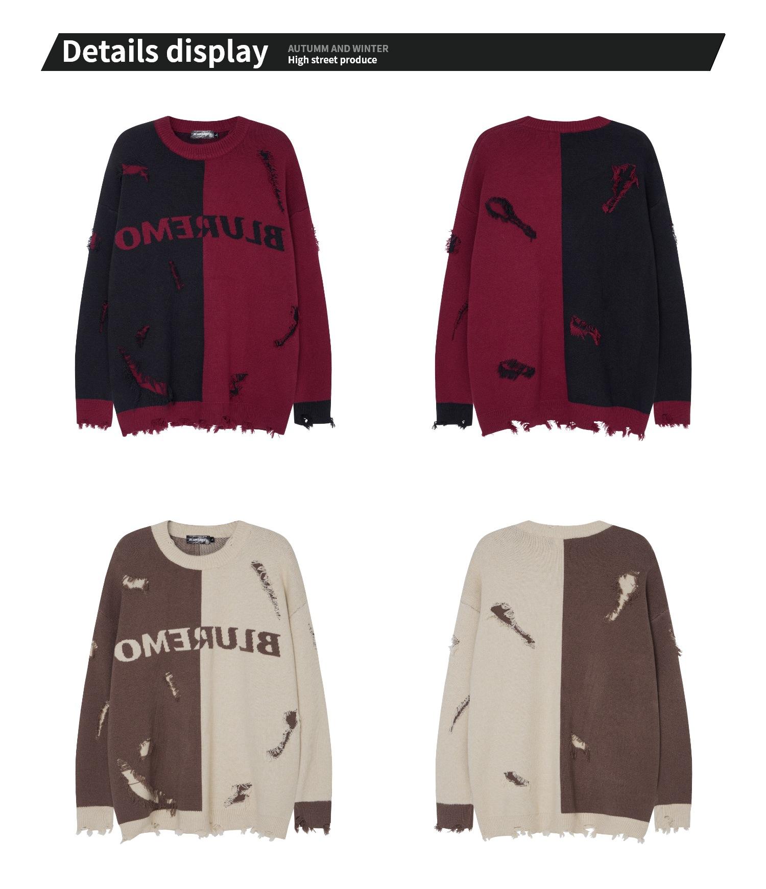 BLUREMO | otoño e invierno retro americano costuras color contraste agujero irregular suéter de punto holgado Joker cuello redondo marea