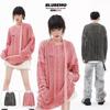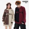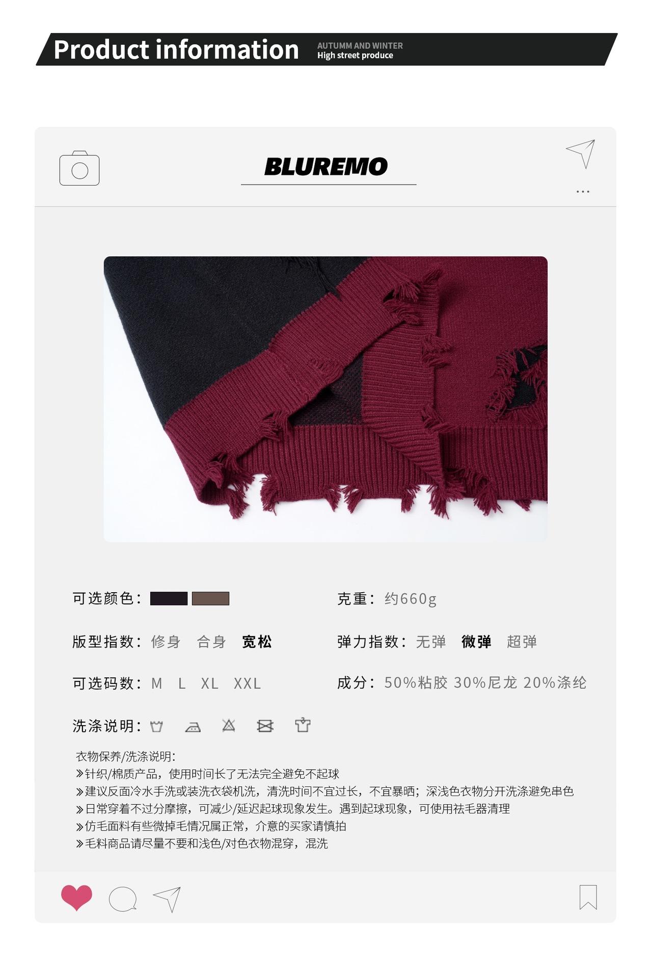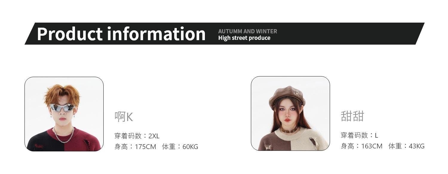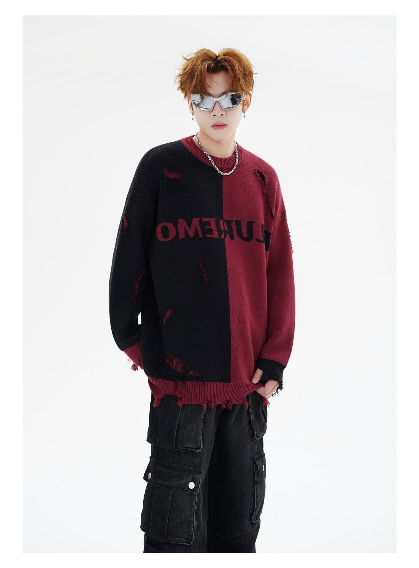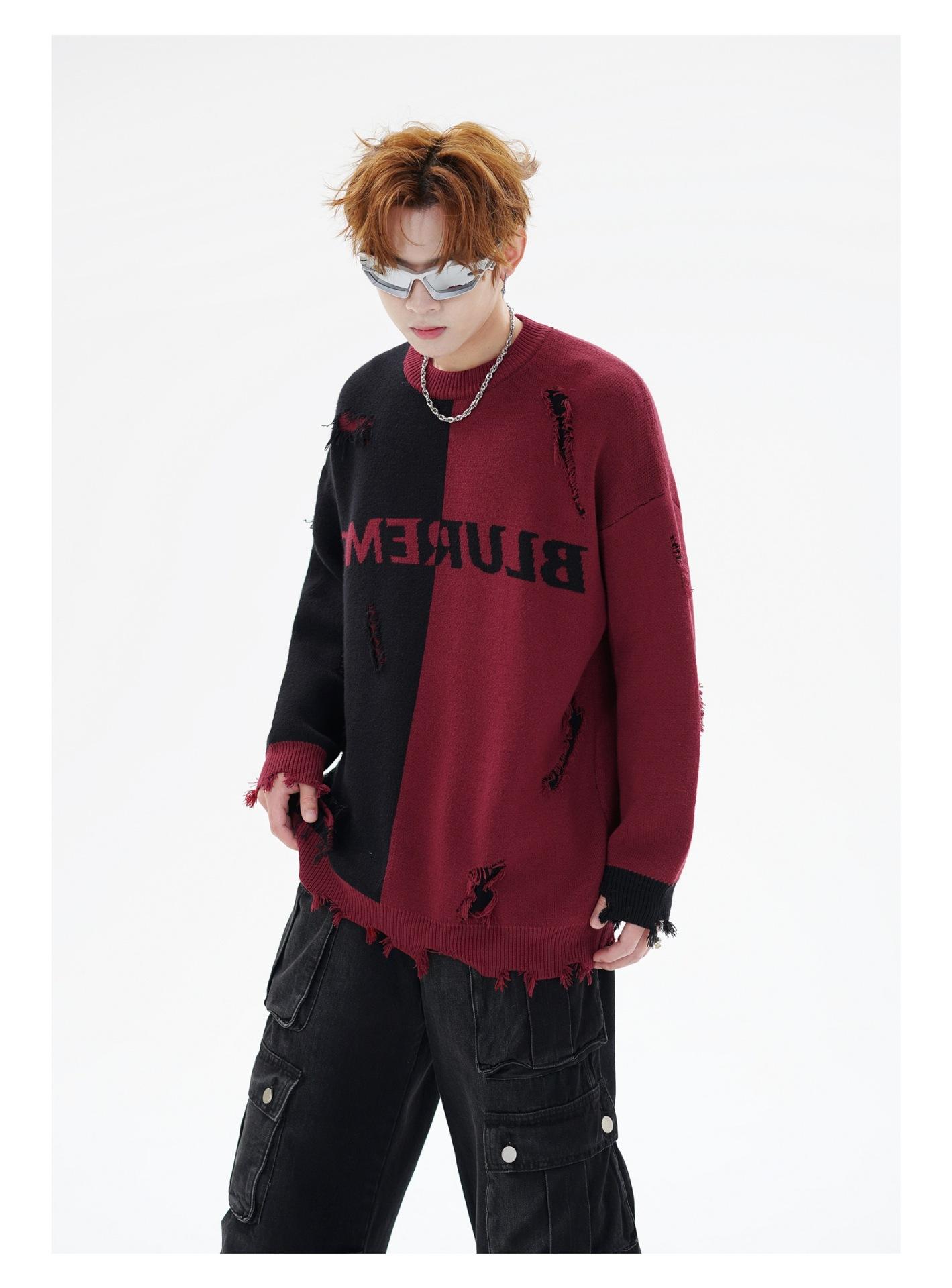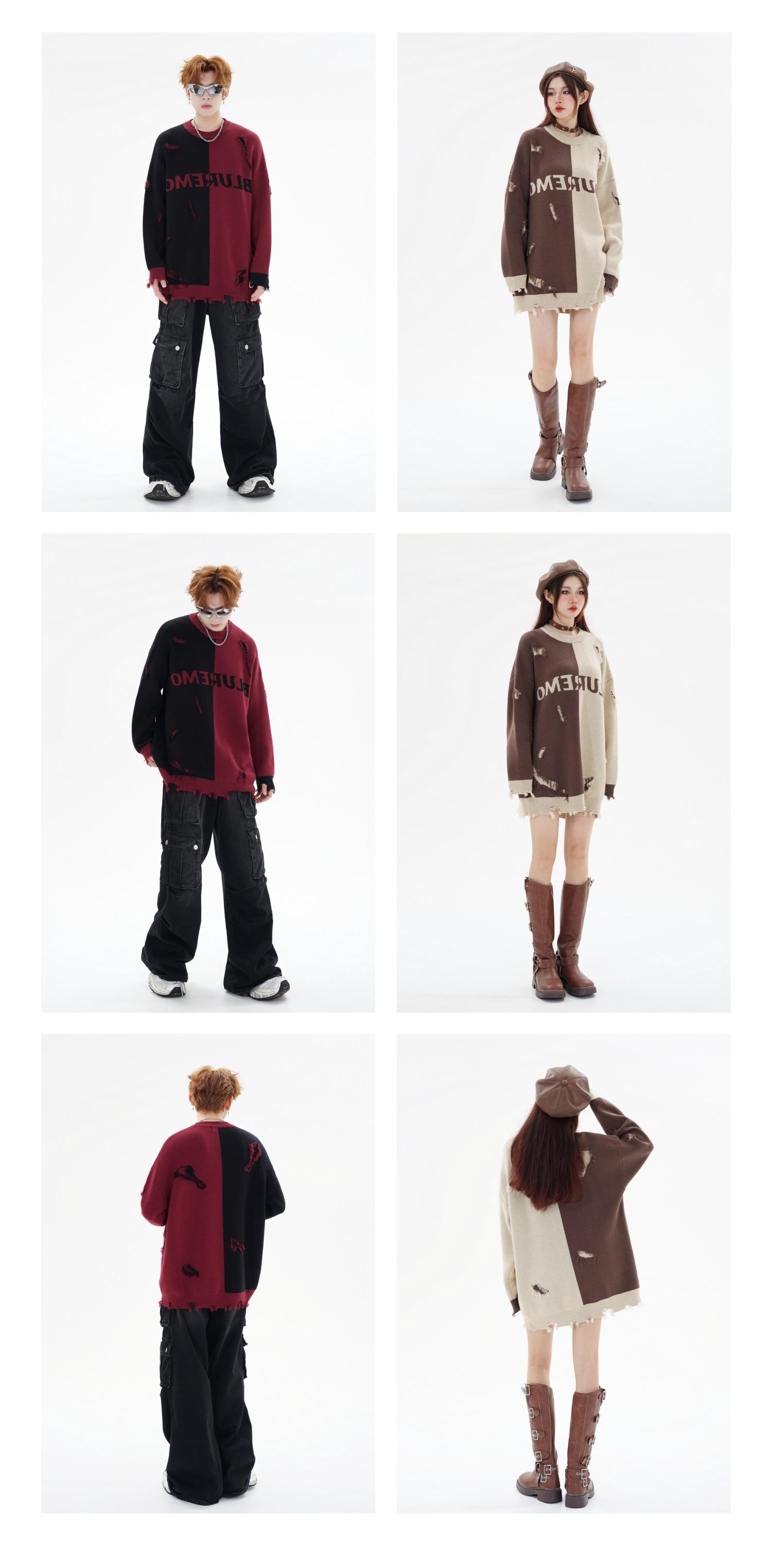 BLUREMO | otoño e invierno retro americano costuras color contraste agujero irregular suéter de punto holgado Joker cuello redondo marea