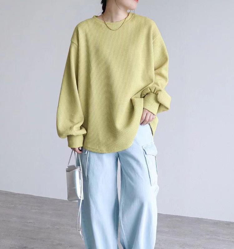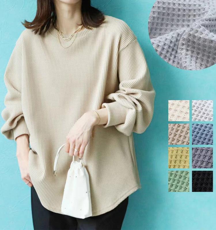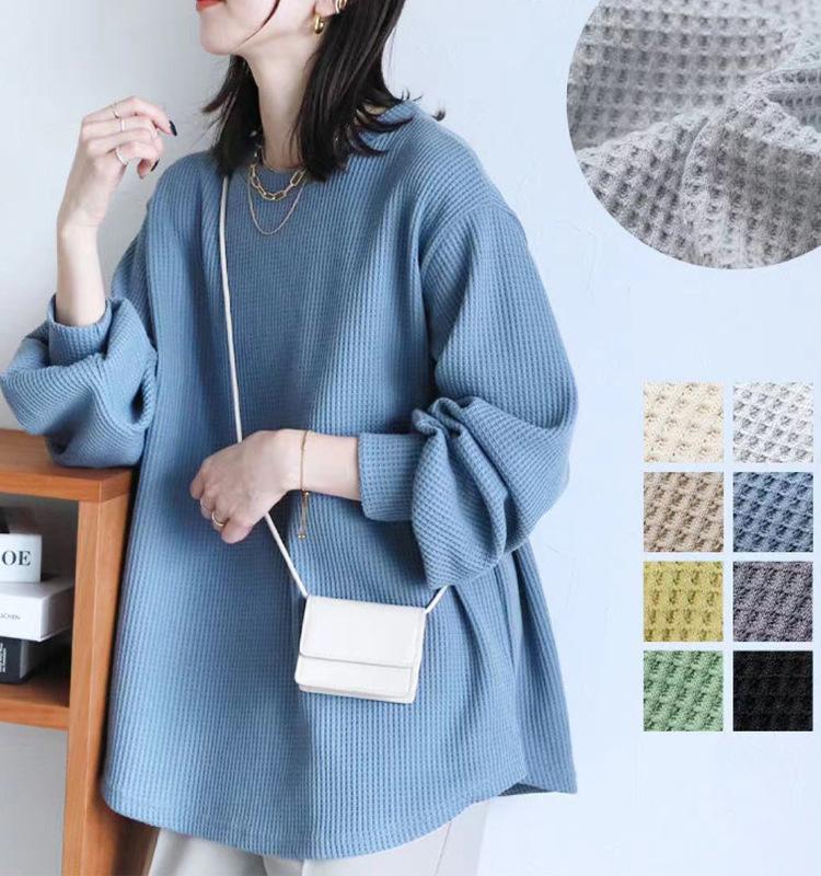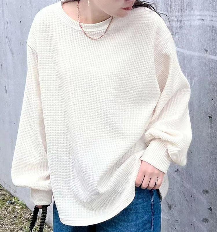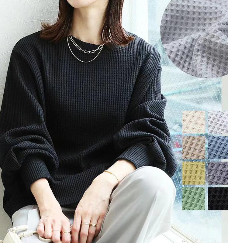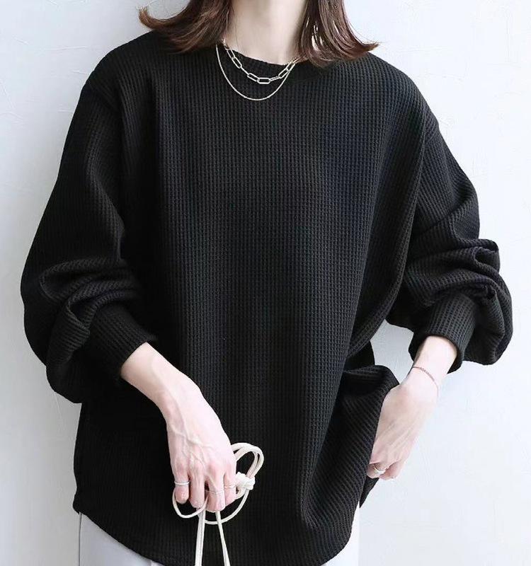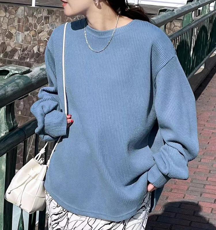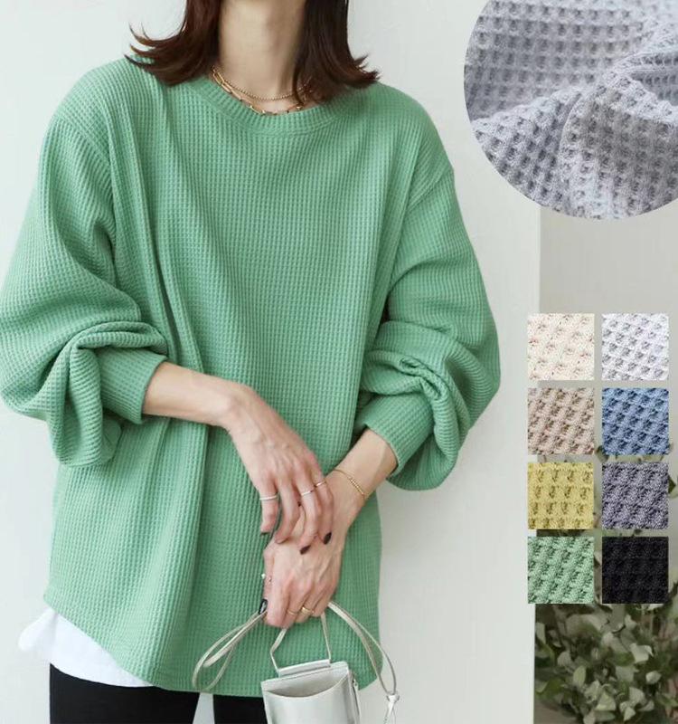 Otoño Nueva Camiseta de Mujer Holgada Casual de Gama Alta Nido de Abeja Nicho Color Sólido Adelgazante Cuello Redondo Camiseta Básica Manga Larga