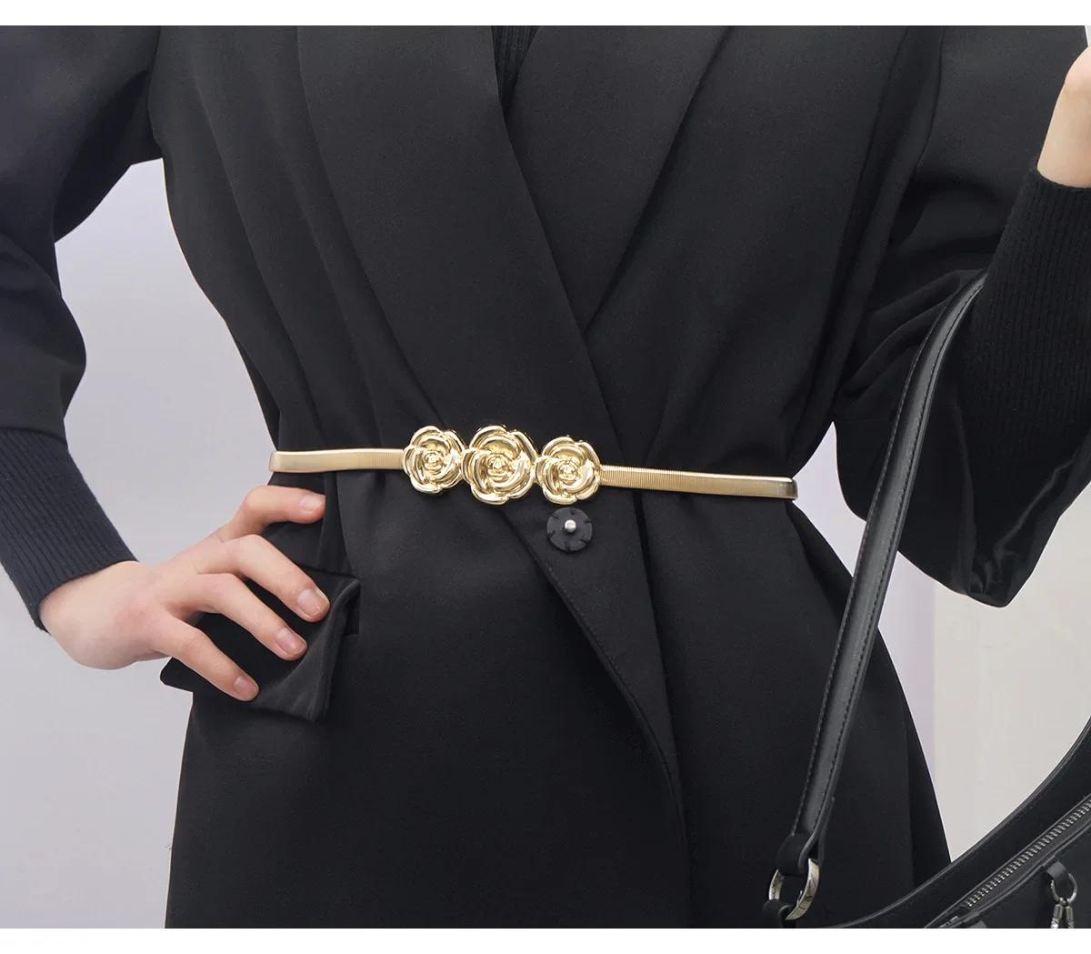 Cinturón elástico fino metálico para mujer, con flores rosas a juego, cadena decorativa para la cintura, falda con cinturón que combina con todo.