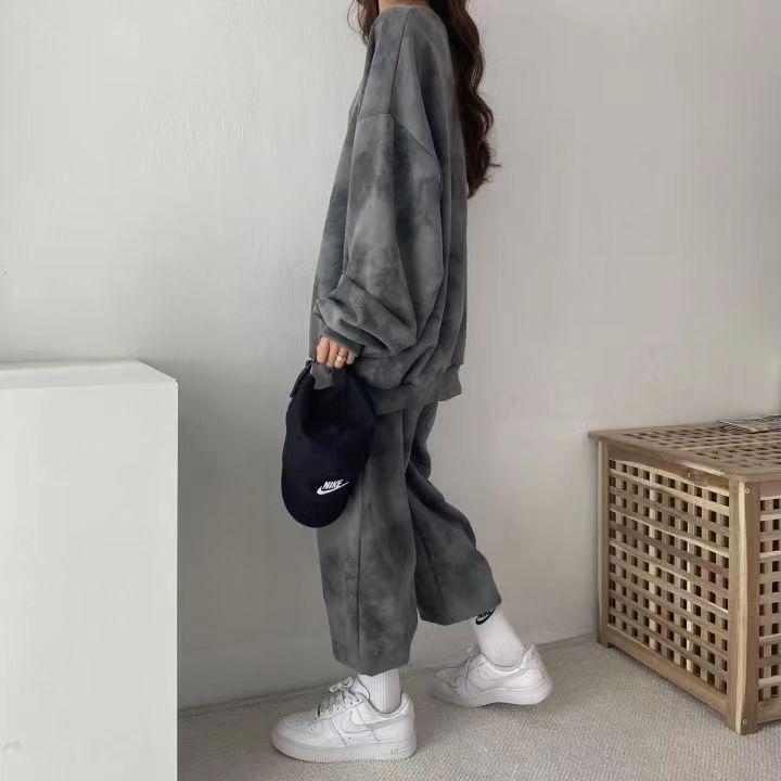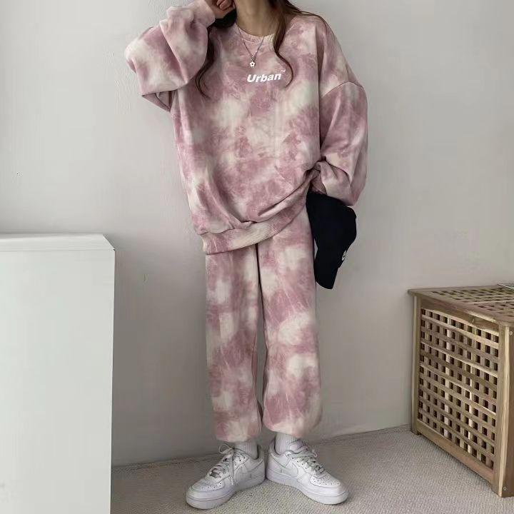 Traje de mujer de comercio exterior 2024 primavera y otoño nuevo tie-dye suéter suelto moda deportivo traje para correr conjunto de dos piezas marea