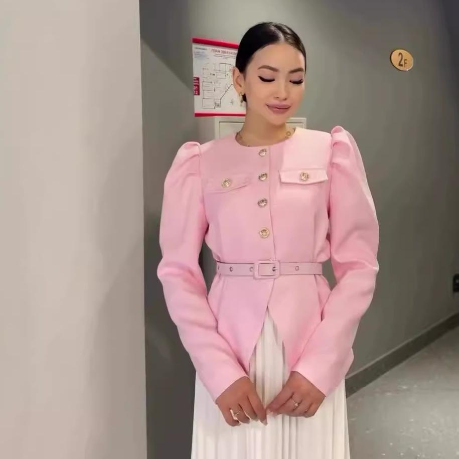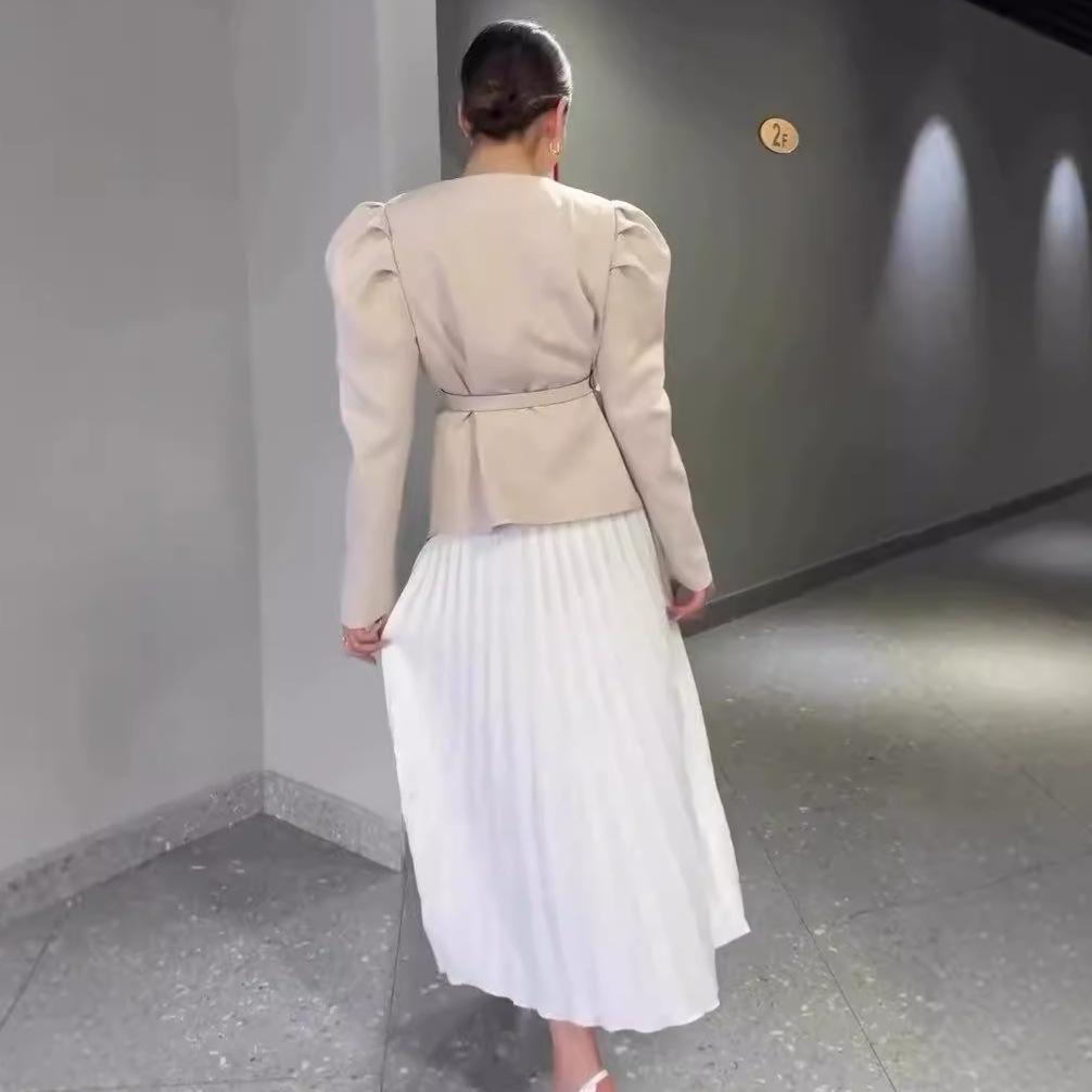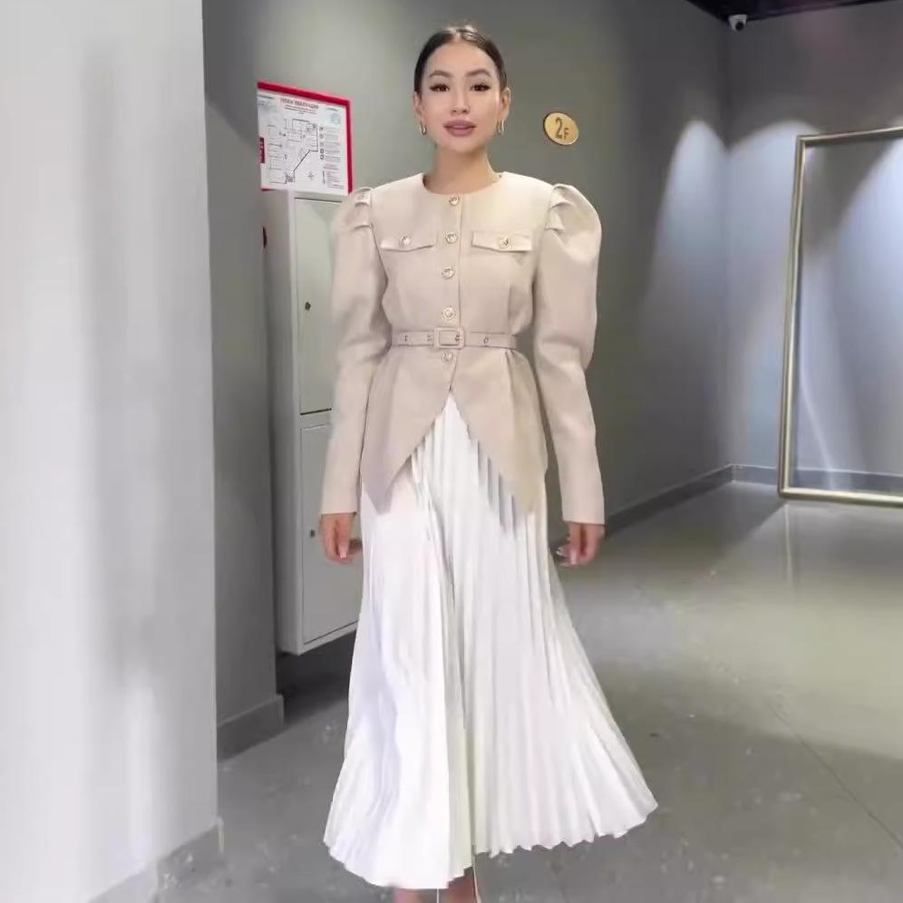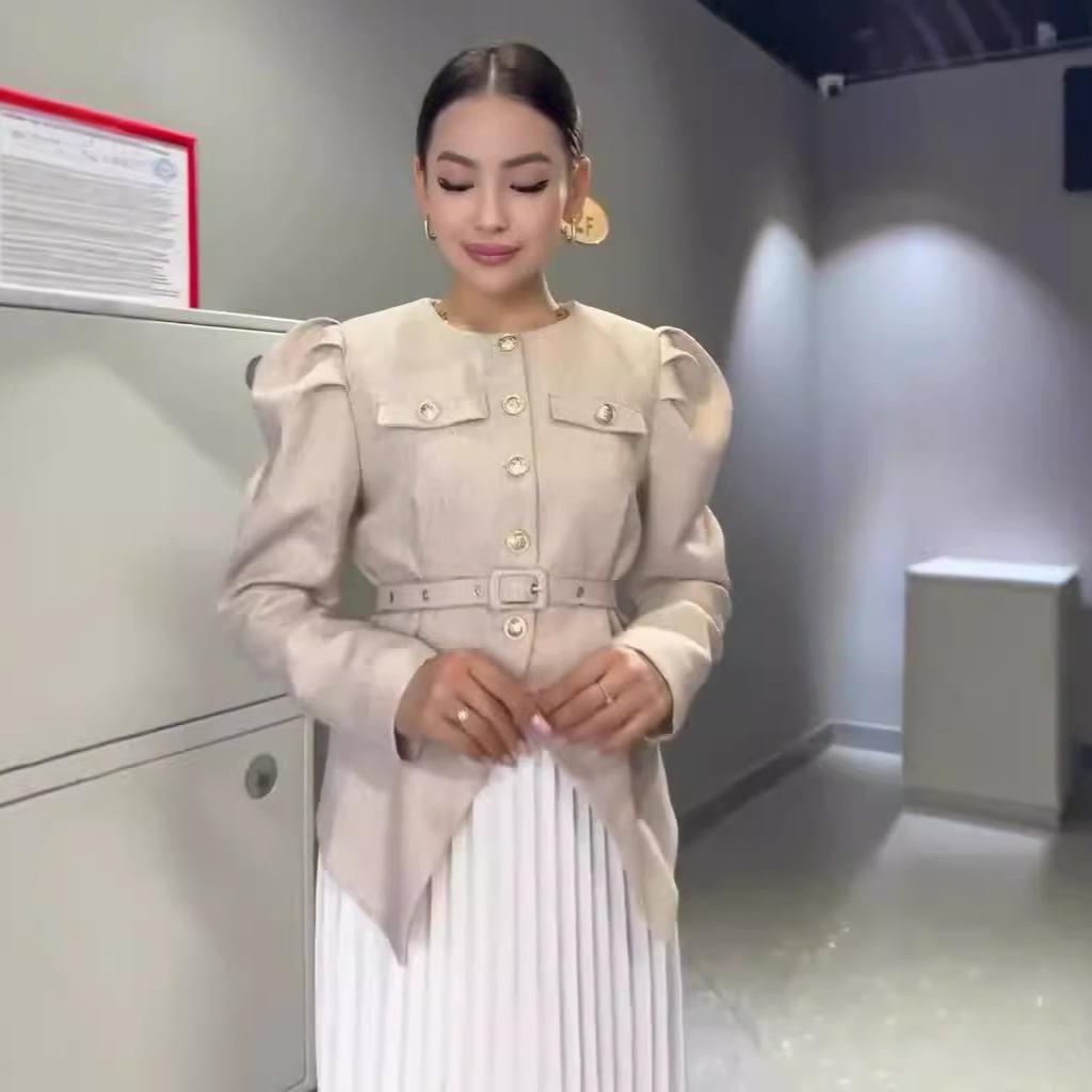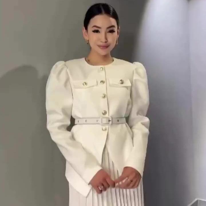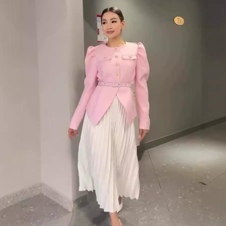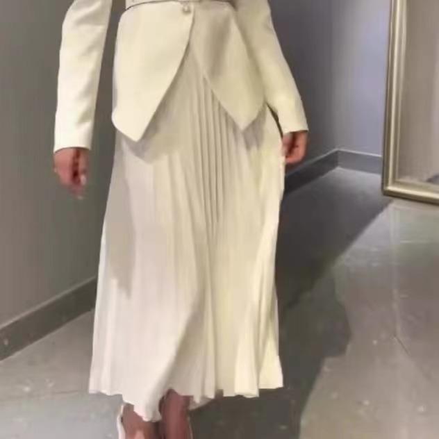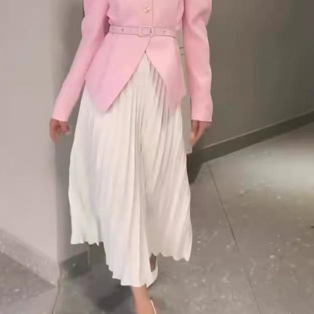 Khaki, Khaki top, White skirt, Pink, Pink top, White skirt, Black, Black top, White skirt, Apricot, Apricot top, Apricot skirt
