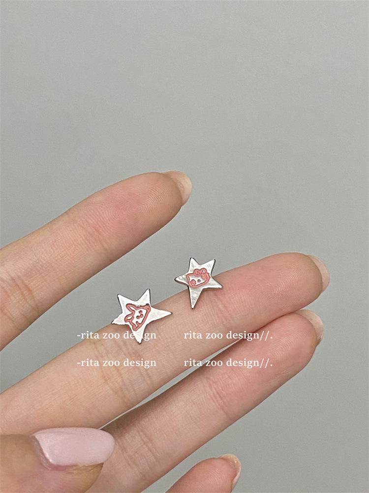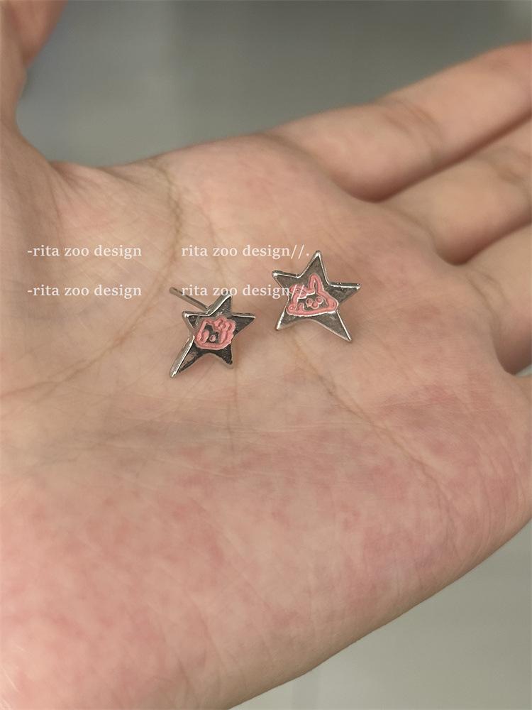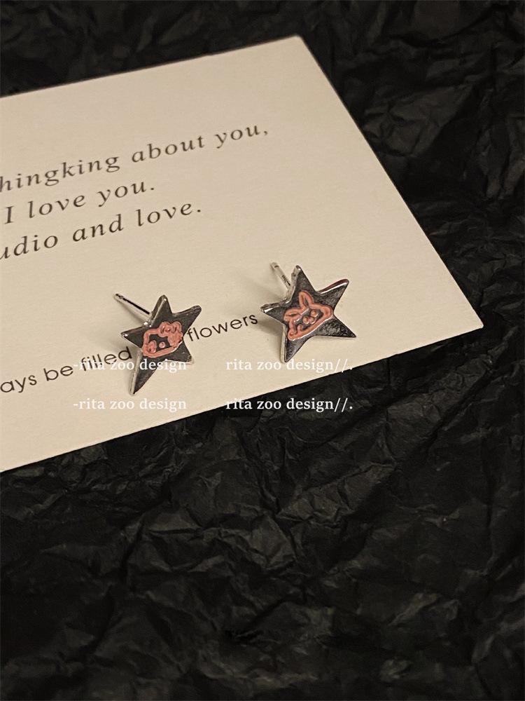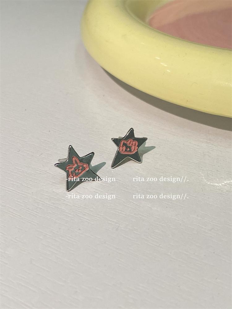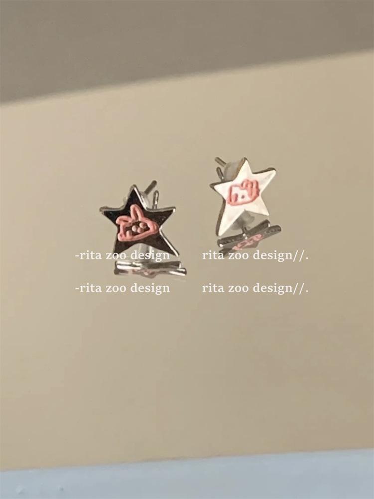 Pendientes sencillos de estilo japonés y coreano con diseño de estrella plateada mate, diseño de grafiti, con forma de gato, conejo y niña, para mujer