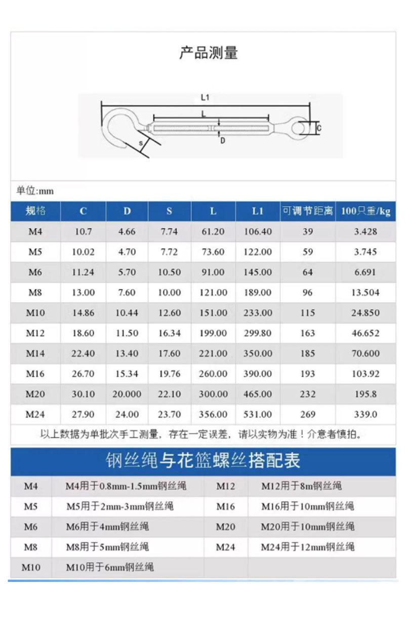 Tensor de cable de acero inoxidable 304 para cesta de flores, con cuerpo abierto, tornillo azul, tensor de perno M4-M12