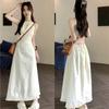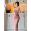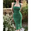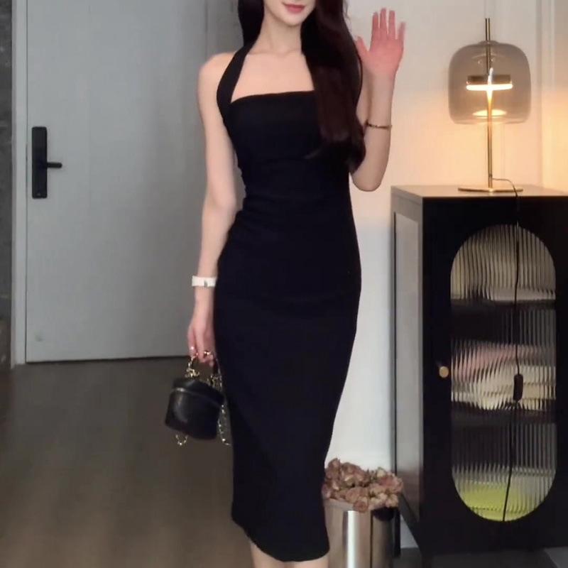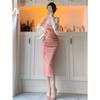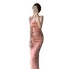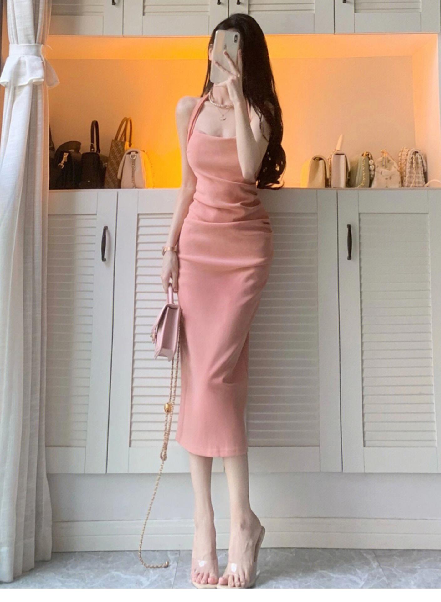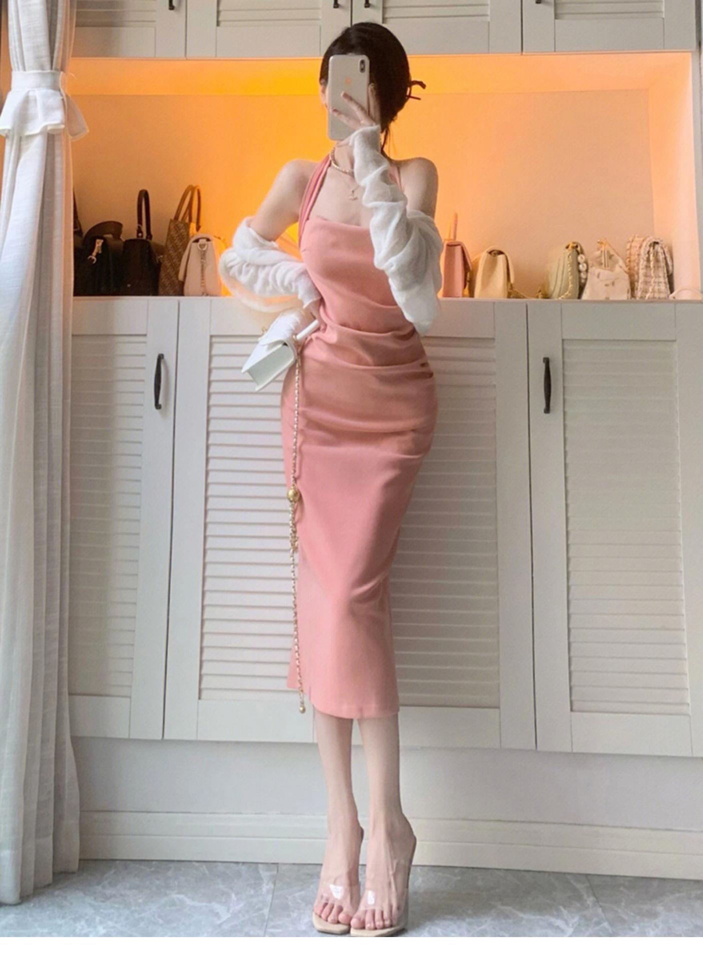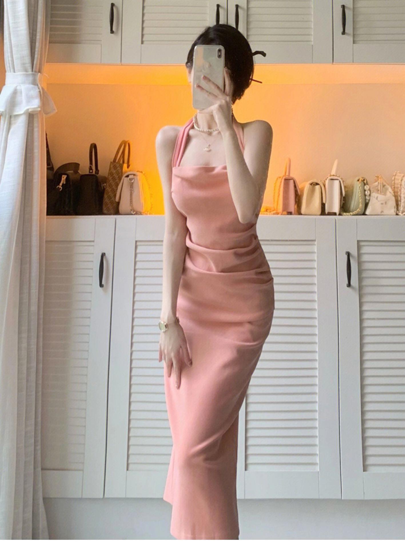 Deseo Puro Rosa Halter Cuello Vestido de Tirantes Verano para Mujer Textura de Alta Calidad Francés Cubre Cintura Cadera Falda Midi Temperamento