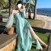 Vestido de tirantes verde estilo vacaciones junto al mar para mujer en verano con temperamento de malla de retazos que adelgaza la cintura con falda larga tipo A