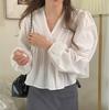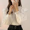 Camisa elegante estilo francés coreano chic con encaje, cuello en V, costuras con volantes, holgada e informal con mangas abullonadas