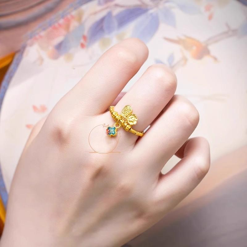 Anillo estilo antiguo Burning Blue estilo antiguo trébol borla anillo pequeño oscilante oro amarillo significado de fortuna anillo esmaltado