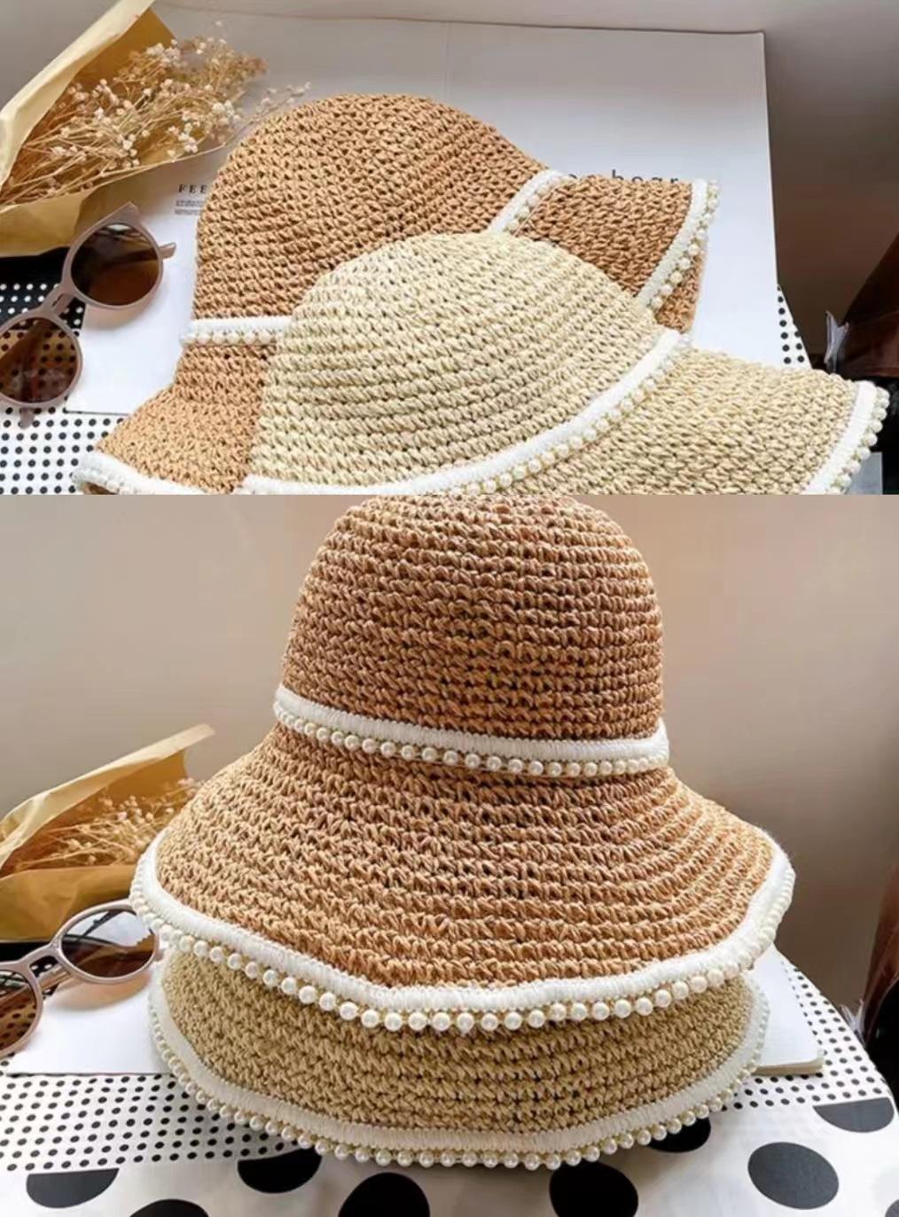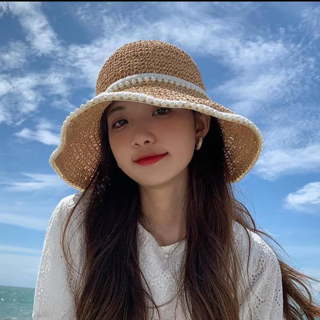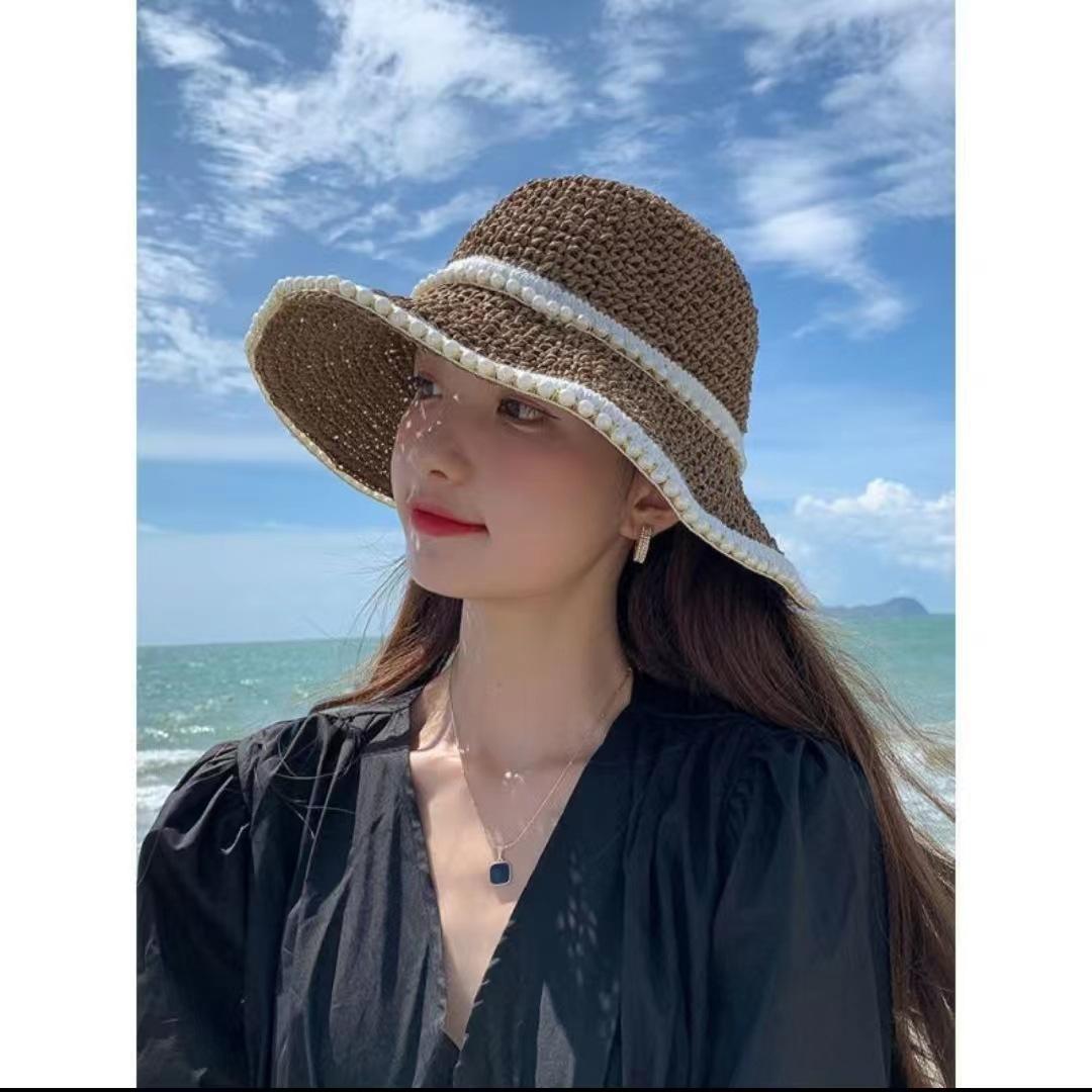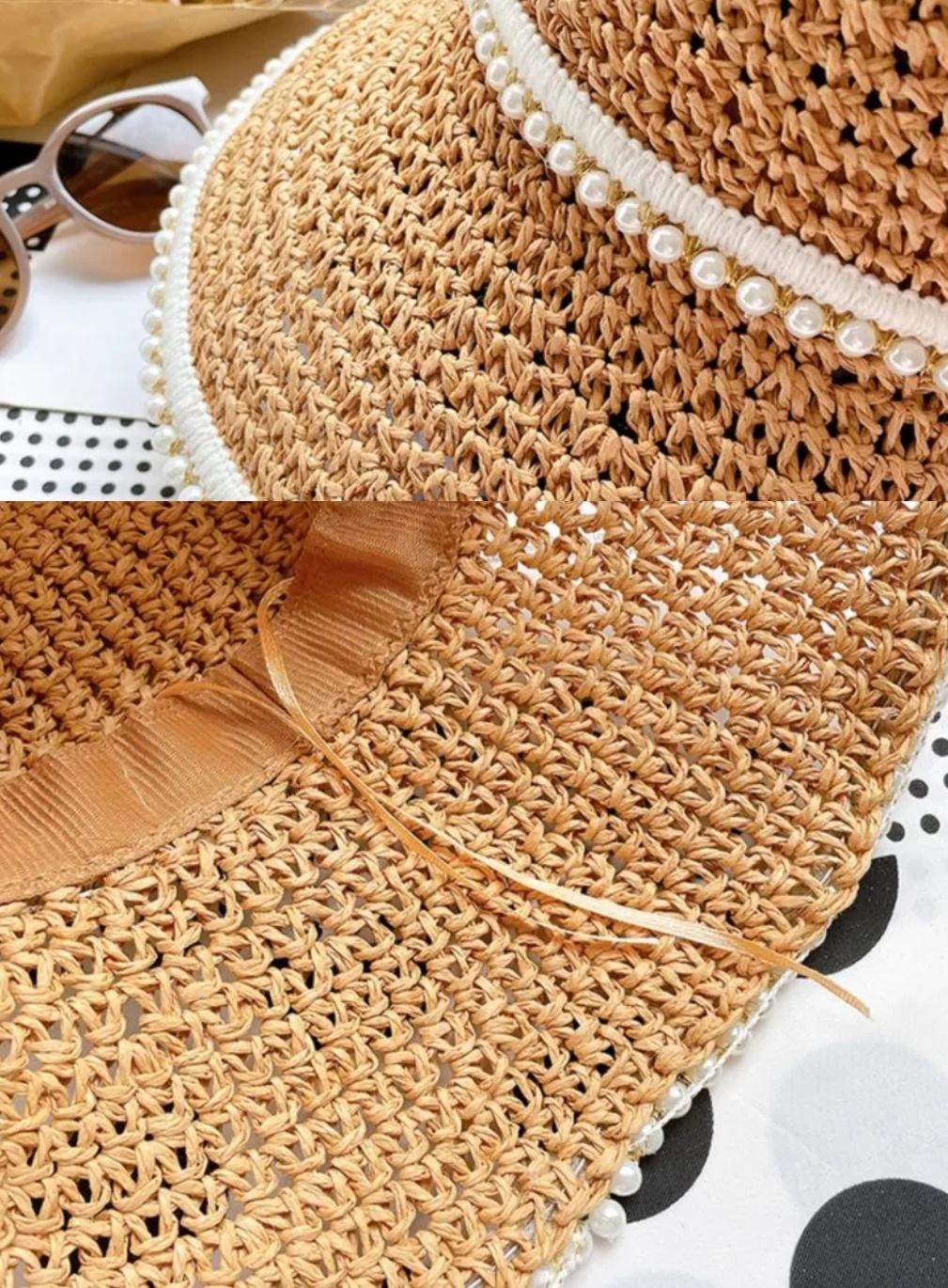 Sombrero de paja tejida con perla para mujer, sombrero de verano fino para el sol, protector solar, para playa, con cara visible, pequeño sombrero de pescador para el sol, genial