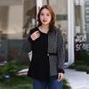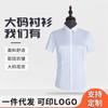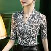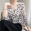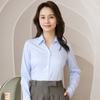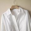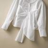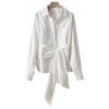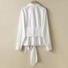 Camisa blanca elegante de manga larga con cuello en V, corte entallado, cinturón fino y abeja bordada. Ropa antiedad de moda para mujer.