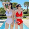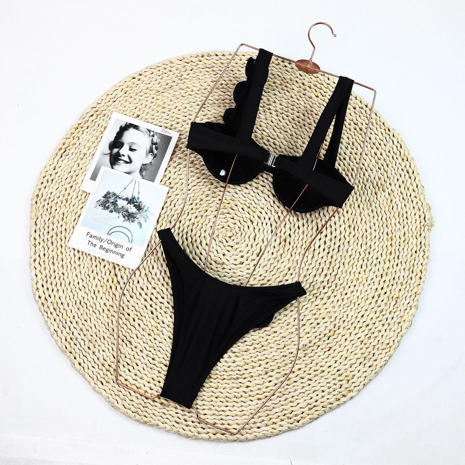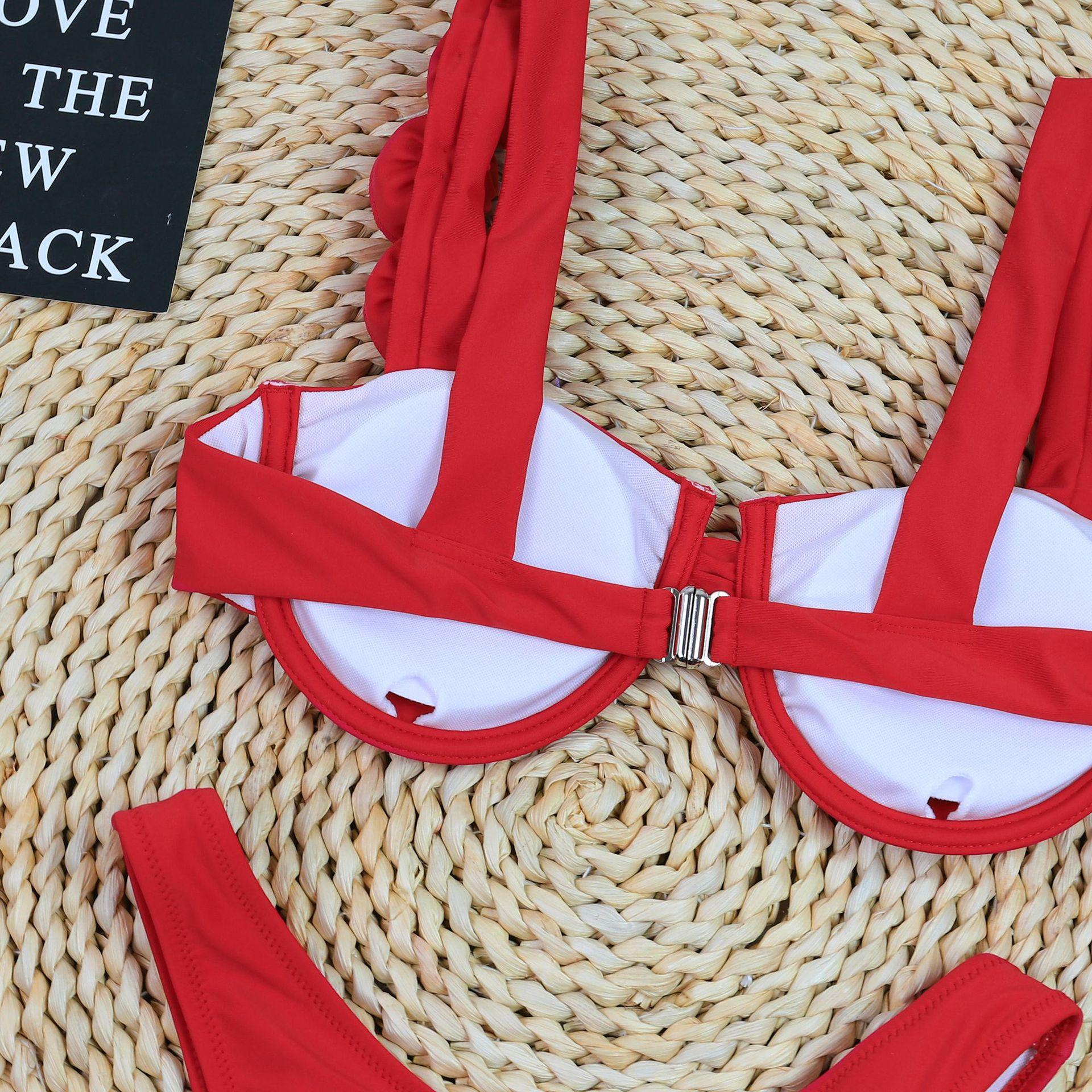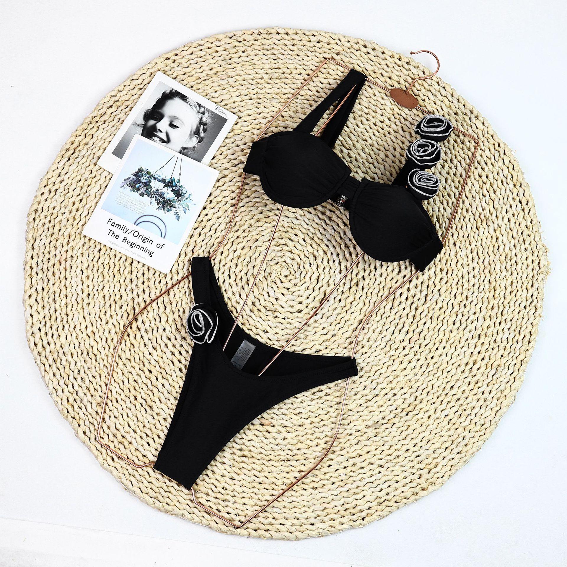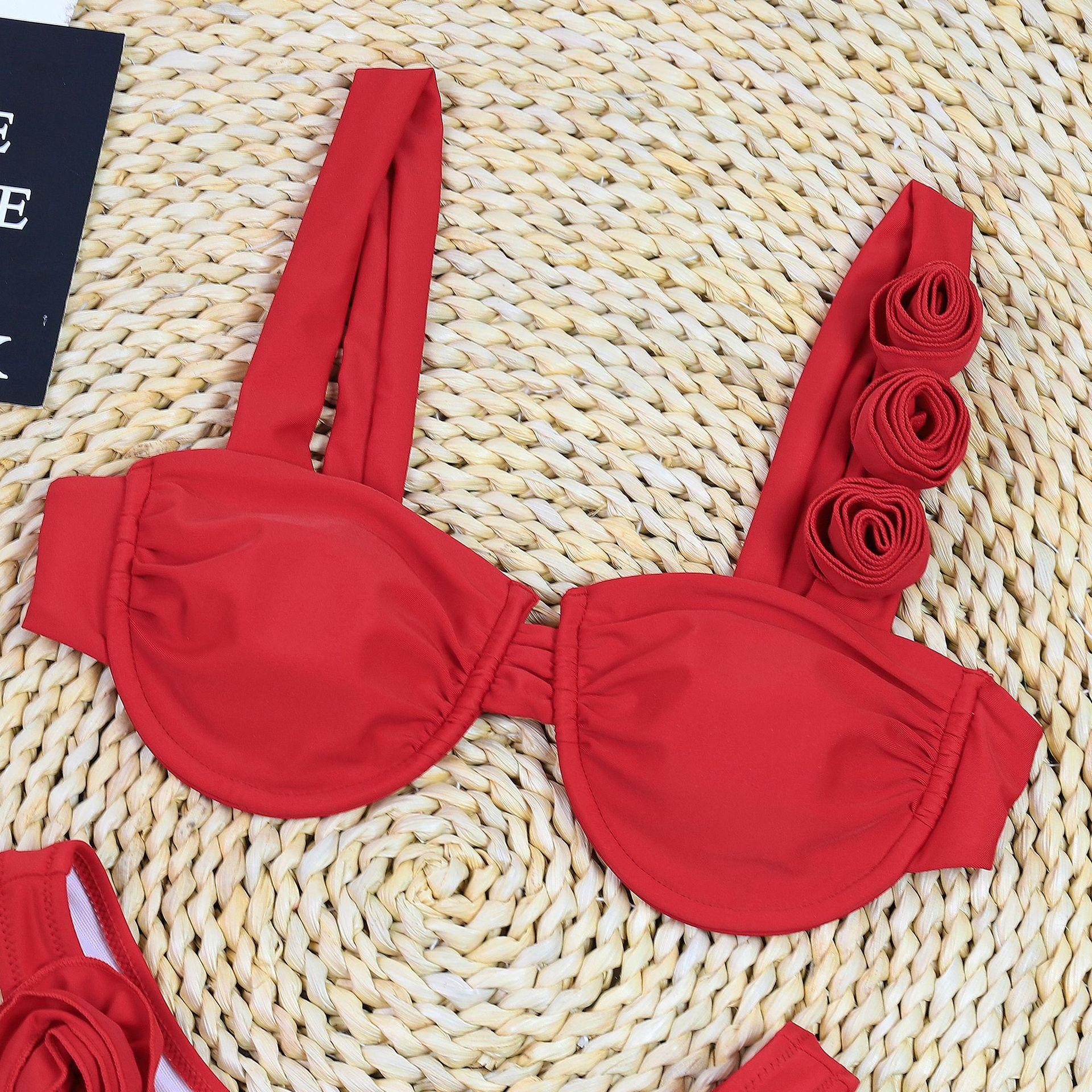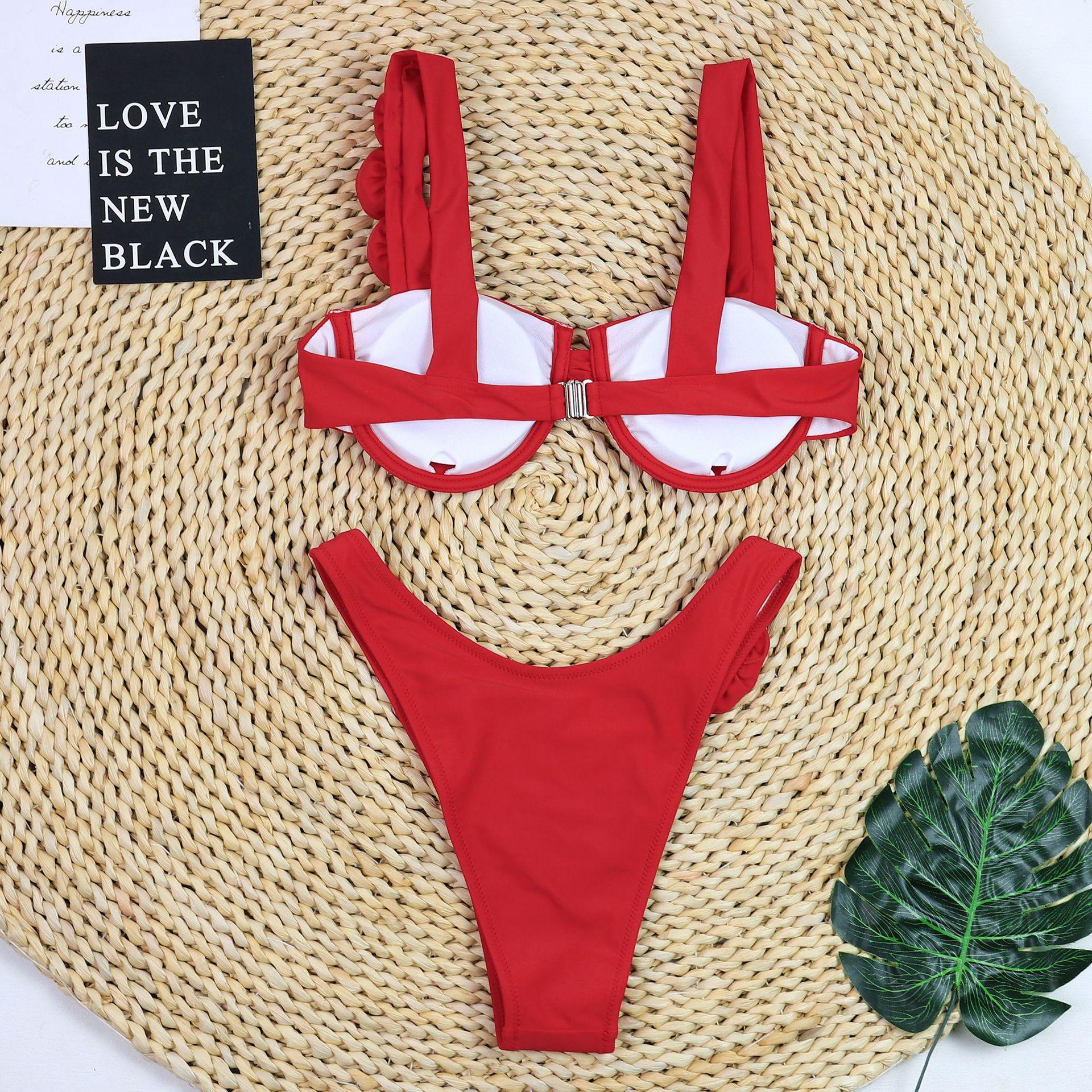 Traje de baño bikini europeo y americano de cintura alta, color puro, exportación, flor 3D, push up, dividido, sexy, venta al por mayor, ajustado