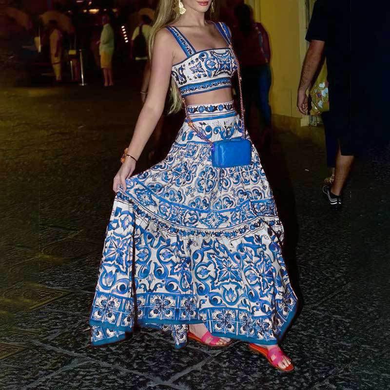 Suministro Transfronterizo de Amazon 2025 Otoño Europeo y Americano Nuevo Conjunto de Moda para Mujer de Falda Acampanada con Tirantes Estampados
