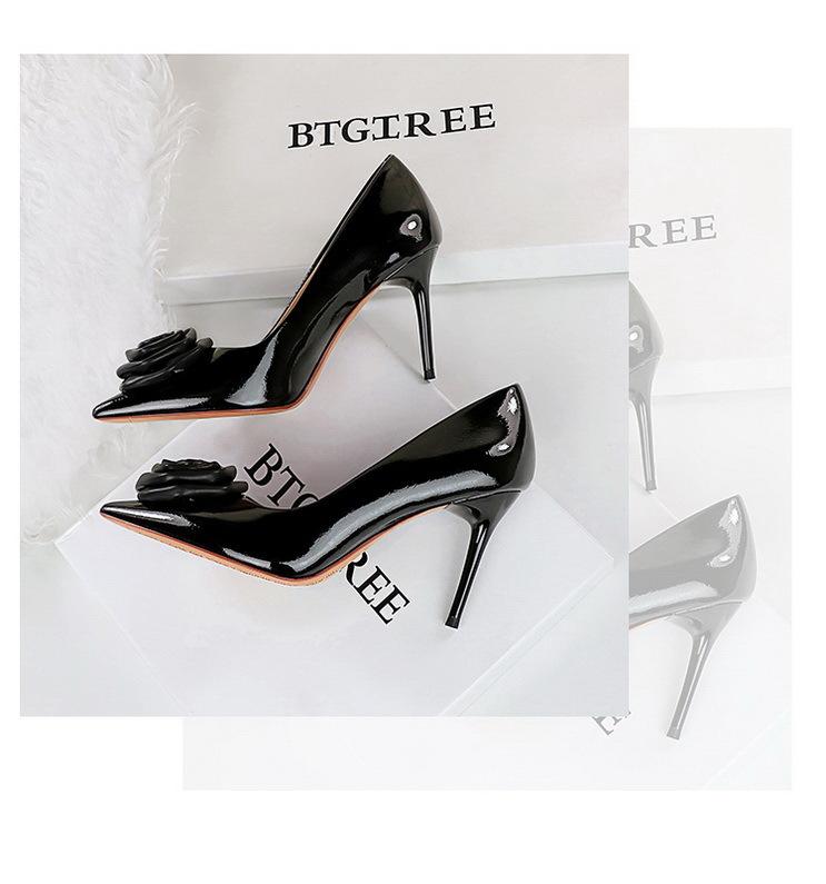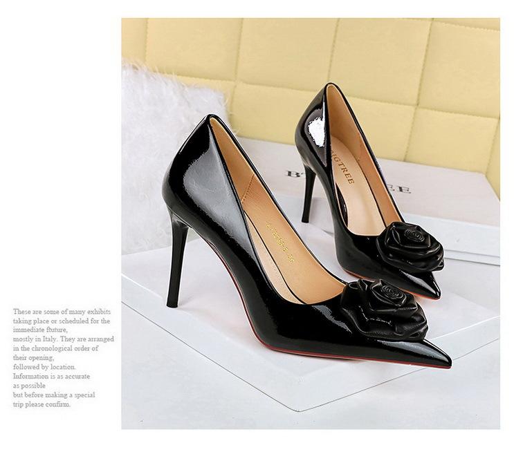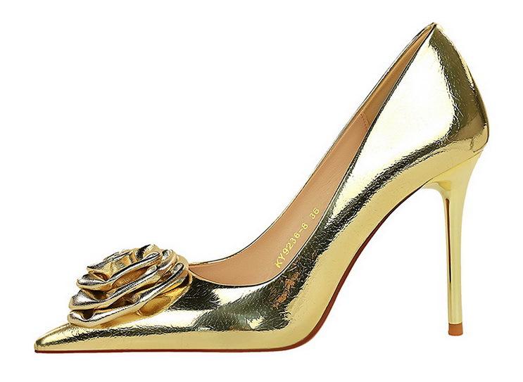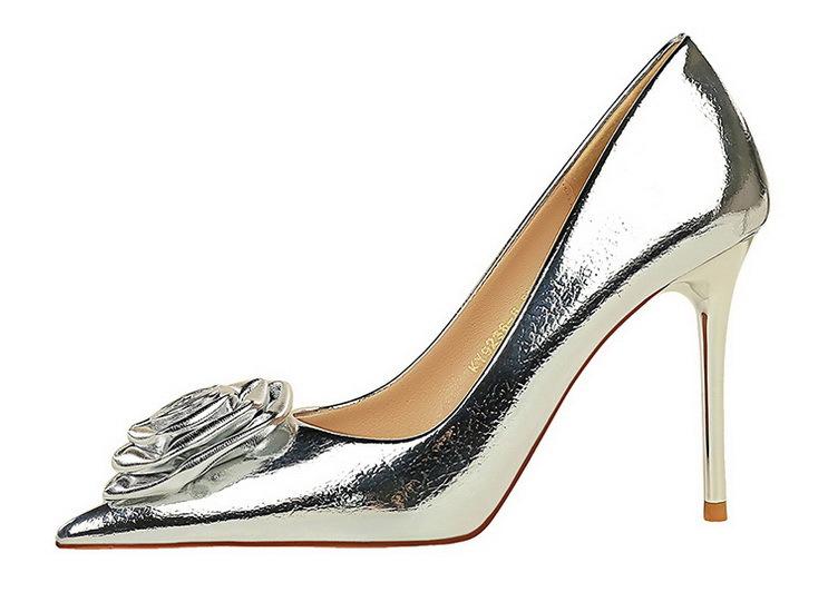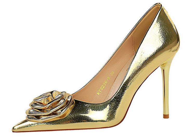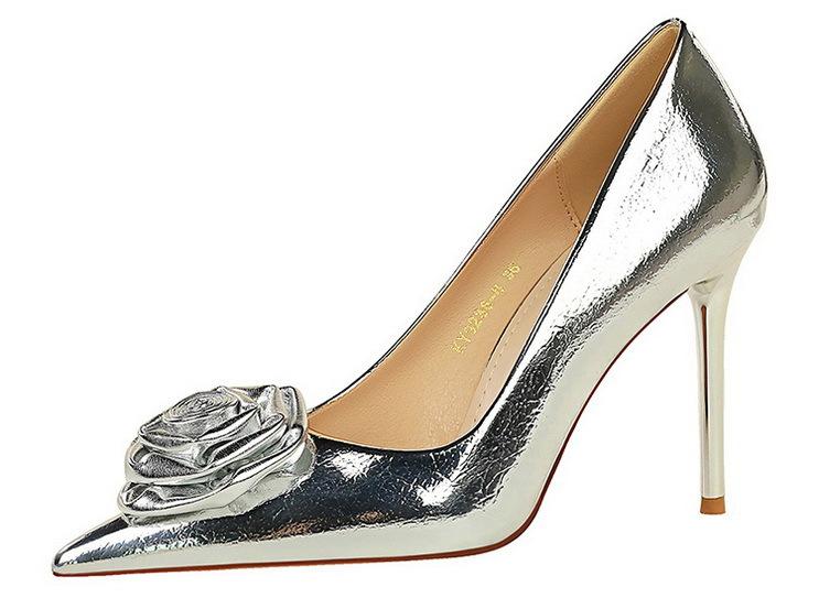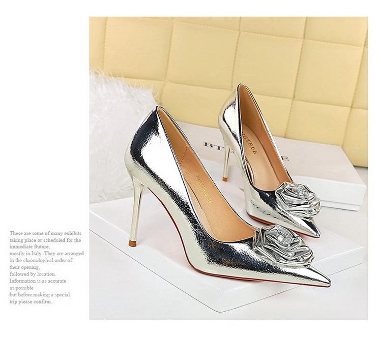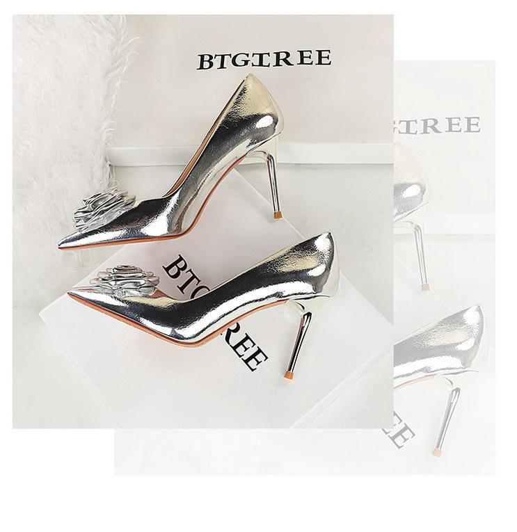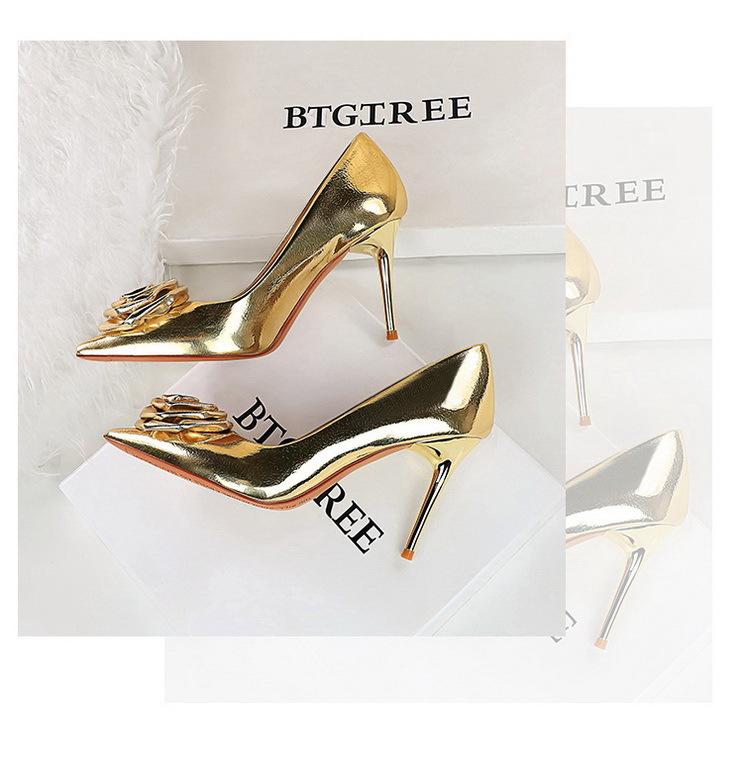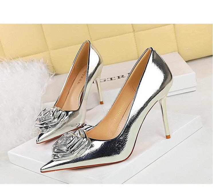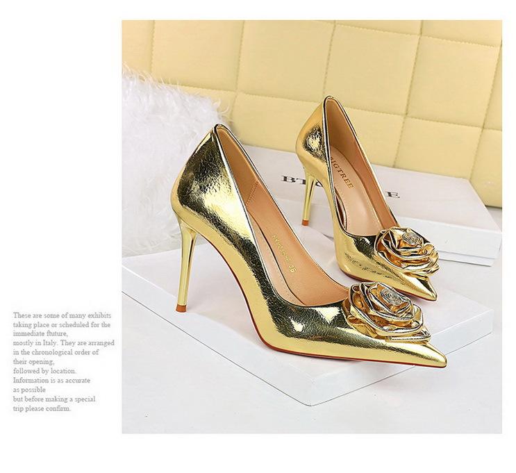 Elementos populares: Zapatos de tacón alto de moda para banquetes de estilo europeo y americano, tacones ultra altos, rosas y flores metálicas