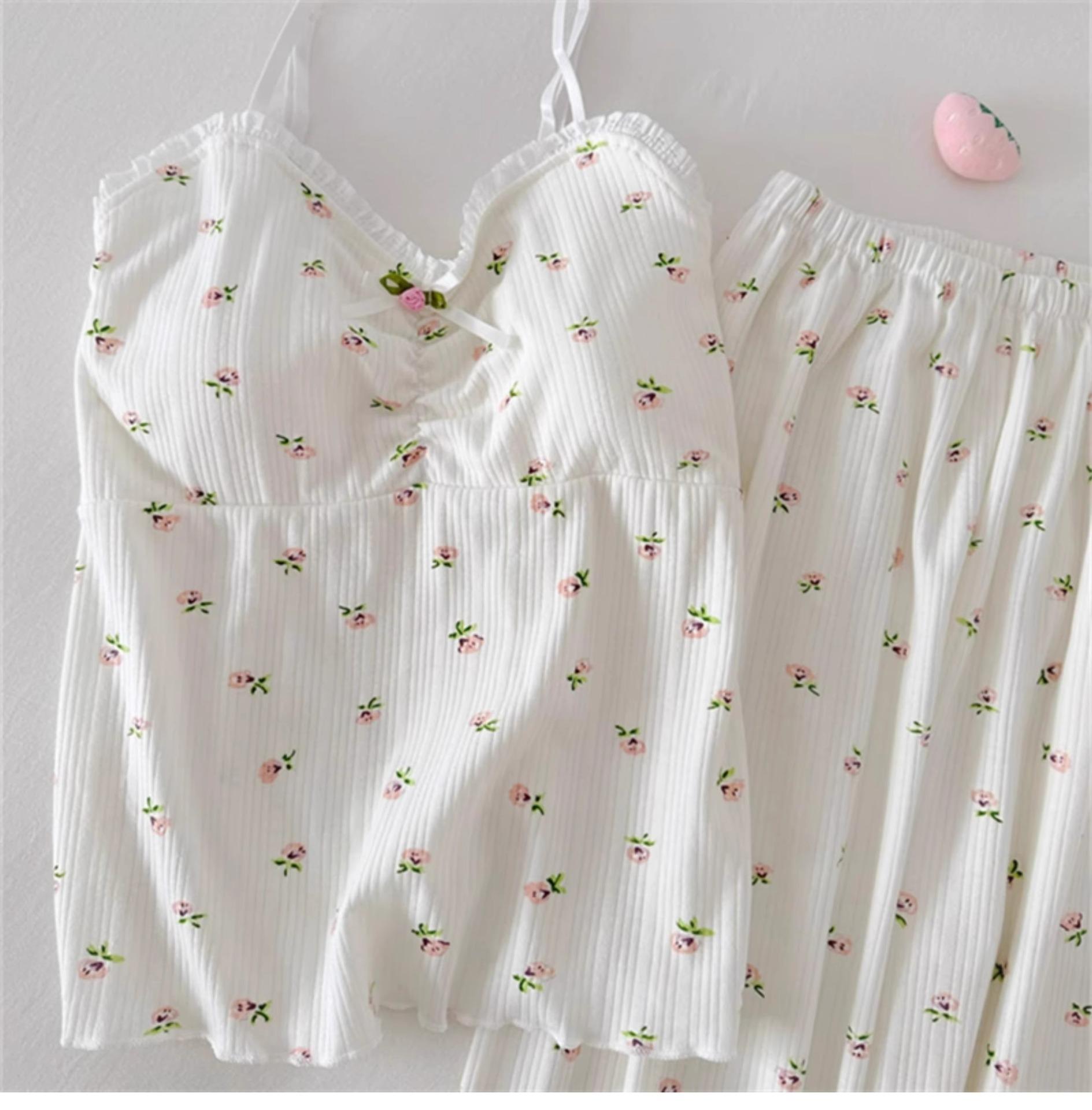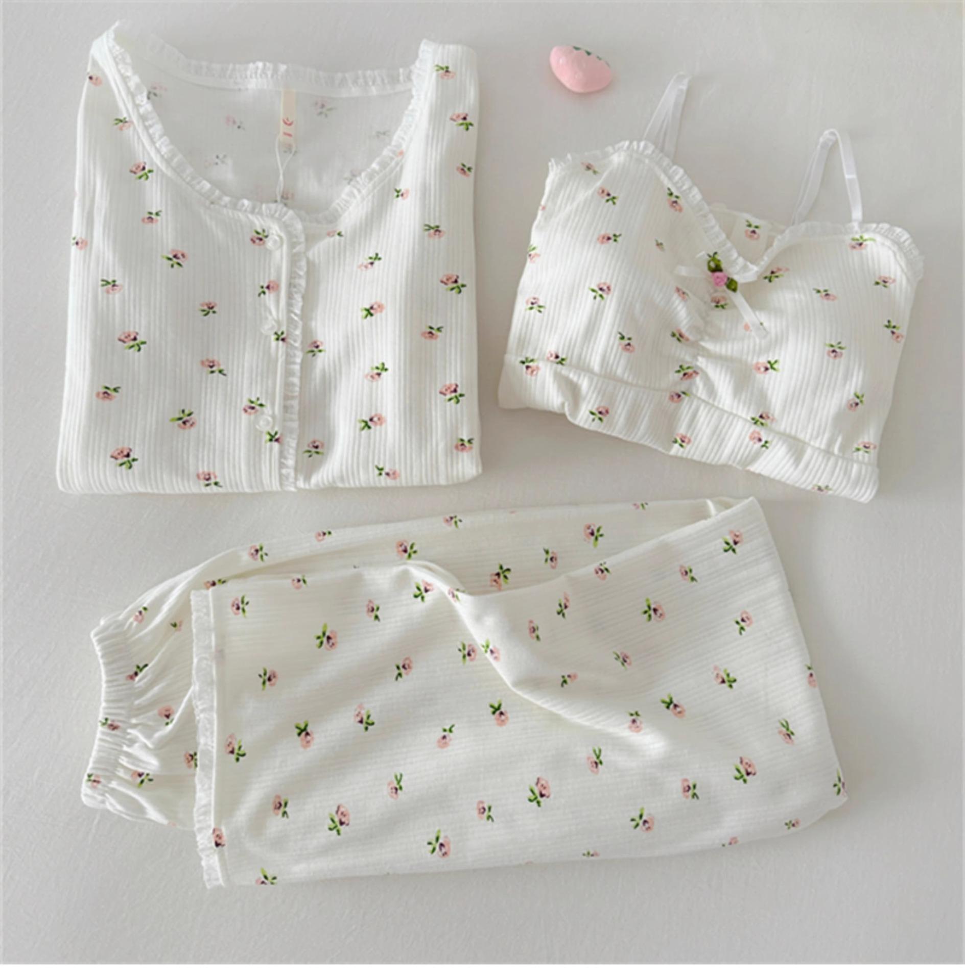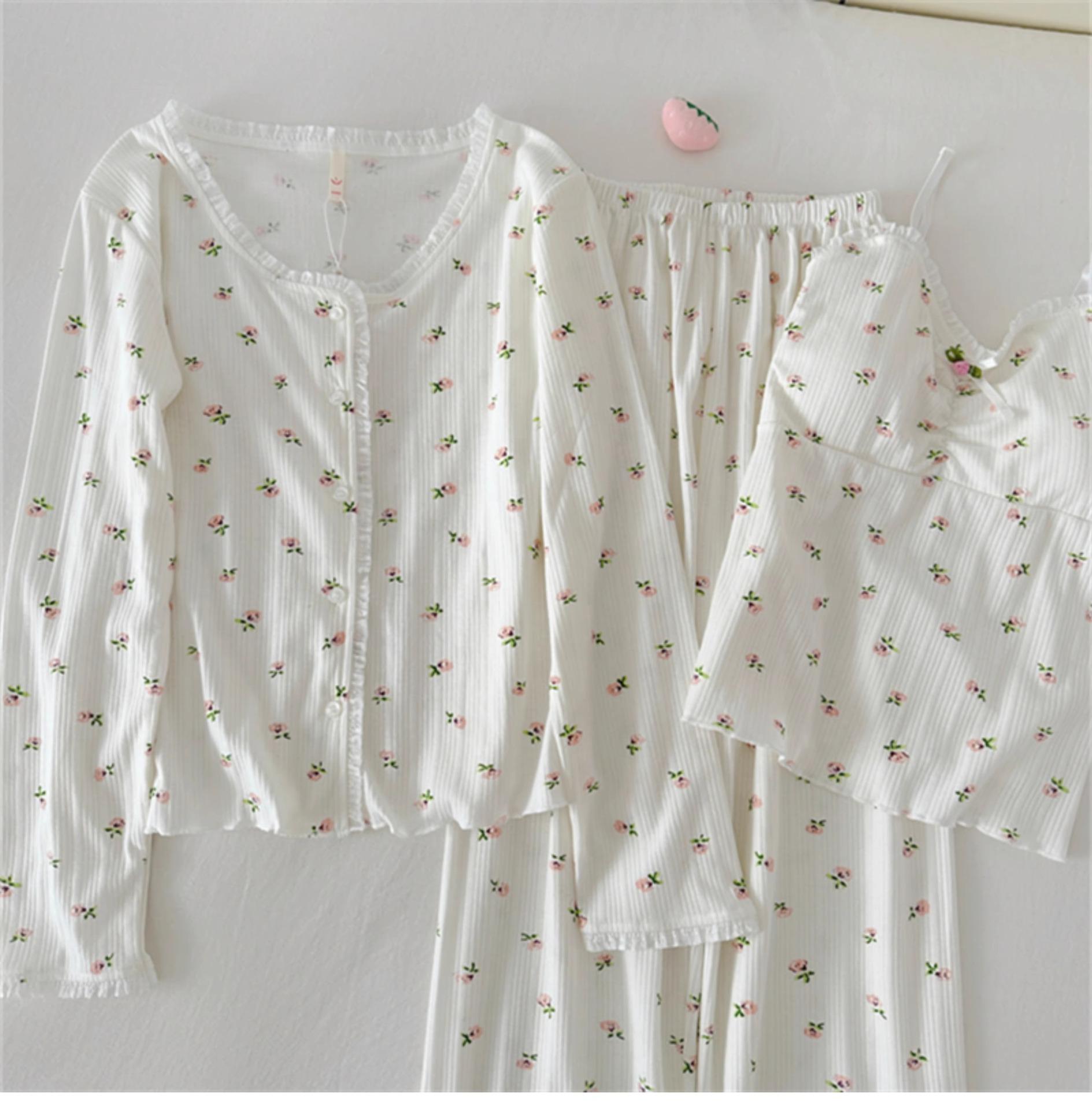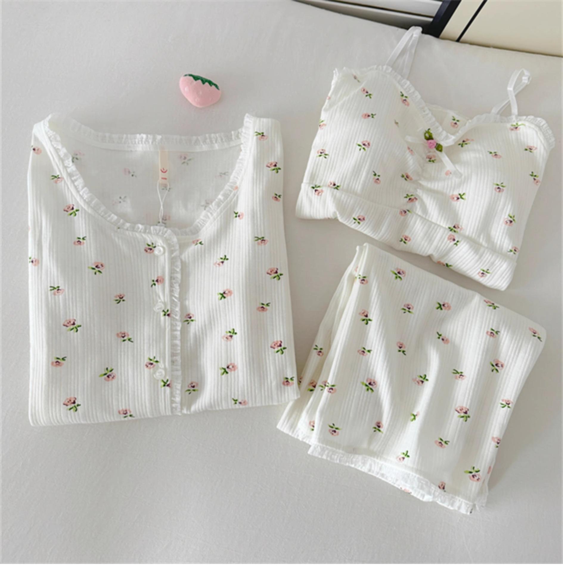 Pijamas de Primavera y Otoño para Mujer de Manga Larga Casual Estilo Coreano Dulce Floral Tirantes Ropa de Exterior Sexy de Tres Piezas para Casa