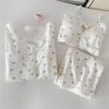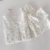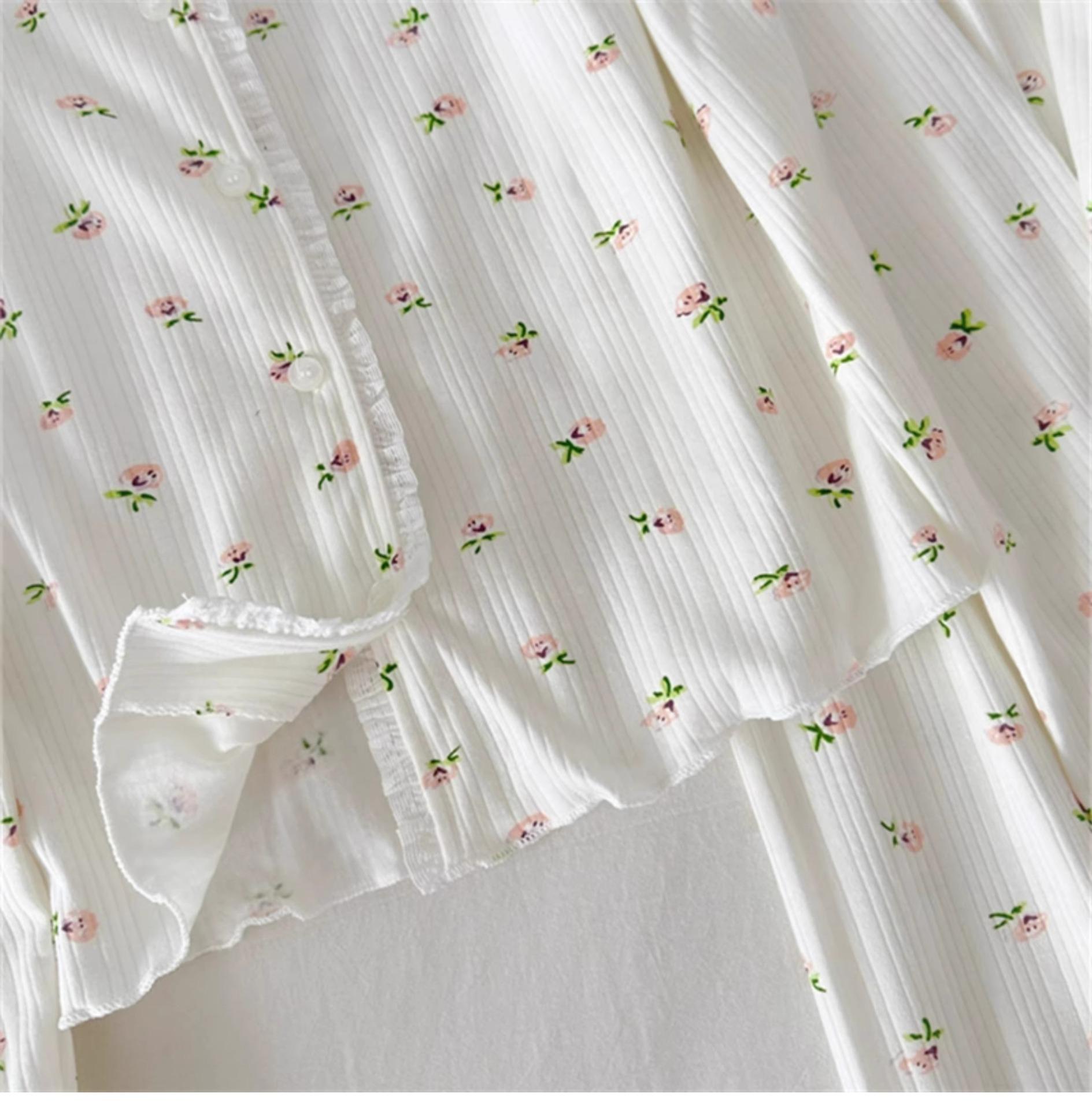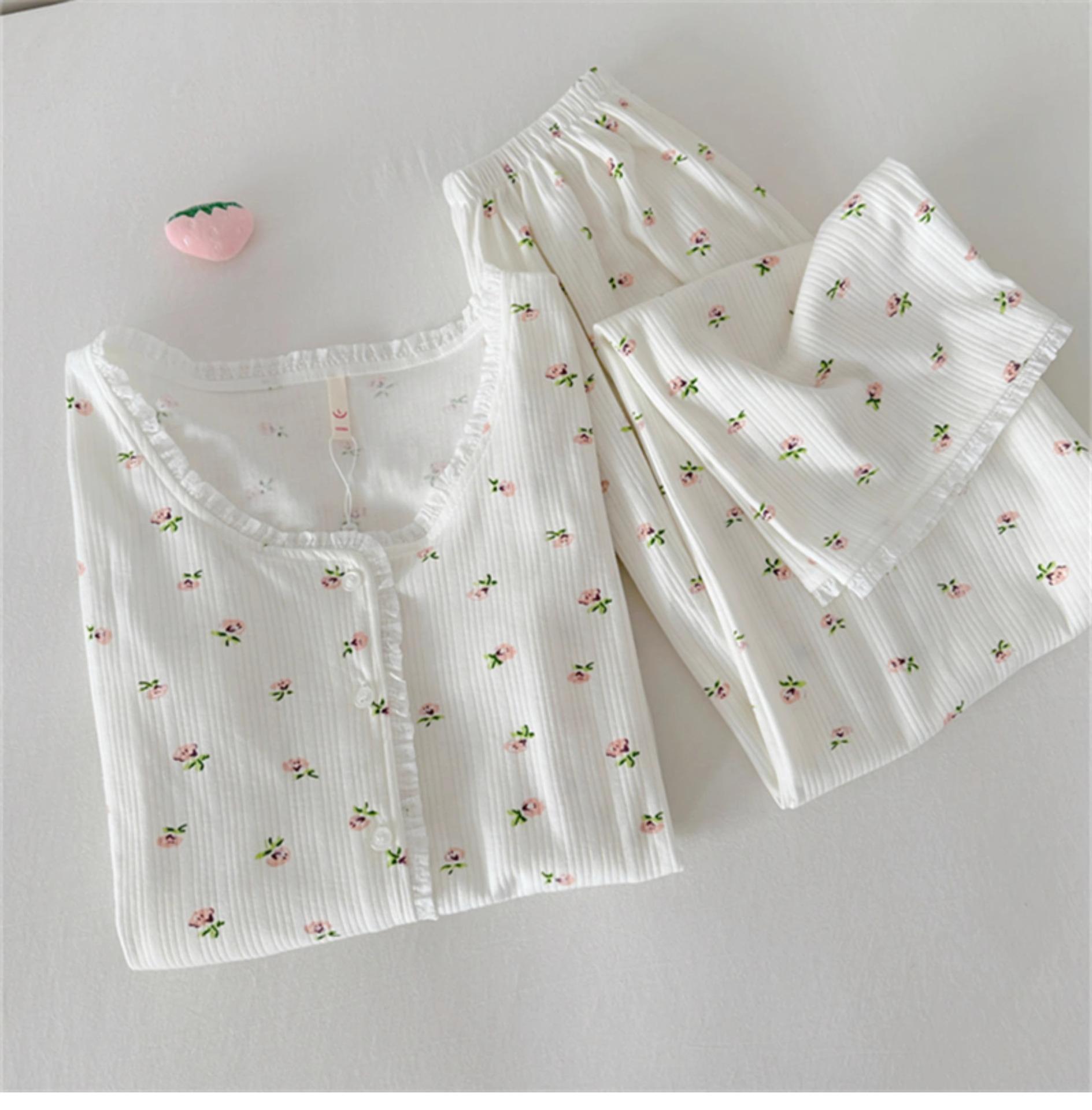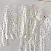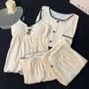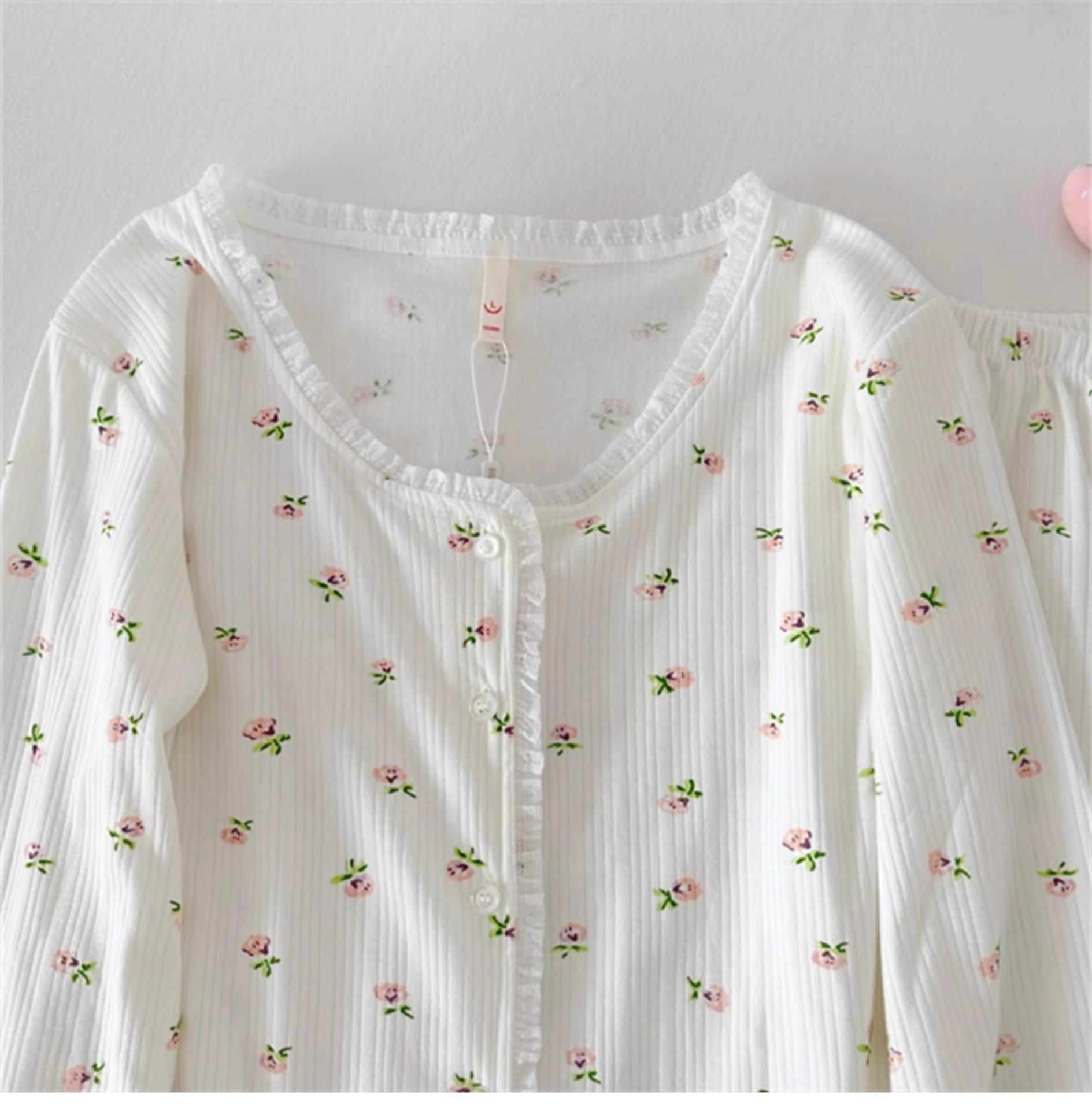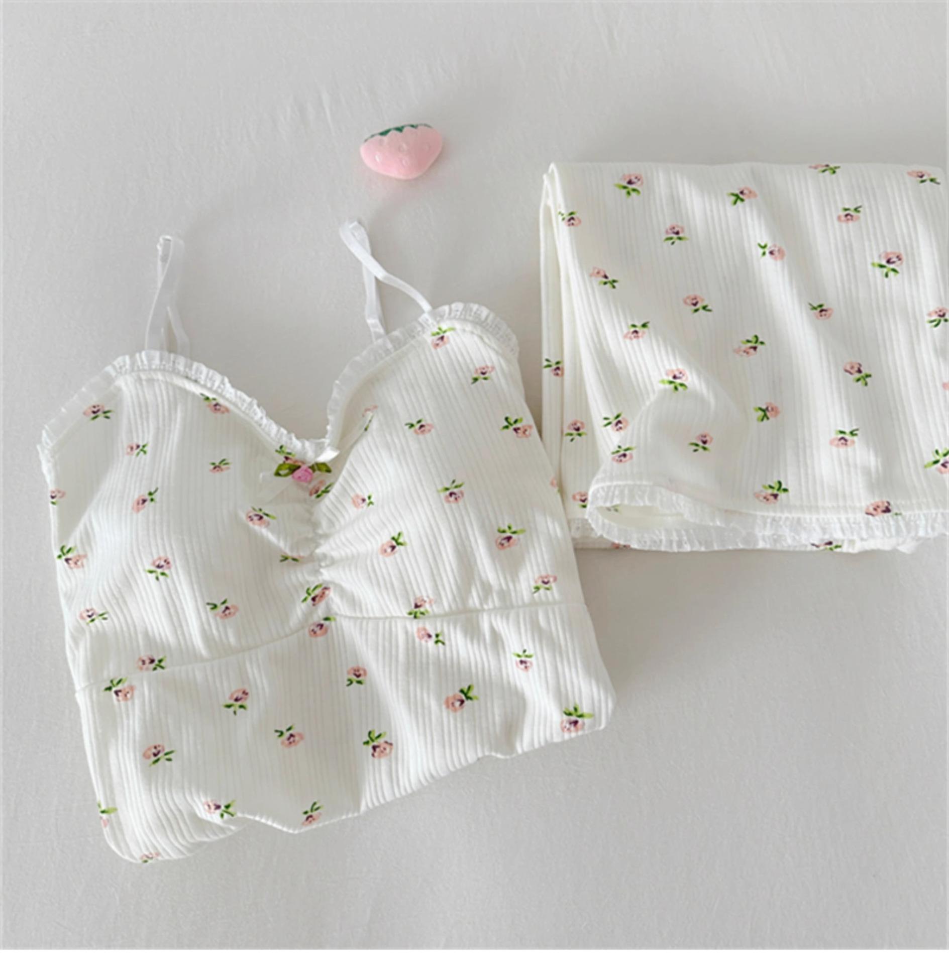 Pijamas de Primavera y Otoño para Mujer de Manga Larga Casual Estilo Coreano Dulce Floral Tirantes Ropa de Exterior Sexy de Tres Piezas para Casa