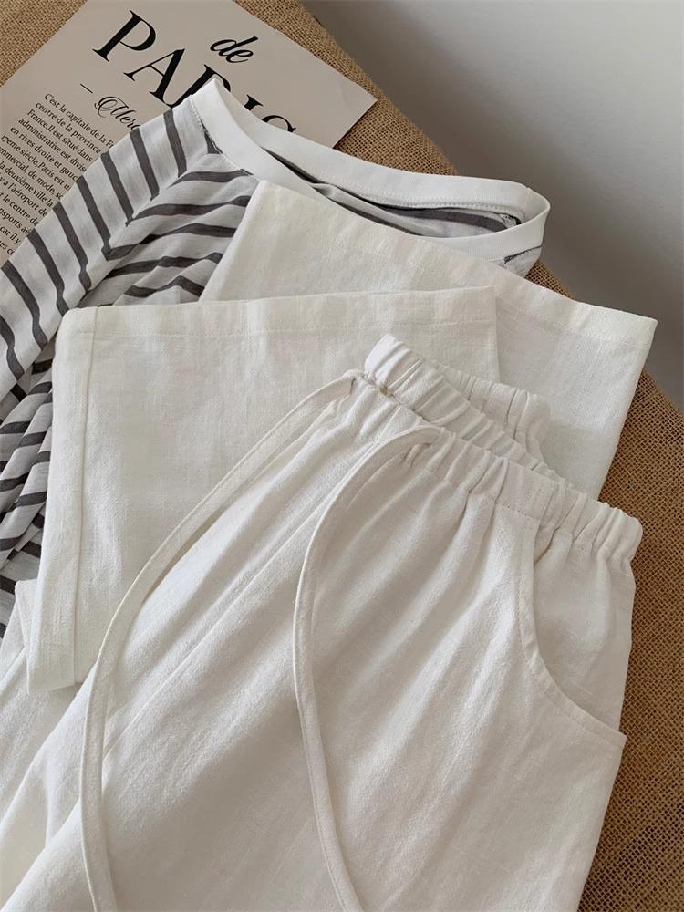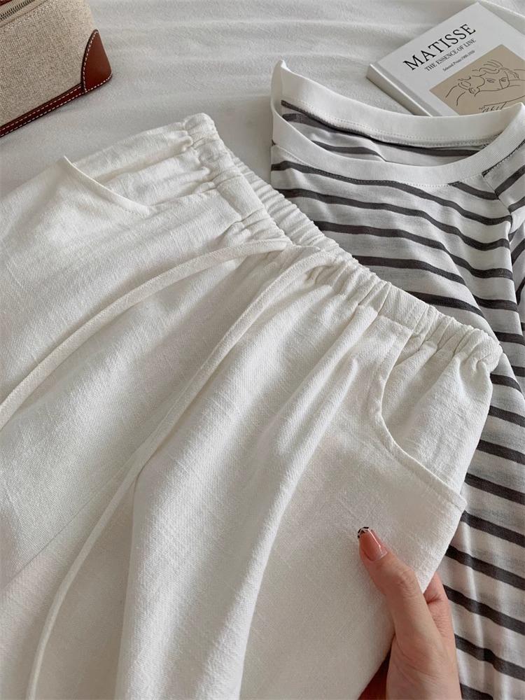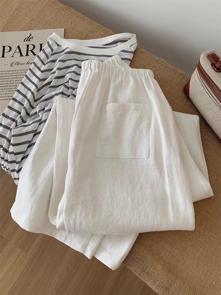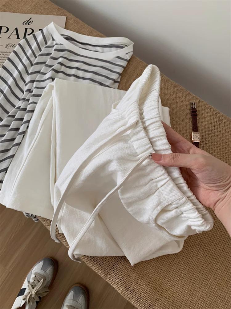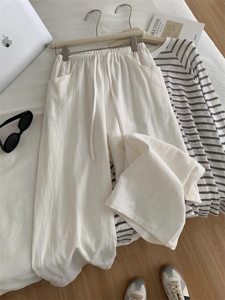 Pantalones elegantes de cintura alta, rectos, de algodón y cáñamo, blancos, para mujer, de otoño, holgados, informales, adelgazantes, con cordones y pernera ancha.
