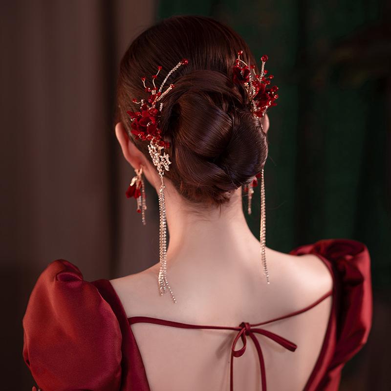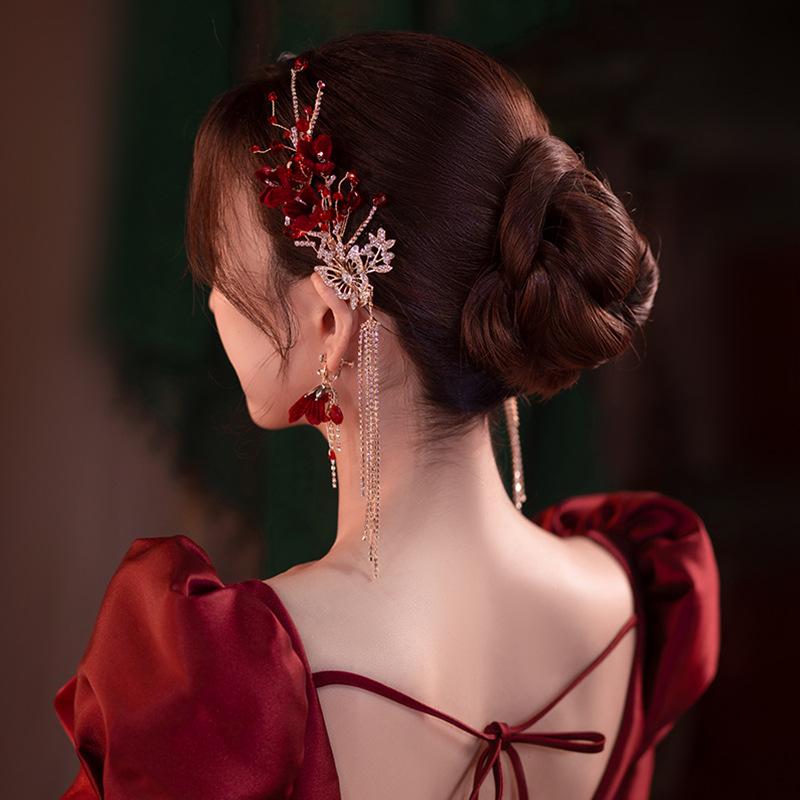 Nueva prenda nupcial romántica de estilo coreano para brindis, carillón de viento de terciopelo, flor, borla de cristal, horquilla con forma de clip lateral, accesorios para la cabeza