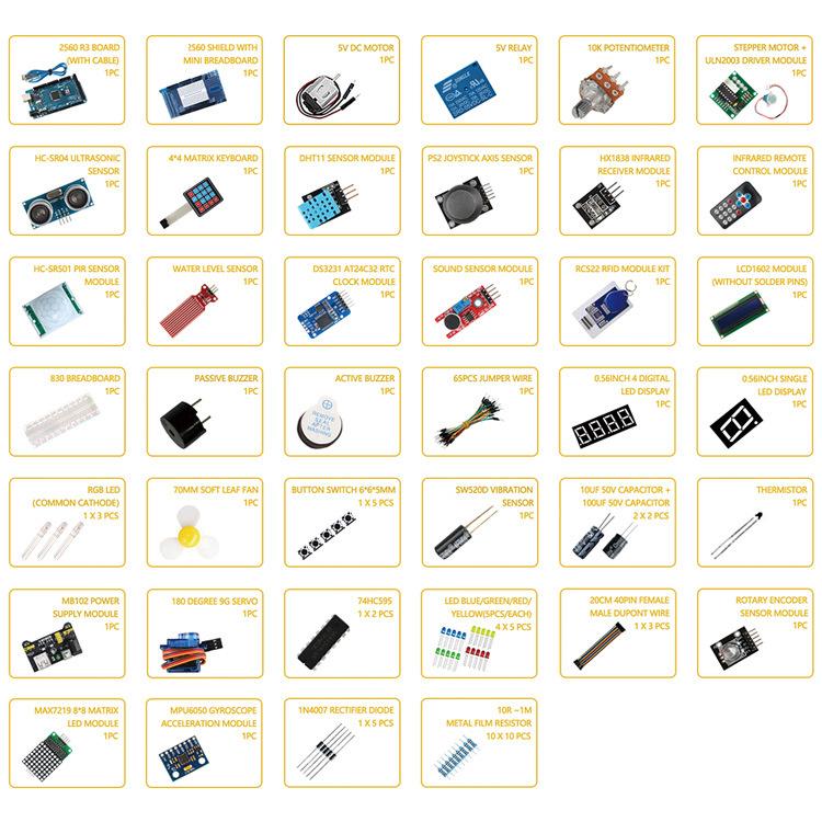 Tamaño del embalaje de un solo producto: 15X10X10 cm Peso bruto de un solo producto: 0.990 kg Embalaje: bolsa antiestática sellada, embalaje de cartónDescripción del Productodescribir:Este kit educativo basado en la plataforma Mega 2560 es para principiantes interesados en comenzar a programar.Este kit de proyecto viene con todo lo que necesitas para empezar en STEM. Atendemos tus servicios OEM/ODM personalizados.