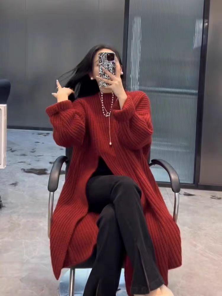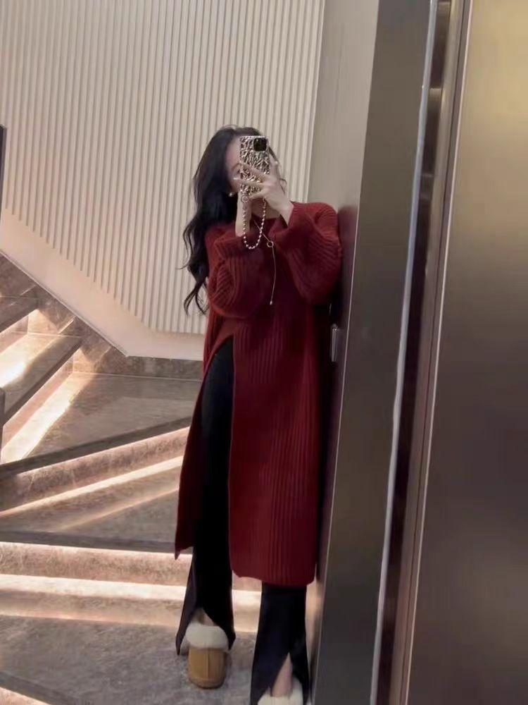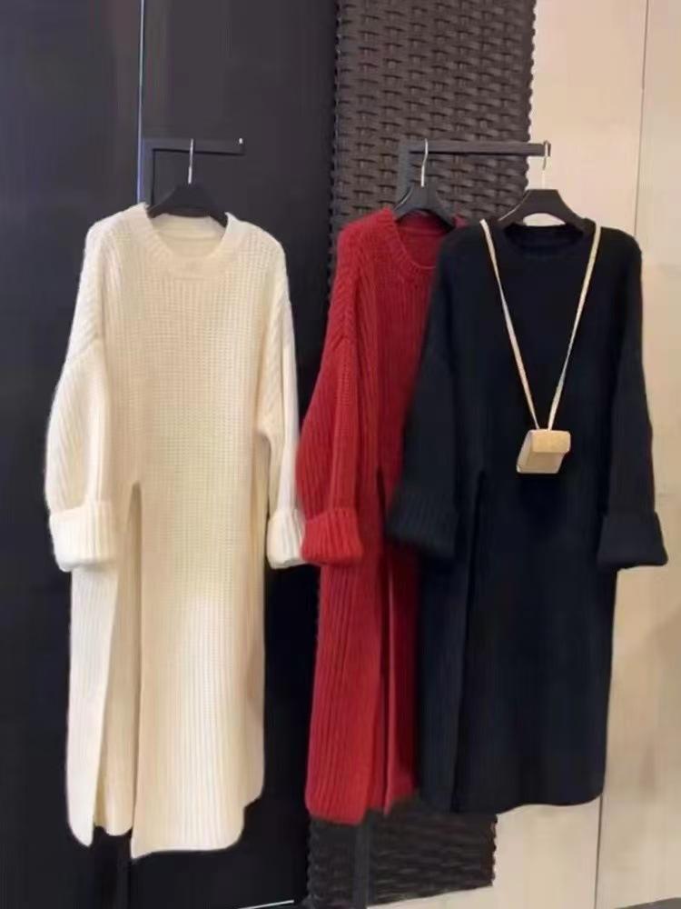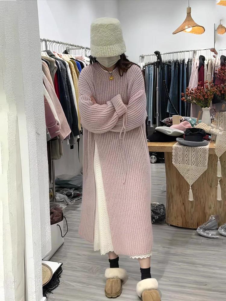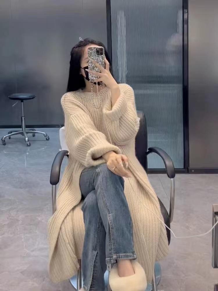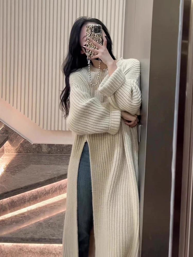 Suéter estilo coreano estilo holgazán para mujer 2024 primavera y otoño nuevo jersey holgado abertura lateral sobre la rodilla falda tejida midi