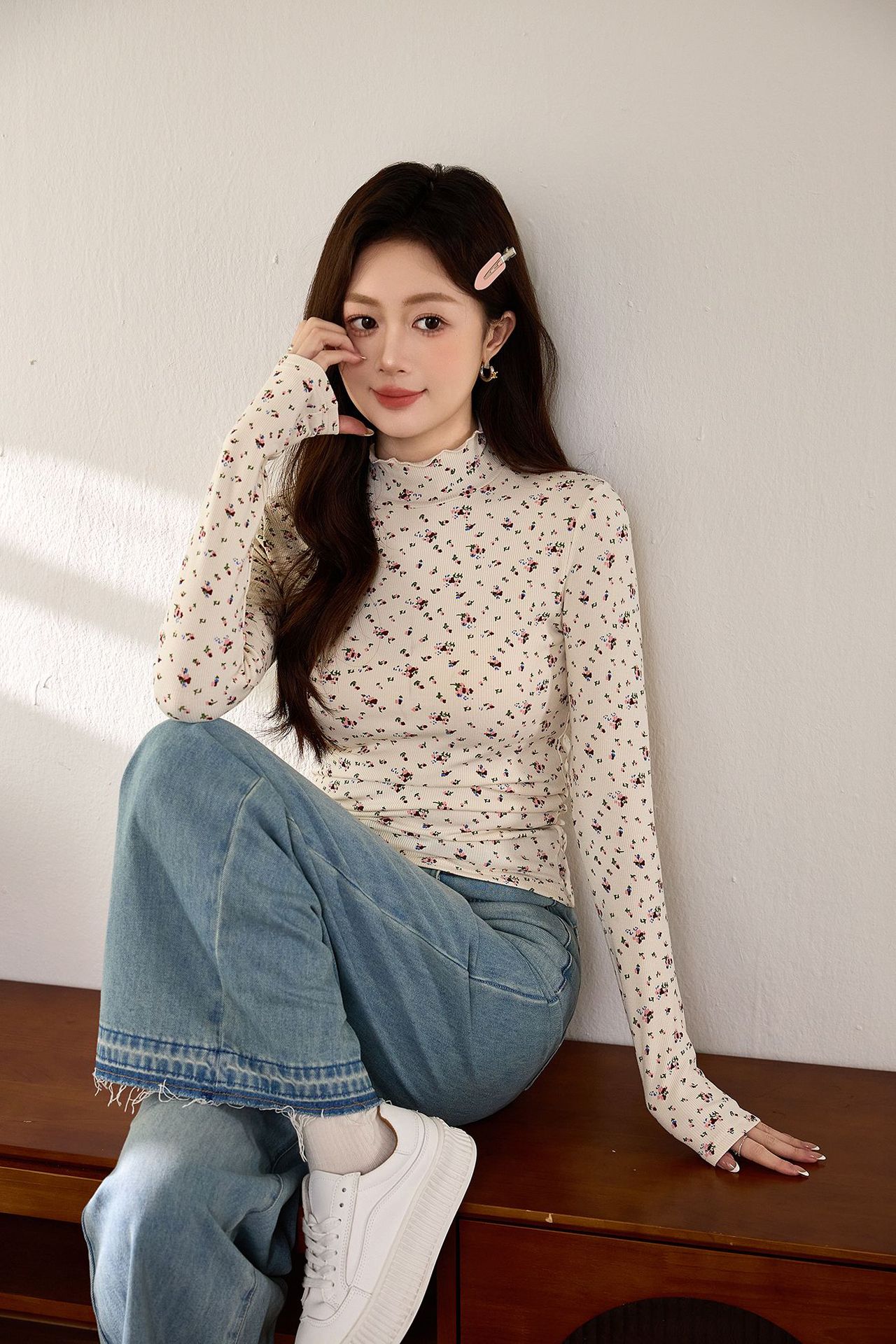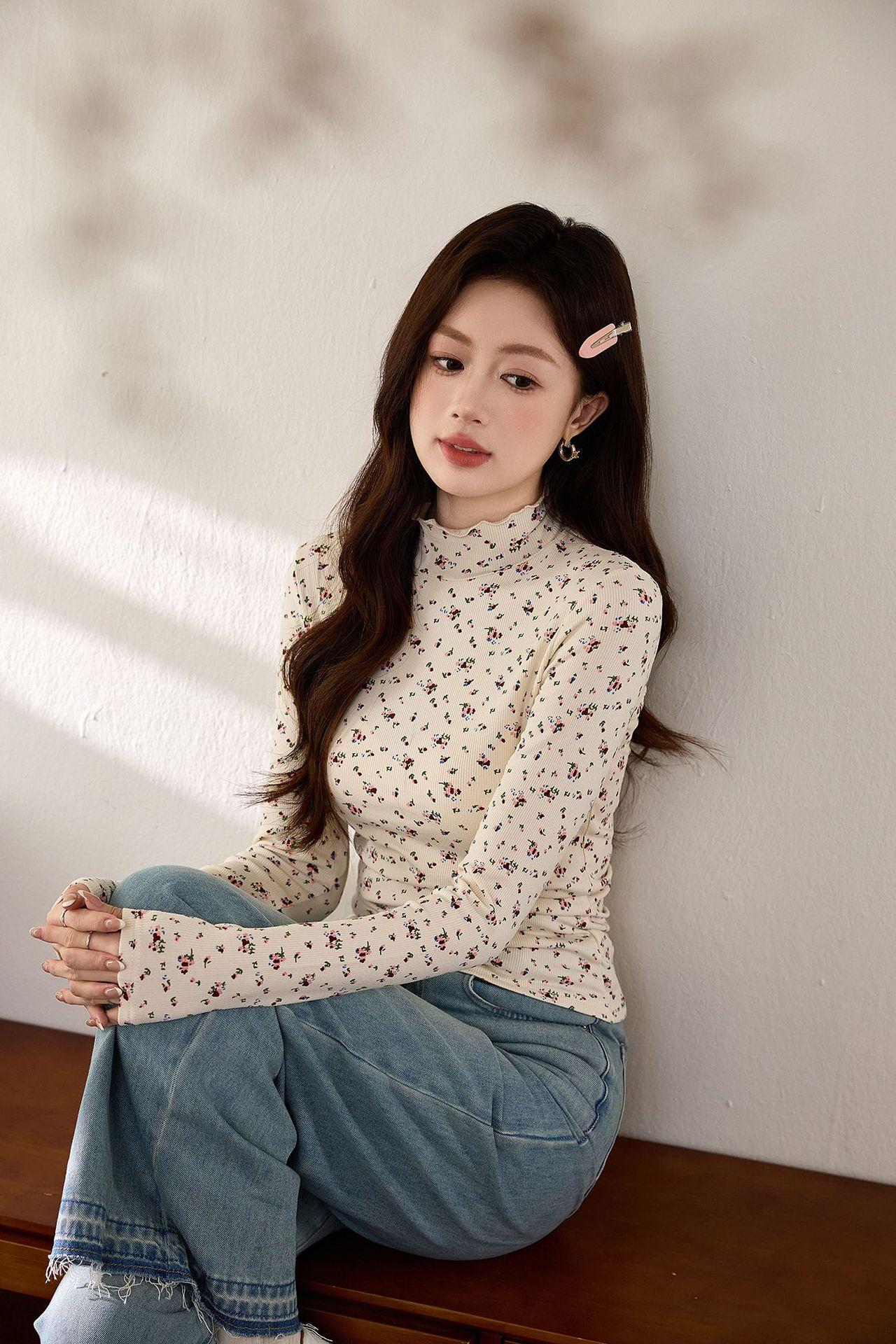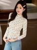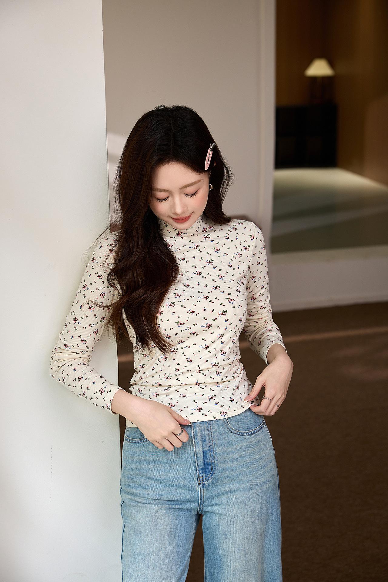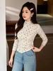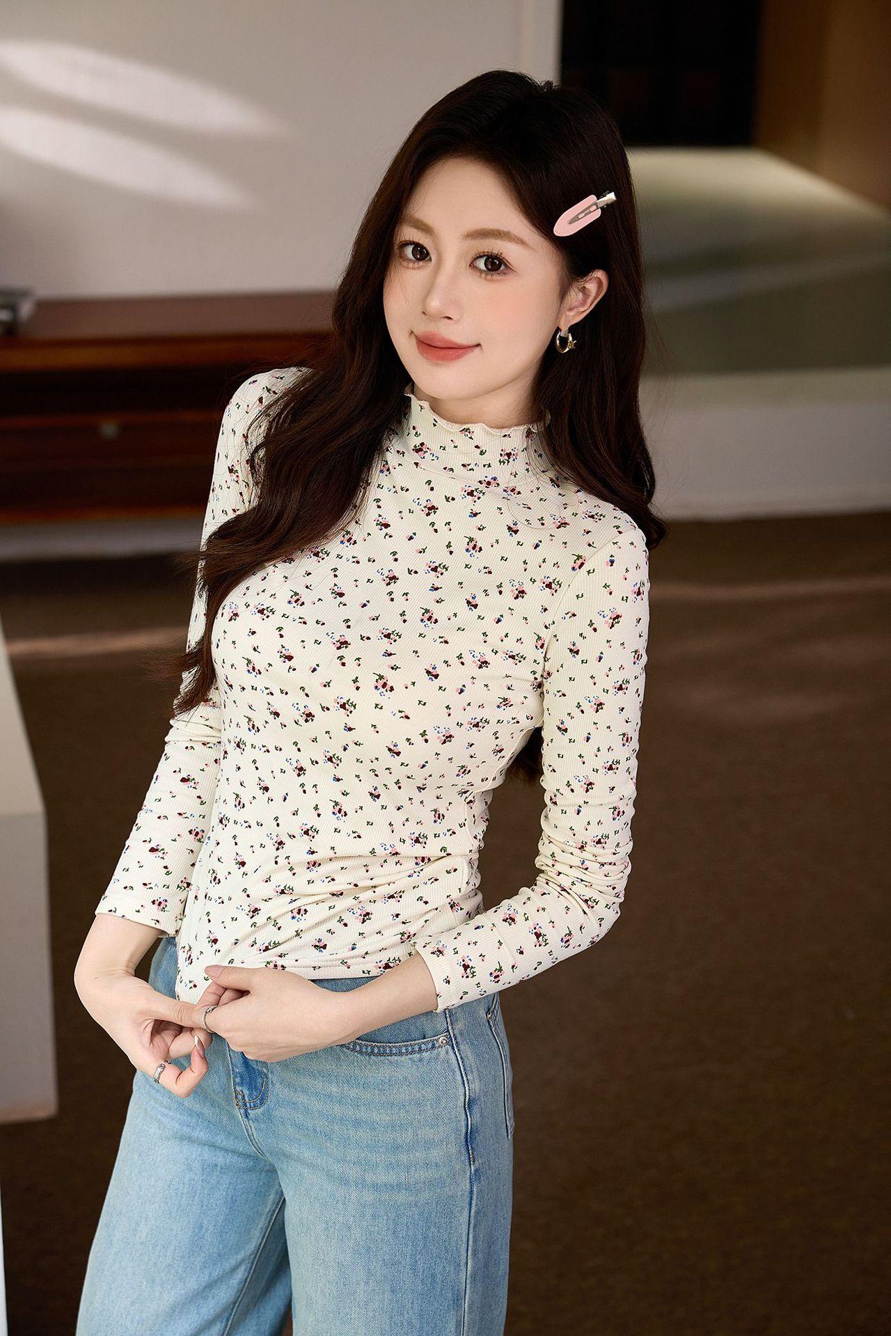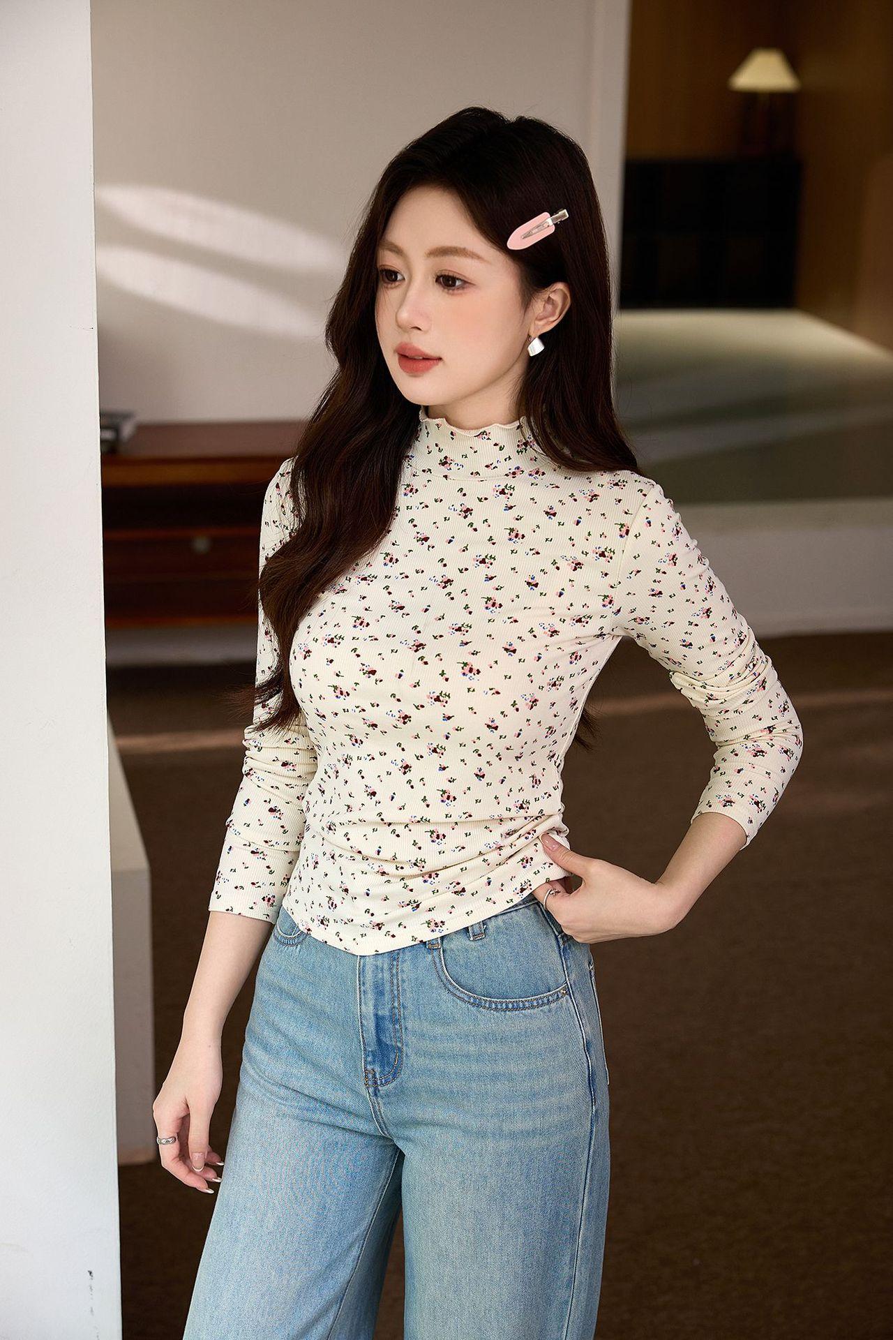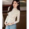 # Seleccionar Productos de Alta Calidad # Camiseta de Terciopelo Cepillado para Mujer Floral 2025 Otoño e Invierno Nuevo Top de Manga Larga Cuello Alto Camisa Básica