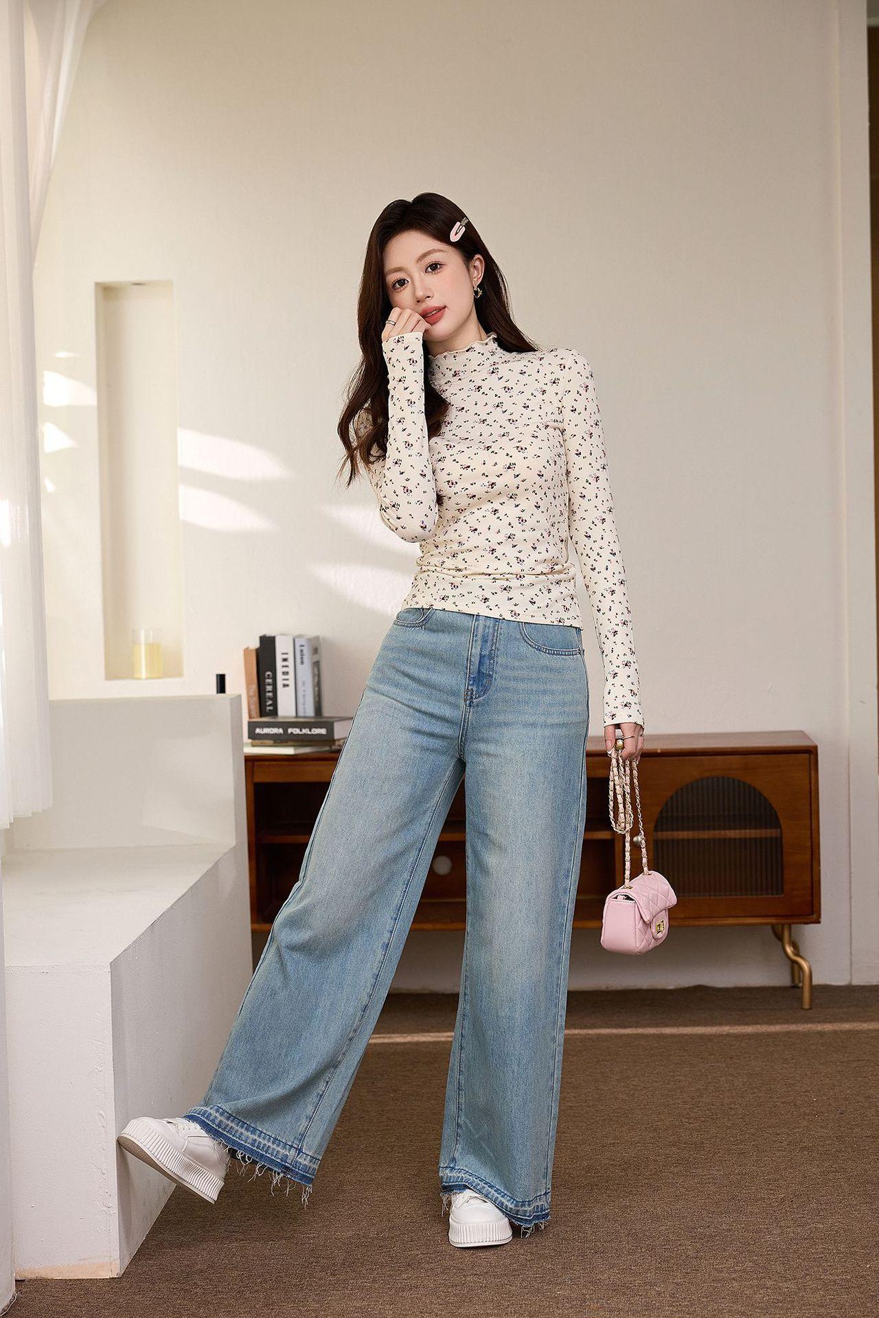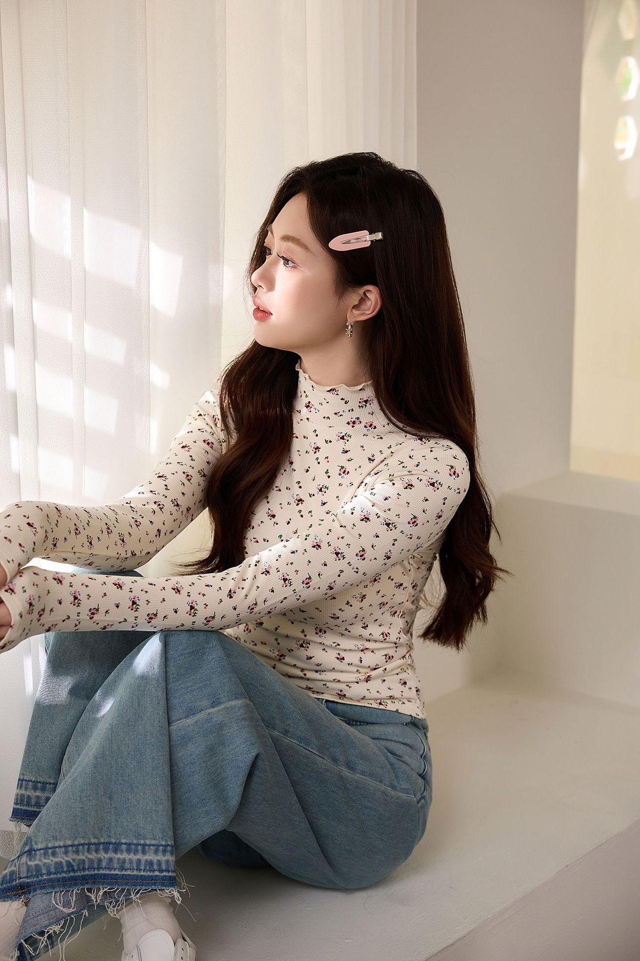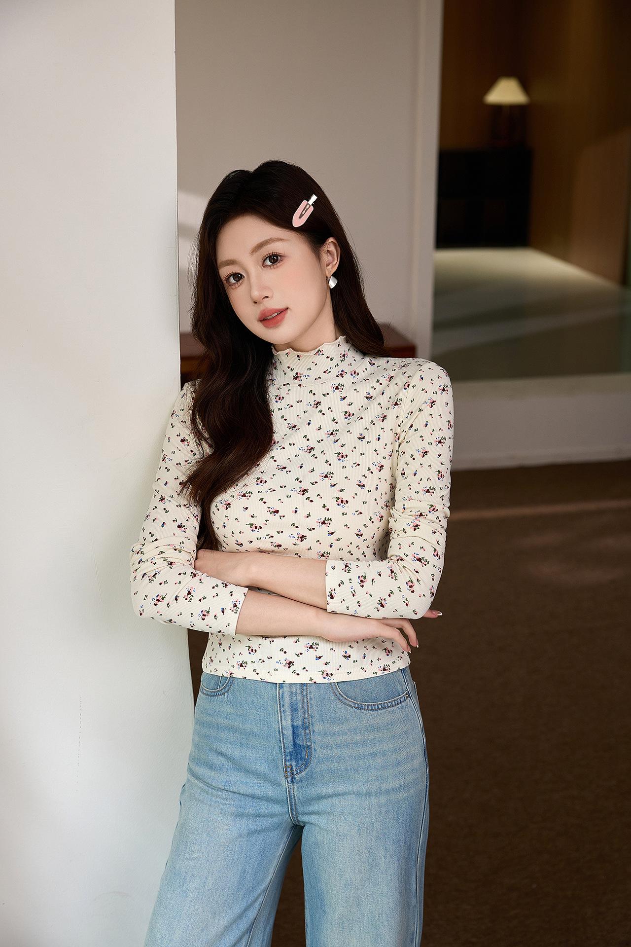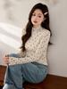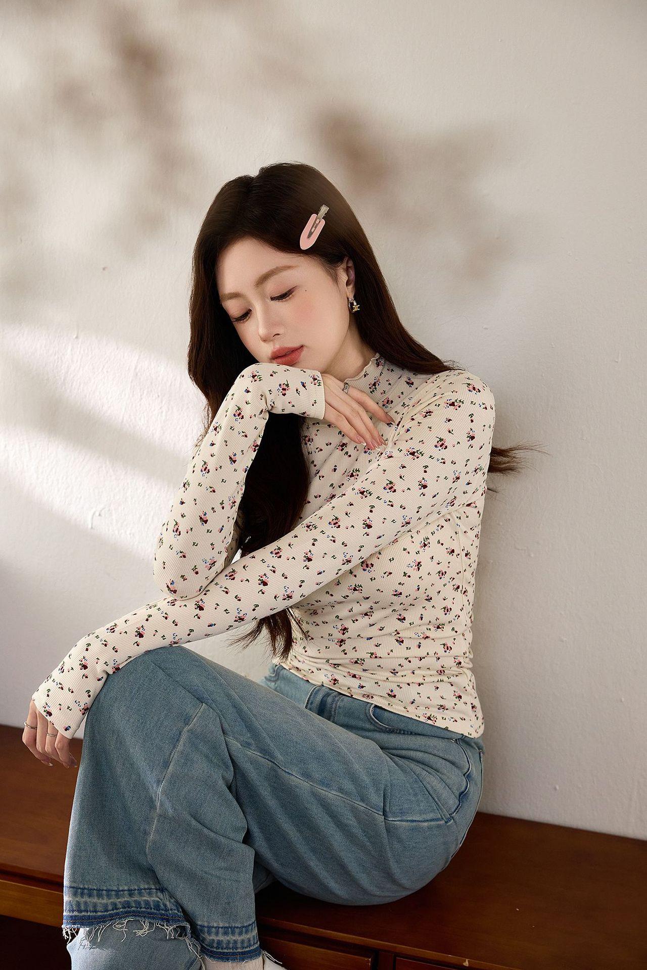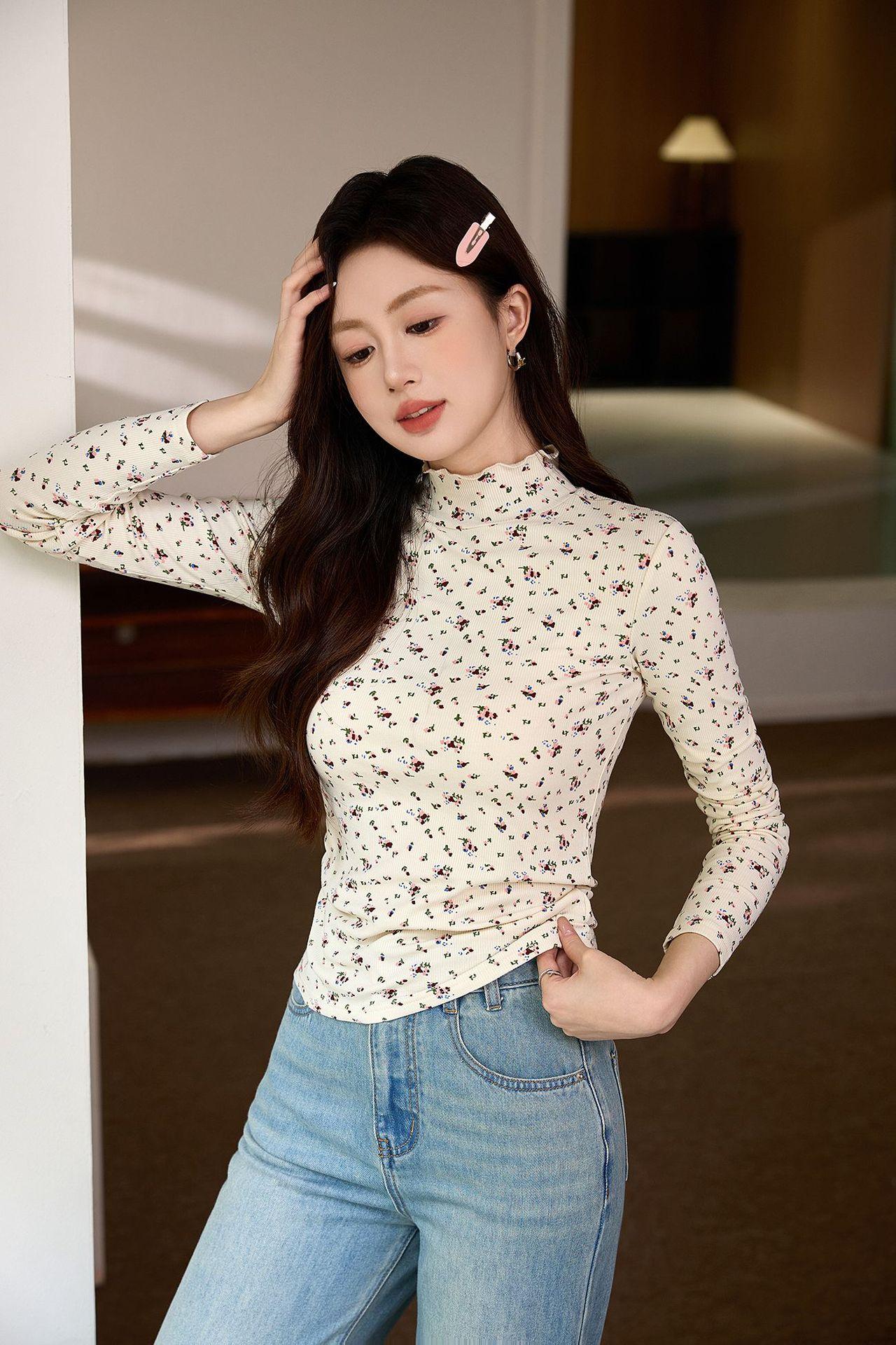 # Seleccionar Productos de Alta Calidad # Camiseta de Terciopelo Cepillado para Mujer Floral 2025 Otoño e Invierno Nuevo Top de Manga Larga Cuello Alto Camisa Básica