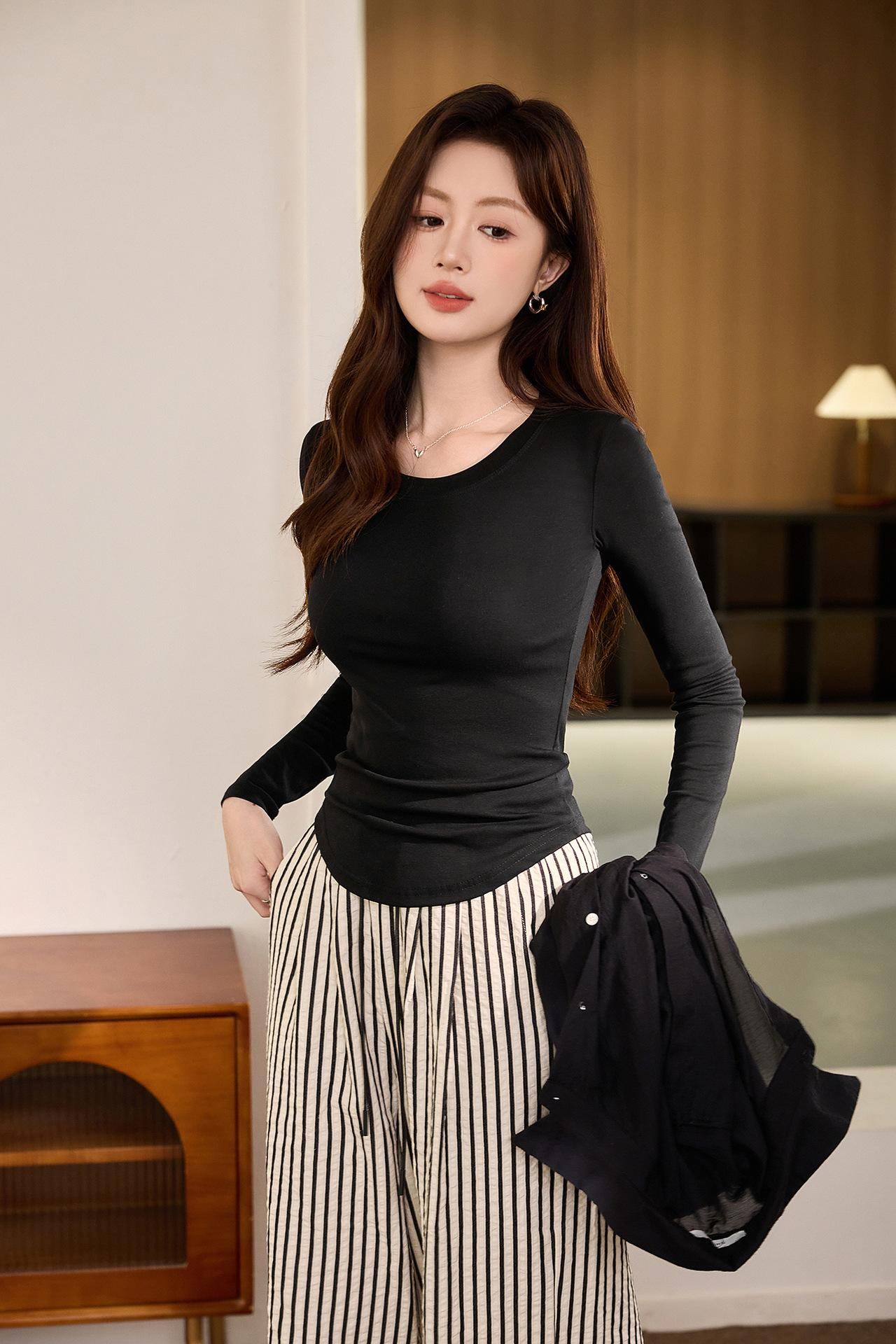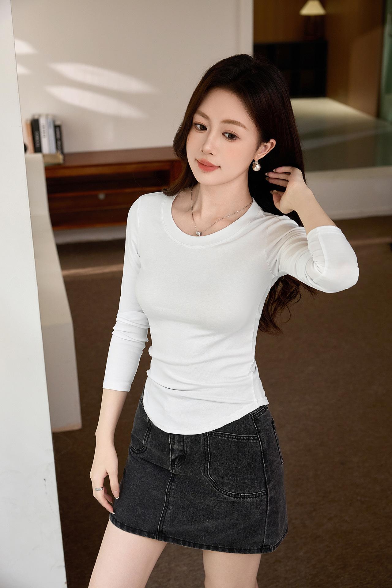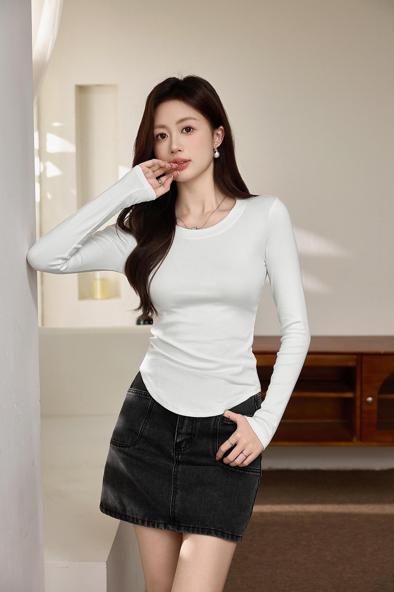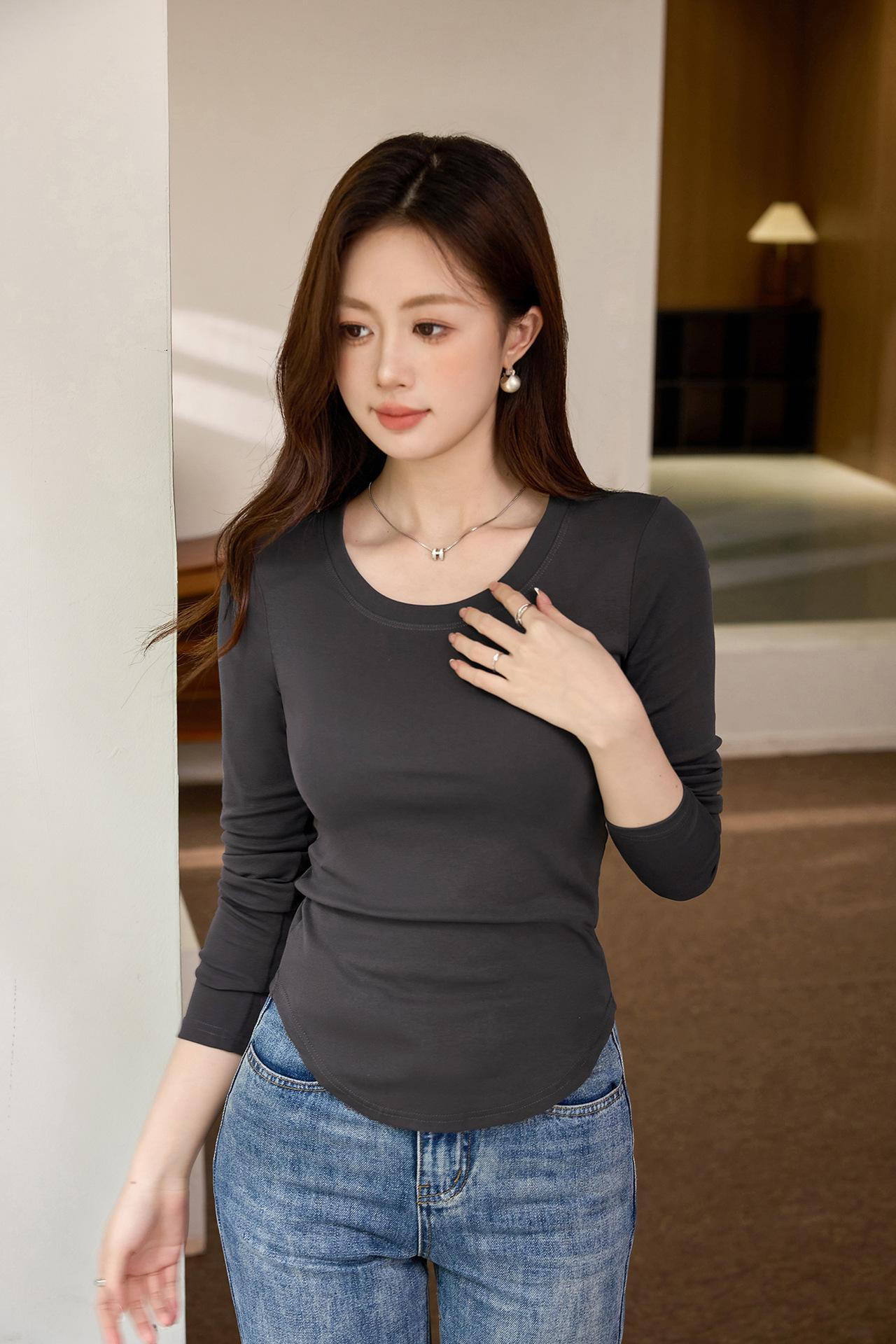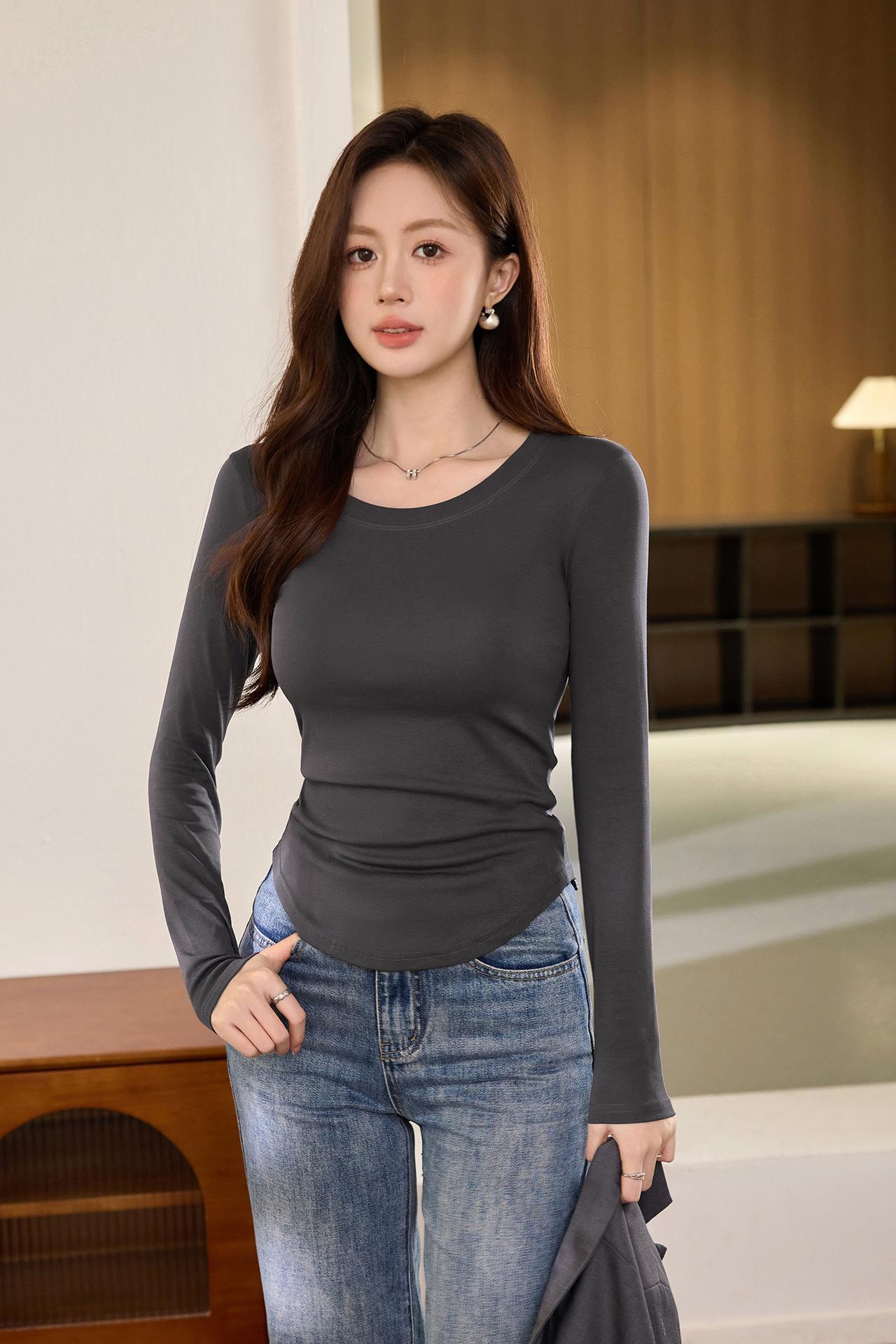 # Seleccionar Algodón Puro # Camiseta de Cuello Redondo de Manga Larga para Mujer Otoño 2025 Nuevo Asimétrica Curvada Slim Slim Camiseta Básica