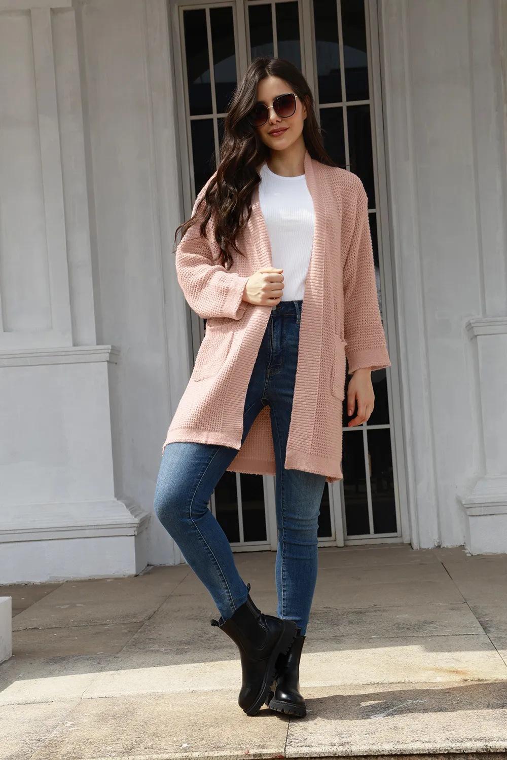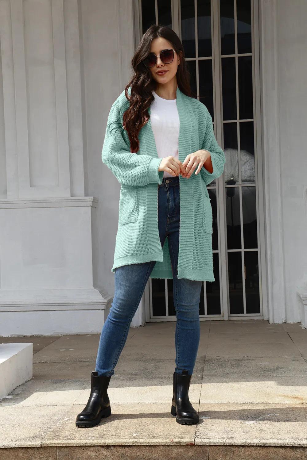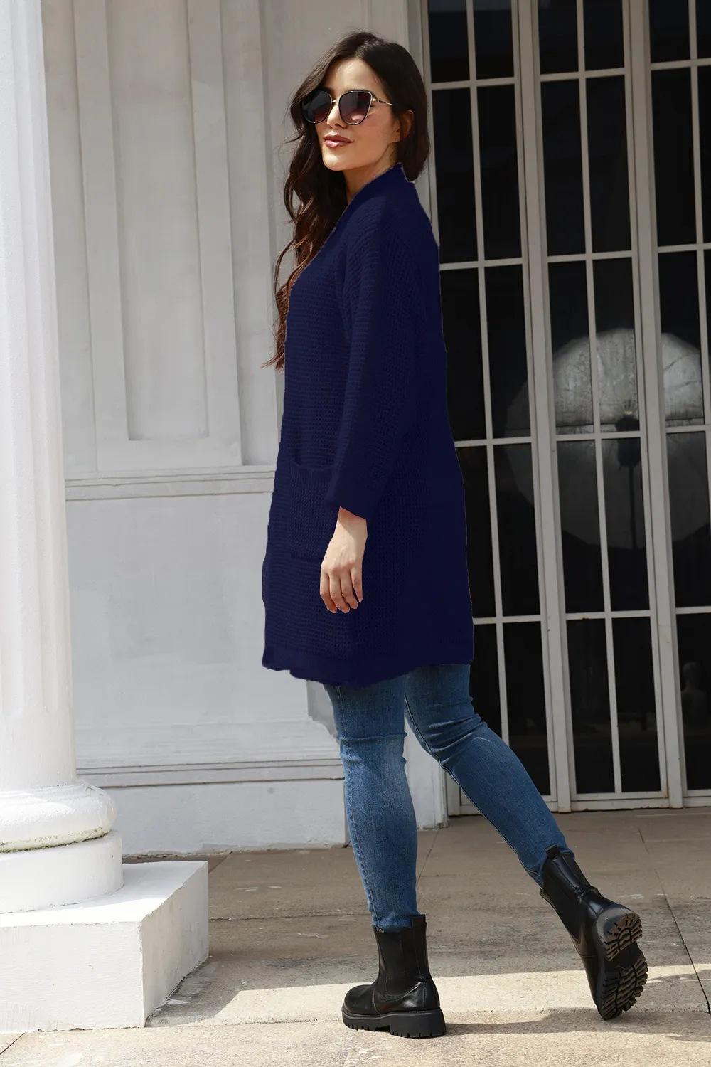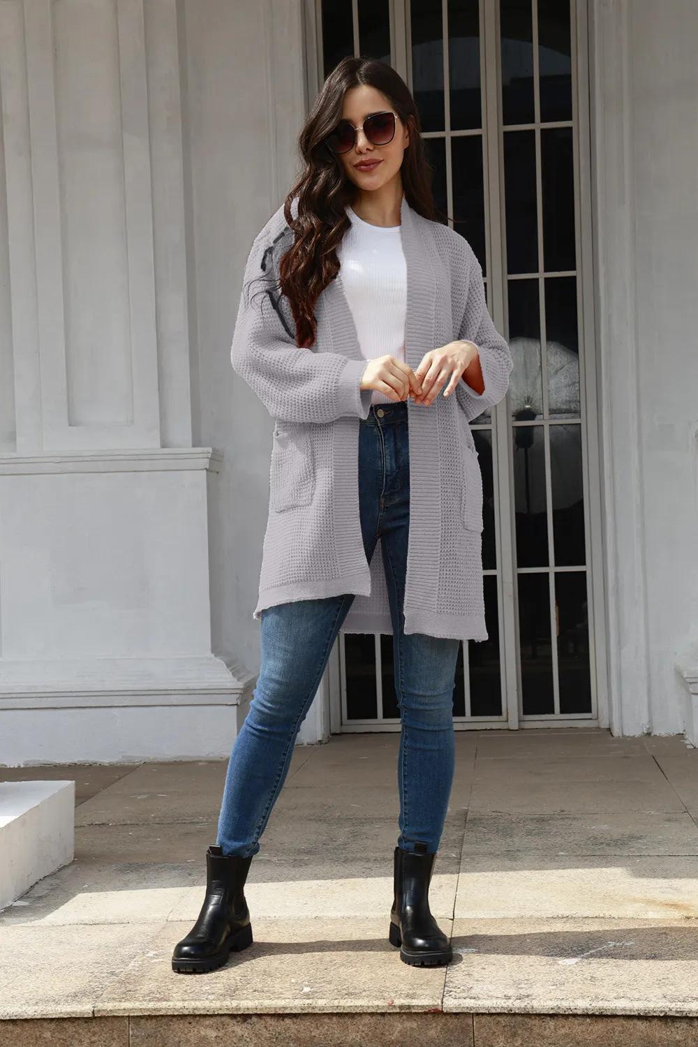 Suéter holgado de otoño e invierno para mujer, abrigo largo con bolsillo, cárdigan de manga larga de color sólido con borde cruzado para mujer de Europa y América