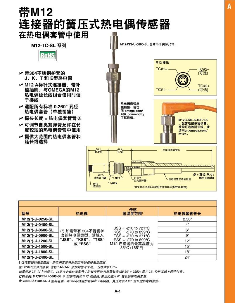 M12JSS-U-0900-SL | Termopar tipo J sin conexión a tierra, con resorte en termopozo de 9,00" de longitud |