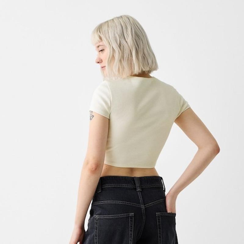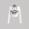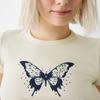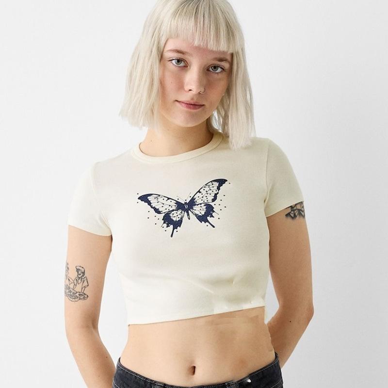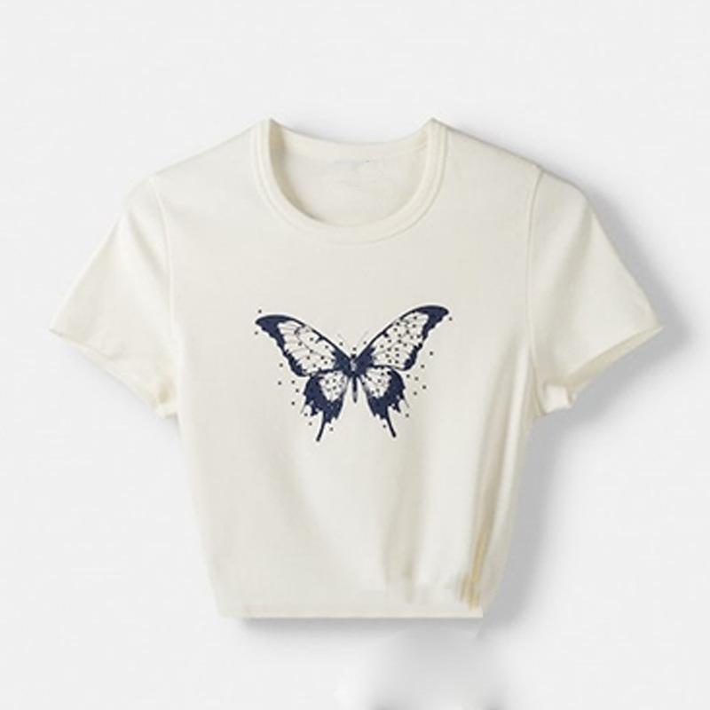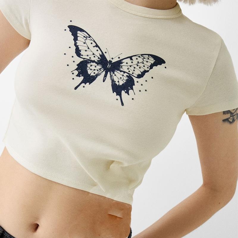 2024 Nuevo ins moda casual estampado de mariposa pedrería ajuste ceñido verano y otoño moderno camiseta de punto de cuello redondo para mujer