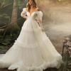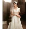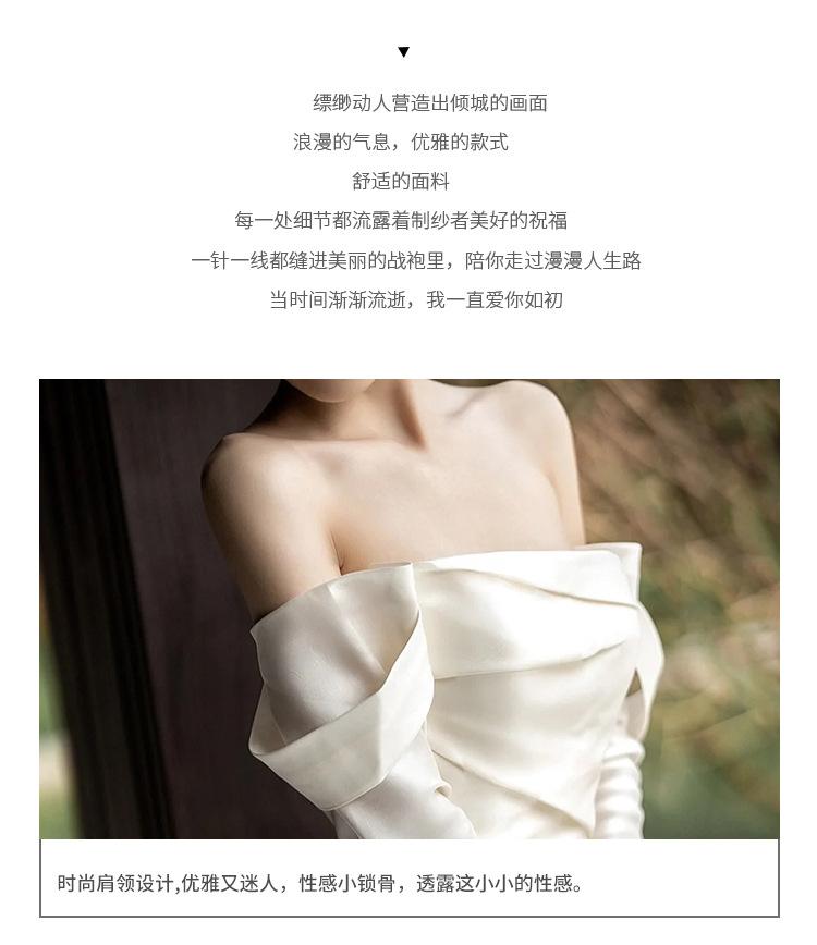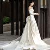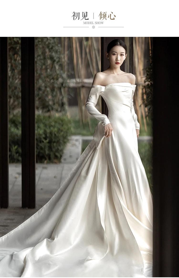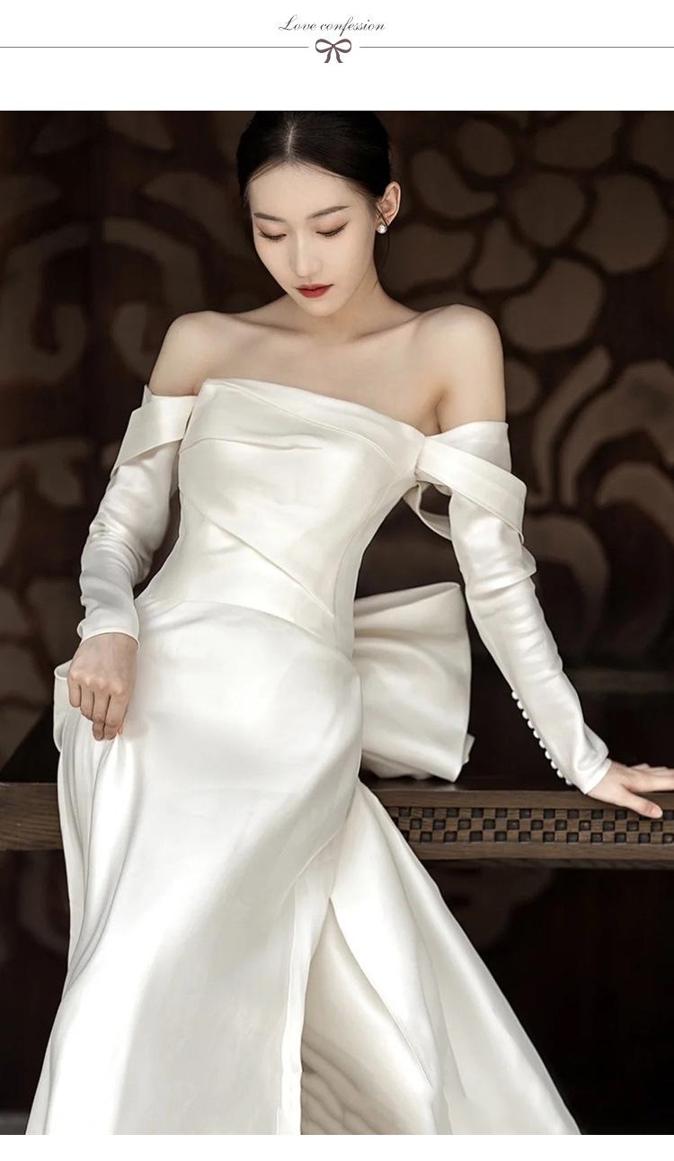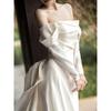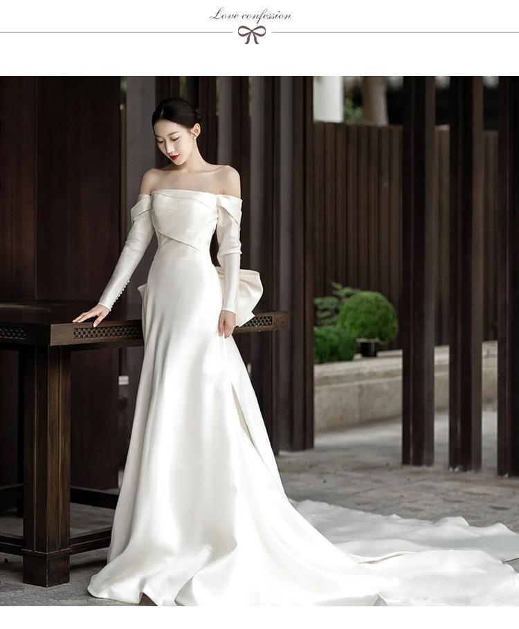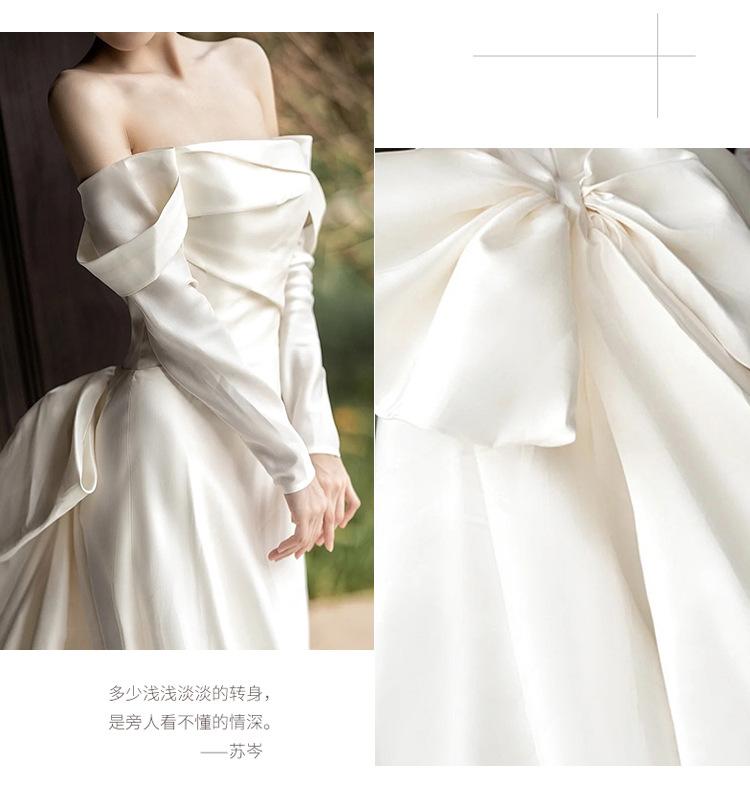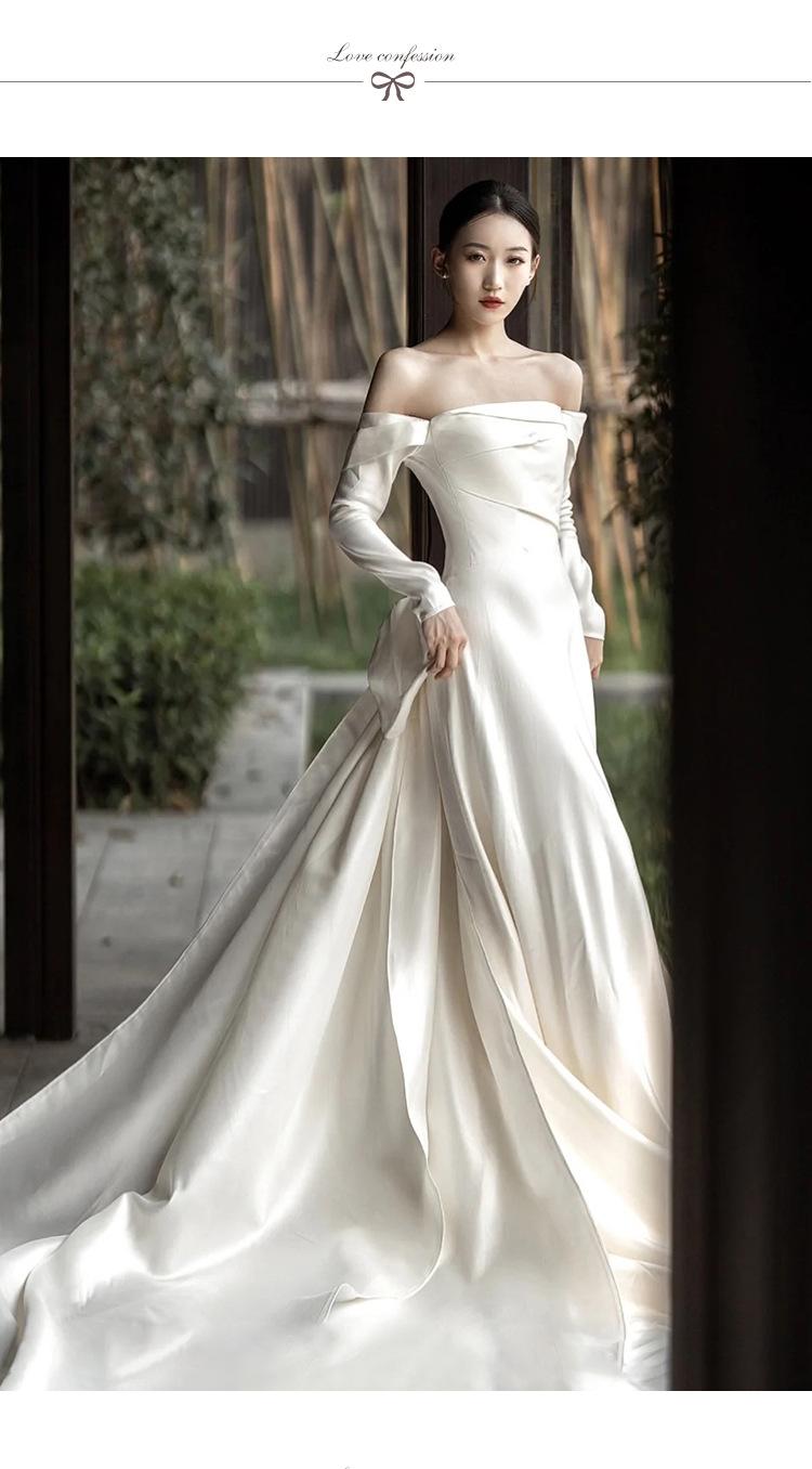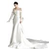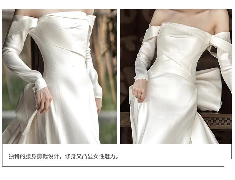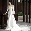 Vestido de Novia Ligero de Manga Larga con Hombros Descubiertos Satén Hilo Principal Lujo Ligero de Gama Alta Hilo para Salir Francés Cola Larga Vestido de Novia