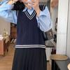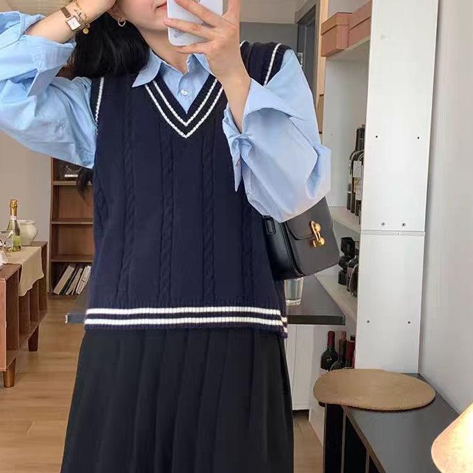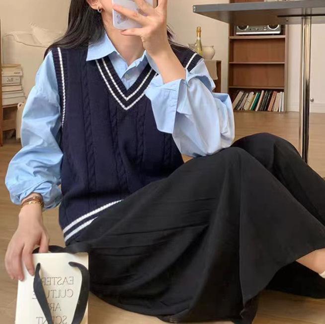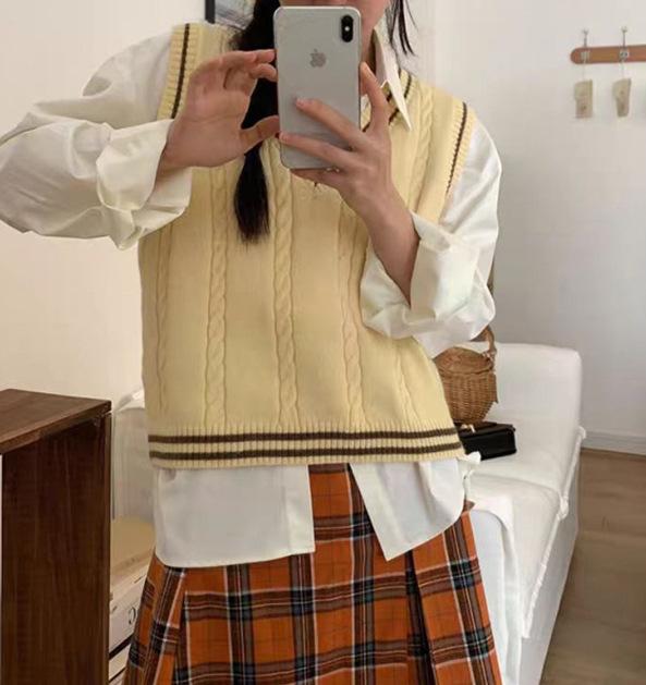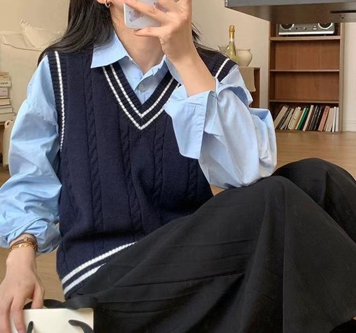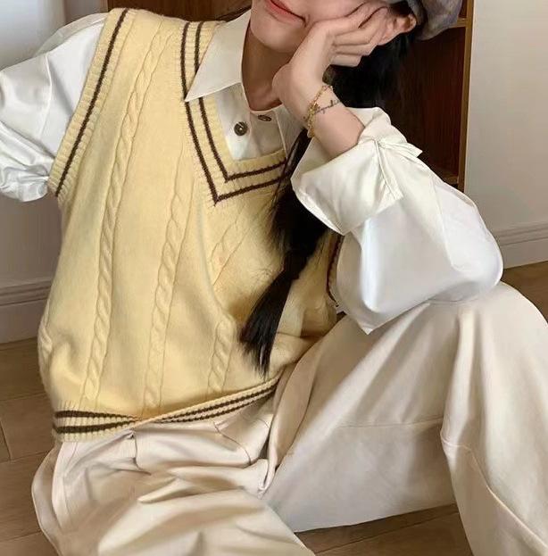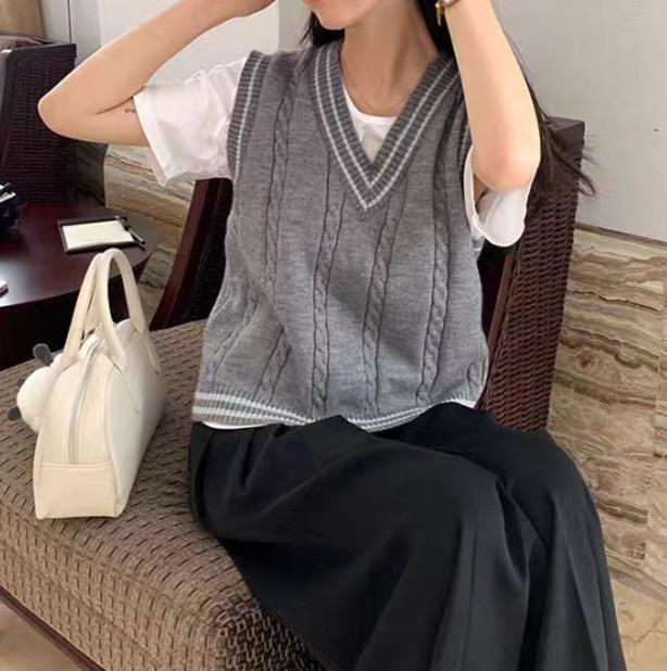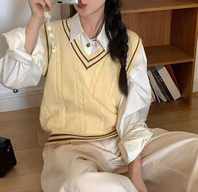 Chaleco Estilo Universitario para Mujer Nuevo Otoño e Invierno Chaleco Suéter para Mujer Exterior de Punto con Hombros Apilados