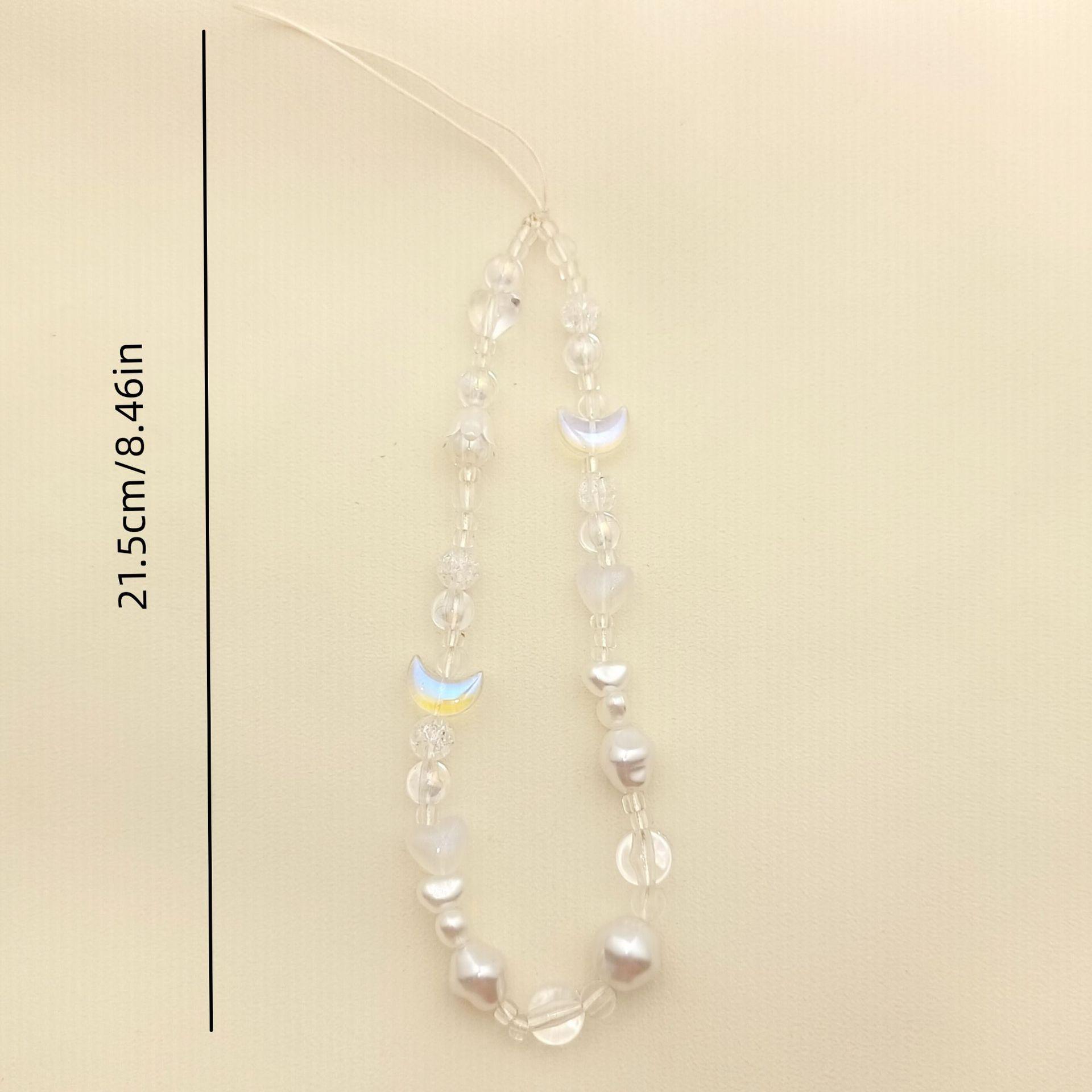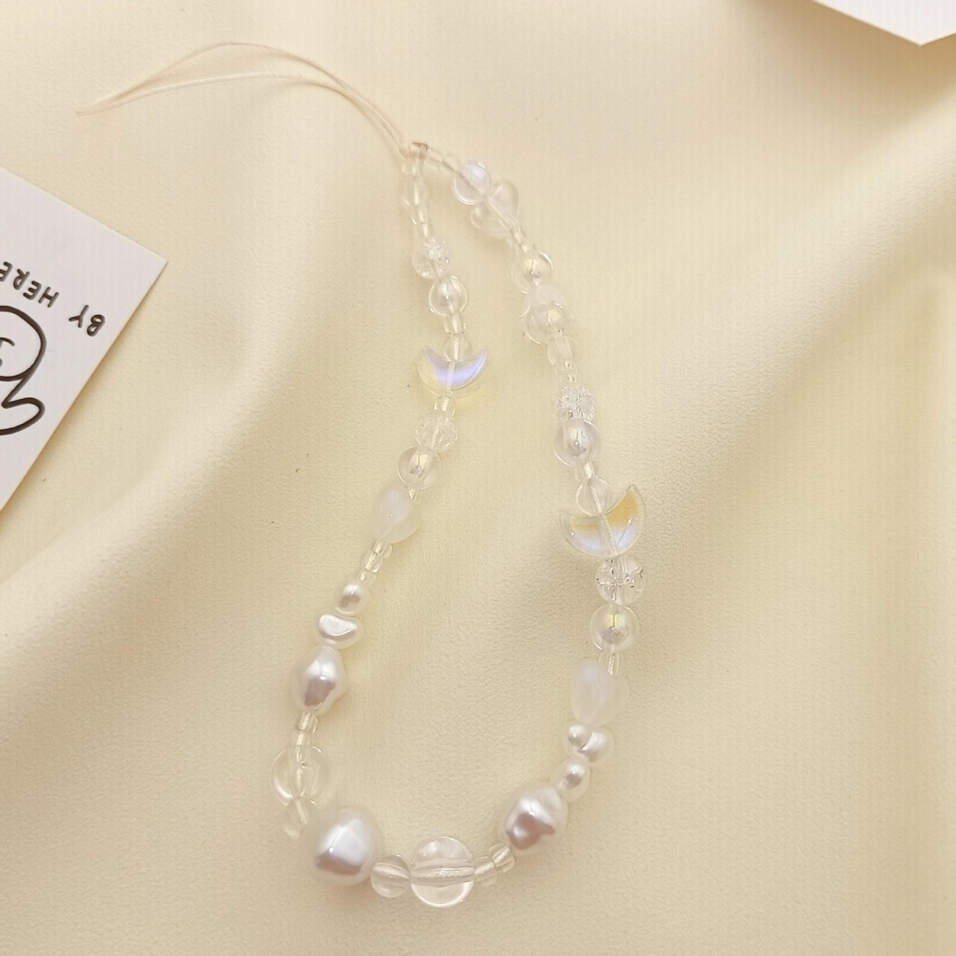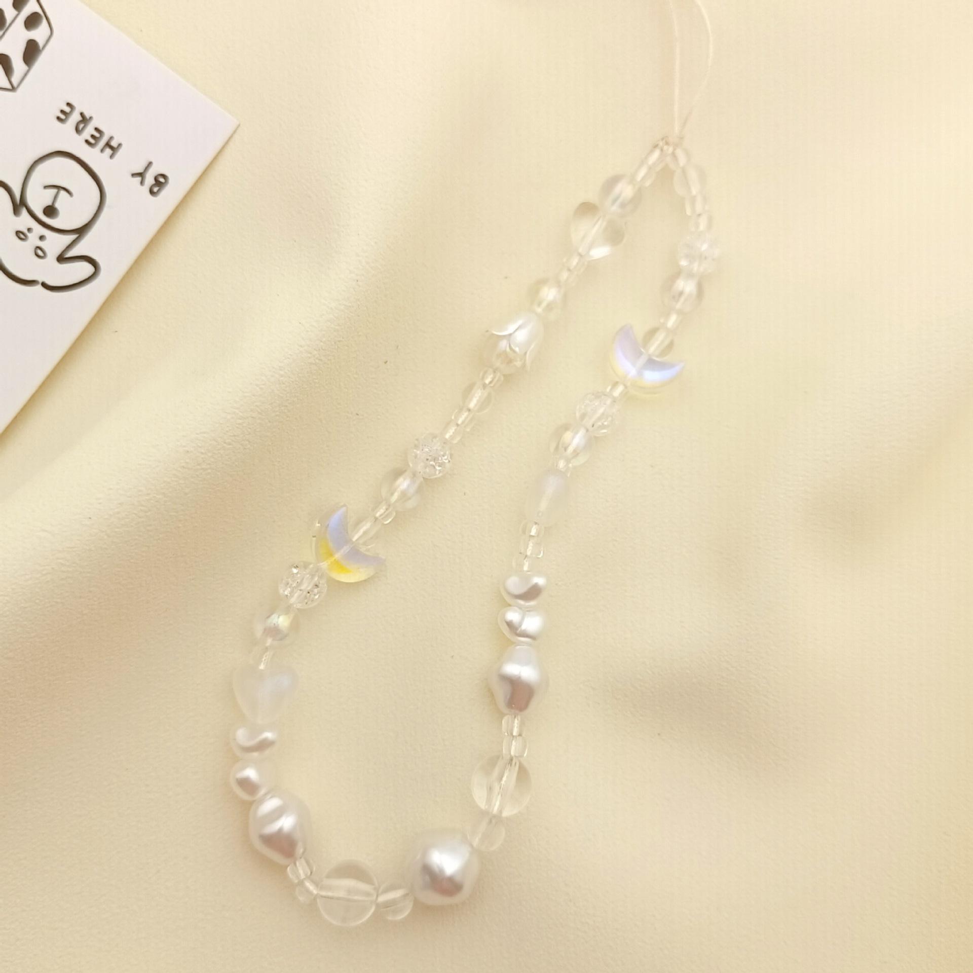 Nueva cadena para teléfono móvil hecha a mano con cuentas, colgante de cordón simple de media luna transparente blanca de alta gama