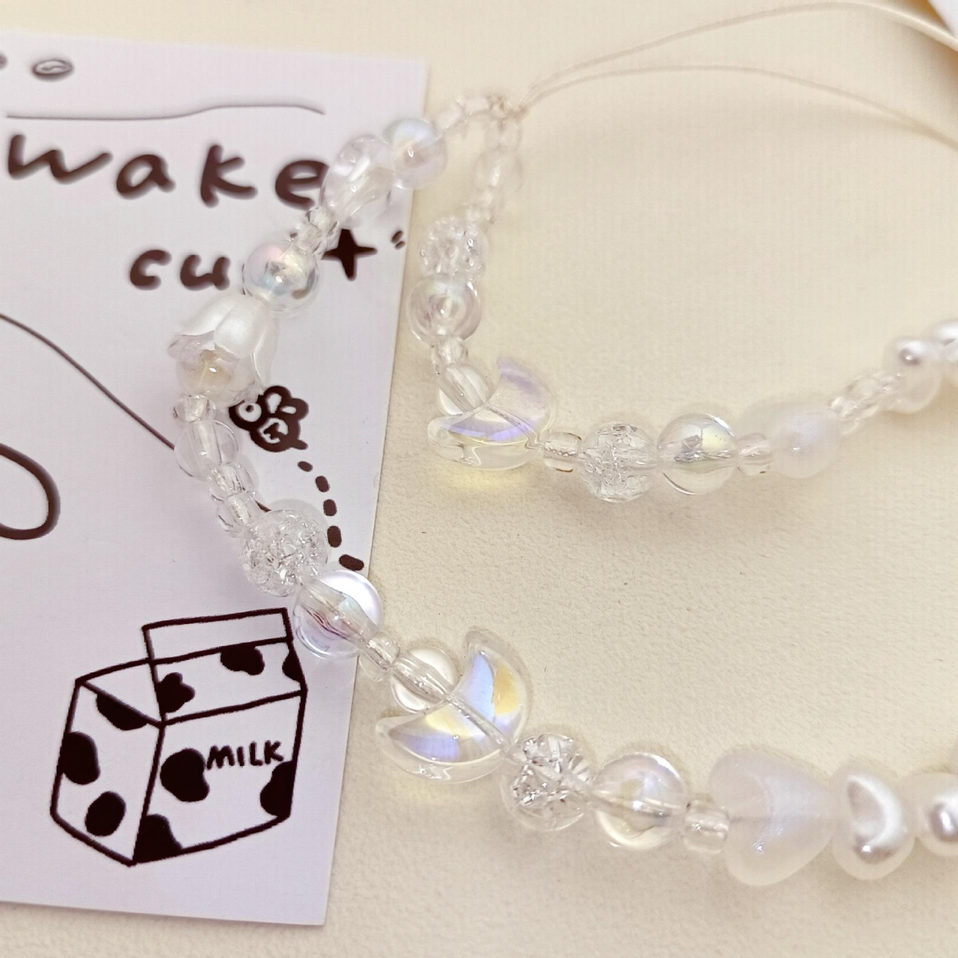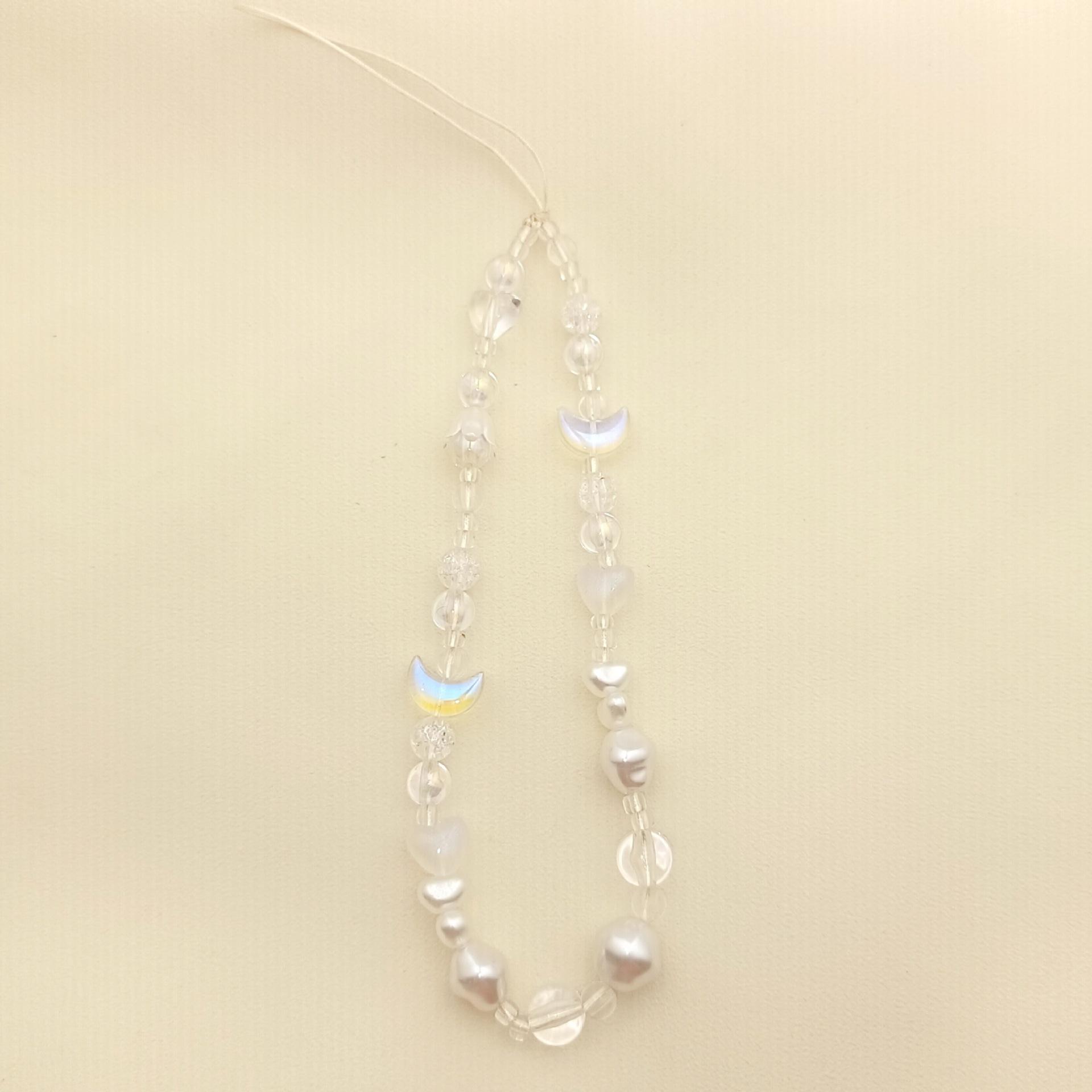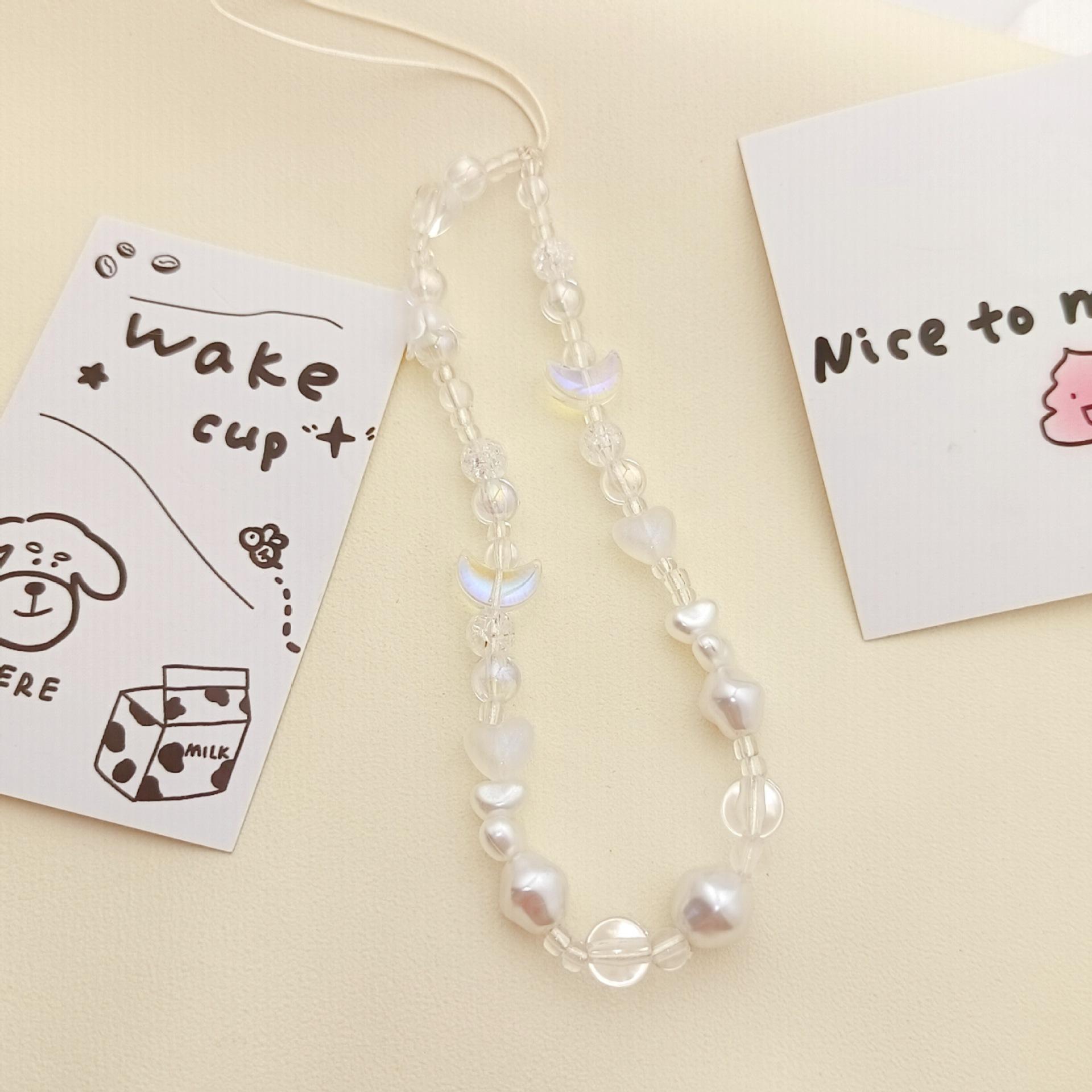 Nueva cadena para teléfono móvil hecha a mano con cuentas, colgante de cordón simple de media luna transparente blanca de alta gama