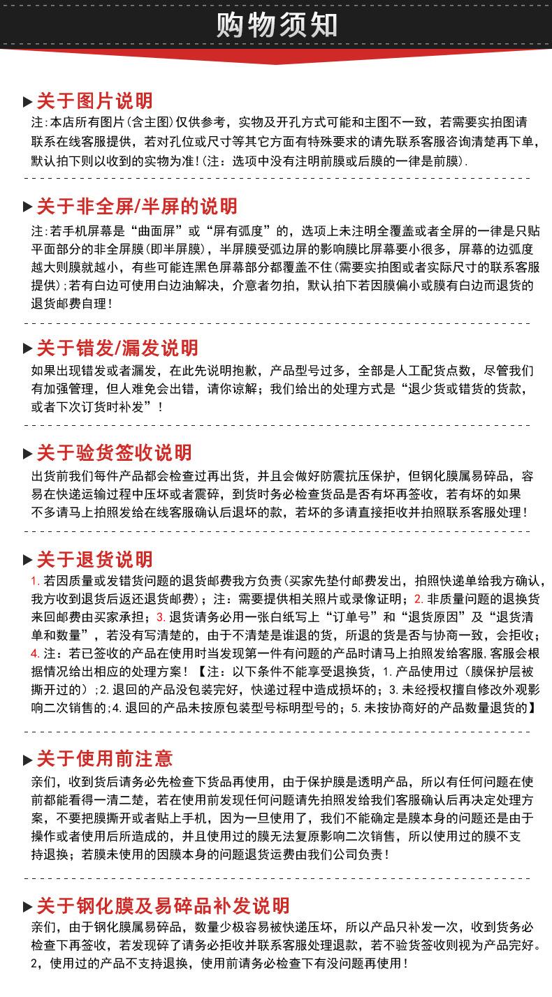 4. ¿El producto está completamente inspeccionado? 【respuesta】:Antes del envío, revisamos cada película para asegurarnos de que no esté dañada y proporcionamos protección amortiguadora y a prueba de presión. Sin embargo, la película templada es un producto frágil y puede ser fácilmente aplastada o rota por objetos pesados durante el transporte exprés. Por lo tanto, asegúrese de revisar la mercancía antes de recibirla.